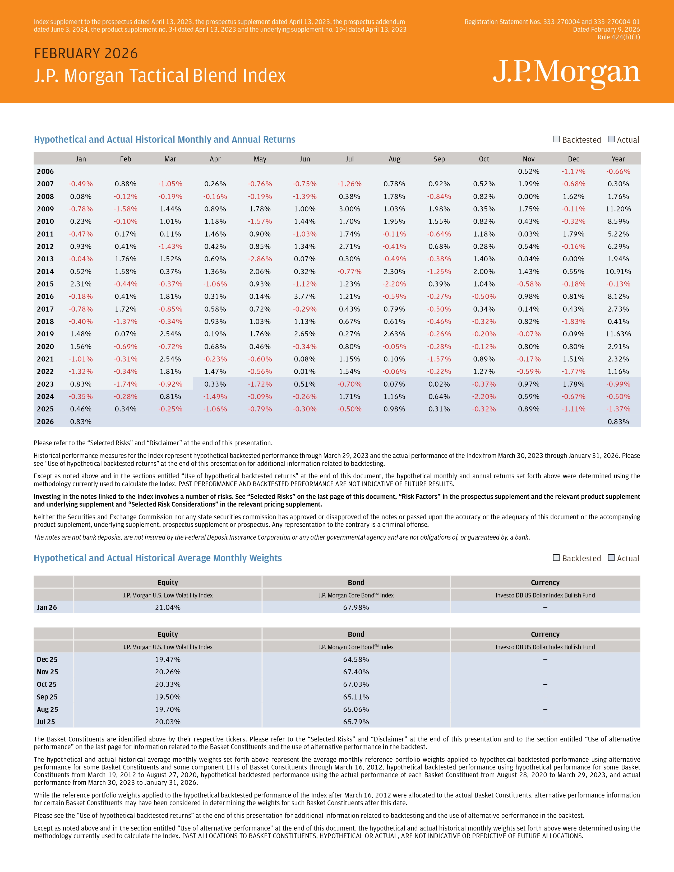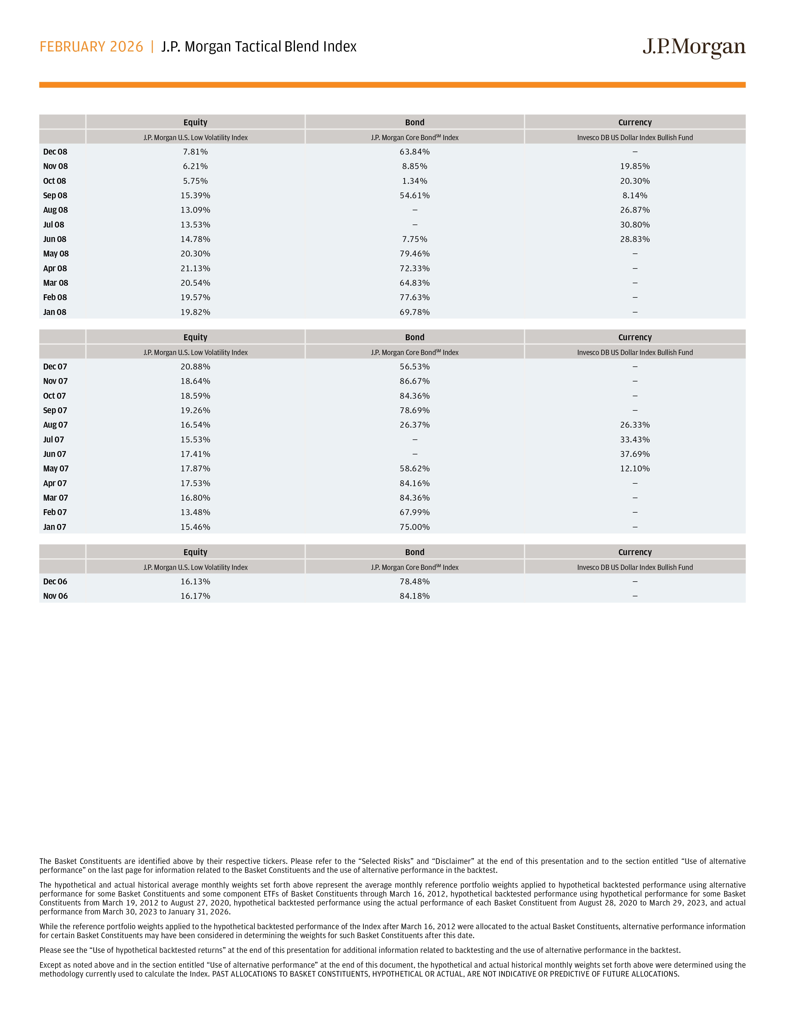 FEBRUARY 2026 | J.P. Morgan Tactical Blend Index The Basket Constituents are identified above by their respective tickers . Please refer to the “Selected Risks” and “Disclaimer” at the end of this presentation and to the section entitled “Use of alternative performance” on the last page for information related to the Basket Constituents and the use of alternative performance in the backtest . The hypothetical and actual historical average monthly weights set forth above represent the average monthly reference portfolio weights applied to hypothetical backtested performance using alternative performance for some Basket Constituents and some component ETFs of Basket Constituents through March 16 , 2012 , hypothetical backtested performance using hypothetical performance for some Basket Constituents from March 19 , 2012 to August 27 , 2020 , hypothetical backtested performance using the actual performance of each Basket Constituent from August 28 , 2020 to March 29 , 2023 , and actual performance from March 30 , 2023 to January 31 , 2026 . While the reference portfolio weights applied to the hypothetical backtested performance of the Index after March 16 , 2012 were allocated to the actual Basket Constituents, alternative performance information for certain Basket Constituents may have been considered in determining the weights for such Basket Constituents after this date . Please see the “Use of hypothetical backtested returns” at the end of this presentation for additional information related to backtesting and the use of alternative performance in the backtest . Except as noted above and in the section entitled “Use of alternative performance” at the end of this document, the hypothetical and actual historical monthly weights set forth above were determined using the methodology currently used to calculate the Index . PAST ALLOCATIONS TO BASKET CONSTITUENTS, HYPOTHETICAL OR ACTUAL, ARE NOT INDICATIVE OR PREDICTIVE OF FUTURE ALLOCATIONS . Currency Bond Equity Invesco DB US Dollar Index Bullish Fund J.P. Morgan Core Bond SM Index J.P. Morgan U.S. Low Volatility Index — 63.84% 7.81% Dec 08 19.85% 8.85% 6.21% Nov 08 20.30% 1.34% 5.75% Oct 08 8.14% 54.61% 15.39% Sep 08 26.87% — 13.09% Aug 08 30.80% — 13.53% Jul 08 28.83% 7.75% 14.78% Jun 08 — 79.46% 20.30% May 08 — 72.33% 21.13% Apr 08 — 64.83% 20.54% Mar 08 — 77.63% 19.57% Feb 08 — 69.78% 19.82% Jan 08 Currency Bond Equity Invesco DB US Dollar Index Bullish Fund J.P. Morgan Core Bond SM Index J.P. Morgan U.S. Low Volatility Index — 56.53% 20.88% Dec 07 — 86.67% 18.64% Nov 07 — 84.36% 18.59% Oct 07 — 78.69% 19.26% Sep 07 26.33% 26.37% 16.54% Aug 07 33.43% — 15.53% Jul 07 37.69% — 17.41% Jun 07 12.10% 58.62% 17.87% May 07 — 84.16% 17.53% Apr 07 — 84.36% 16.80% Mar 07 — 67.99% 13.48% Feb 07 — 75.00% 15.46% Jan 07 Currency Bond Equity Invesco DB US Dollar Index Bullish Fund J.P. Morgan Core Bond SM Index J.P. Morgan U.S. Low Volatility Index — 78.48% 16.13% Dec 06 — 84.18% 16.17% Nov 06