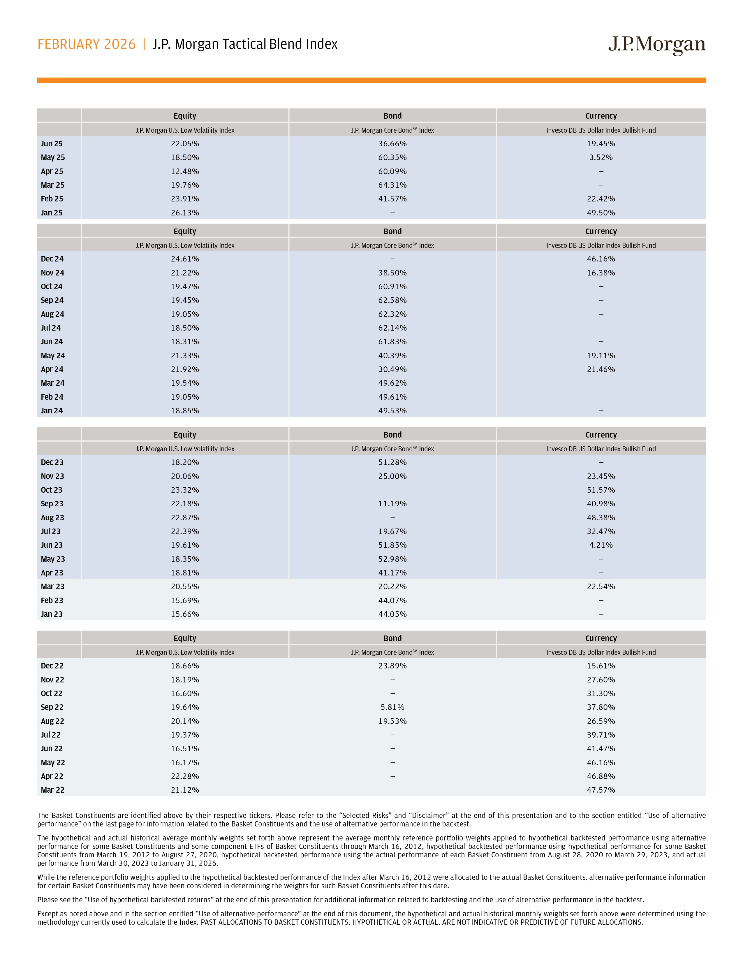 FEBRUARY 2026 | J.P. Morgan Tactical Blend Index The Basket Constituents are identified above by their respective tickers . Please refer to the “Selected Risks” and “Disclaimer” at the end of this presentation and to the section entitled “Use of alternative performance” on the last page for information related to the Basket Constituents and the use of alternative performance in the backtest . The hypothetical and actual historical average monthly weights set forth above represent the average monthly reference portfolio weights applied to hypothetical backtested performance using alternative performance for some Basket Constituents and some component ETFs of Basket Constituents through March 16 , 2012 , hypothetical backtested performance using hypothetical performance for some Basket Constituents from March 19 , 2012 to August 27 , 2020 , hypothetical backtested performance using the actual performance of each Basket Constituent from August 28 , 2020 to March 29 , 2023 , and actual performance from March 30 , 2023 to January 31 , 2026 . While the reference portfolio weights applied to the hypothetical backtested performance of the Index after March 16 , 2012 were allocated to the actual Basket Constituents, alternative performance information for certain Basket Constituents may have been considered in determining the weights for such Basket Constituents after this date . Please see the “Use of hypothetical backtested returns” at the end of this presentation for additional information related to backtesting and the use of alternative performance in the backtest . Except as noted above and in the section entitled “Use of alternative performance” at the end of this document, the hypothetical and actual historical monthly weights set forth above were determined using the methodology currently used to calculate the Index . PAST ALLOCATIONS TO BASKET CONSTITUENTS, HYPOTHETICAL OR ACTUAL, ARE NOT INDICATIVE OR PREDICTIVE OF FUTURE ALLOCATIONS . Currency Bond Equity Invesco DB US Dollar Index Bullish Fund J.P. Morgan Core Bond SM Index J.P. Morgan U.S. Low Volatility Index 19.45% 36.66% 22.05% Jun 25 3.52% 60.35% 18.50% May 25 — 60.09% 12.48% Apr 25 — 64.31% 19.76% Mar 25 22.42% 41.57% 23.91% Feb 25 49.50% — 26.13% Jan 25 Currency Bond Equity Invesco DB US Dollar Index Bullish Fund J.P. Morgan Core Bond SM Index J.P. Morgan U.S. Low Volatility Index 46.16% — 24.61% Dec 24 16.38% 38.50% 21.22% Nov 24 — 60.91% 19.47% Oct 24 — 62.58% 19.45% Sep 24 — 62.32% 19.05% Aug 24 — 62.14% 18.50% Jul 24 — 61.83% 18.31% Jun 24 19.11% 40.39% 21.33% May 24 21.46% 30.49% 21.92% Apr 24 — 49.62% 19.54% Mar 24 — 49.61% 19.05% Feb 24 — 49.53% 18.85% Jan 24 Currency Bond Equity Invesco DB US Dollar Index Bullish Fund J.P. Morgan Core Bond SM Index J.P. Morgan U.S. Low Volatility Index — 51.28% 18.20% Dec 23 23.45% 25.00% 20.06% Nov 23 51.57% — 23.32% Oct 23 40.98% 11.19% 22.18% Sep 23 48.38% — 22.87% Aug 23 32.47% 19.67% 22.39% Jul 23 4.21% 51.85% 19.61% Jun 23 — 52.98% 18.35% May 23 — 41.17% 18.81% Apr 23 22.54% 20.22% 20.55% Mar 23 — 44.07% 15.69% Feb 23 — 44.05% 15.66% Jan 23 Currency Bond Equity Invesco DB US Dollar Index Bullish Fund J.P. Morgan Core Bond SM Index J.P. Morgan U.S. Low Volatility Index 15.61% 23.89% 18.66% Dec 22 27.60% — 18.19% Nov 22 31.30% — 16.60% Oct 22 37.80% 5.81% 19.64% Sep 22 26.59% 19.53% 20.14% Aug 22 39.71% — 19.37% Jul 22 41.47% — 16.51% Jun 22 46.16% — 16.17% May 22 46.88% — 22.28% Apr 22 47.57% — 21.12% Mar 22