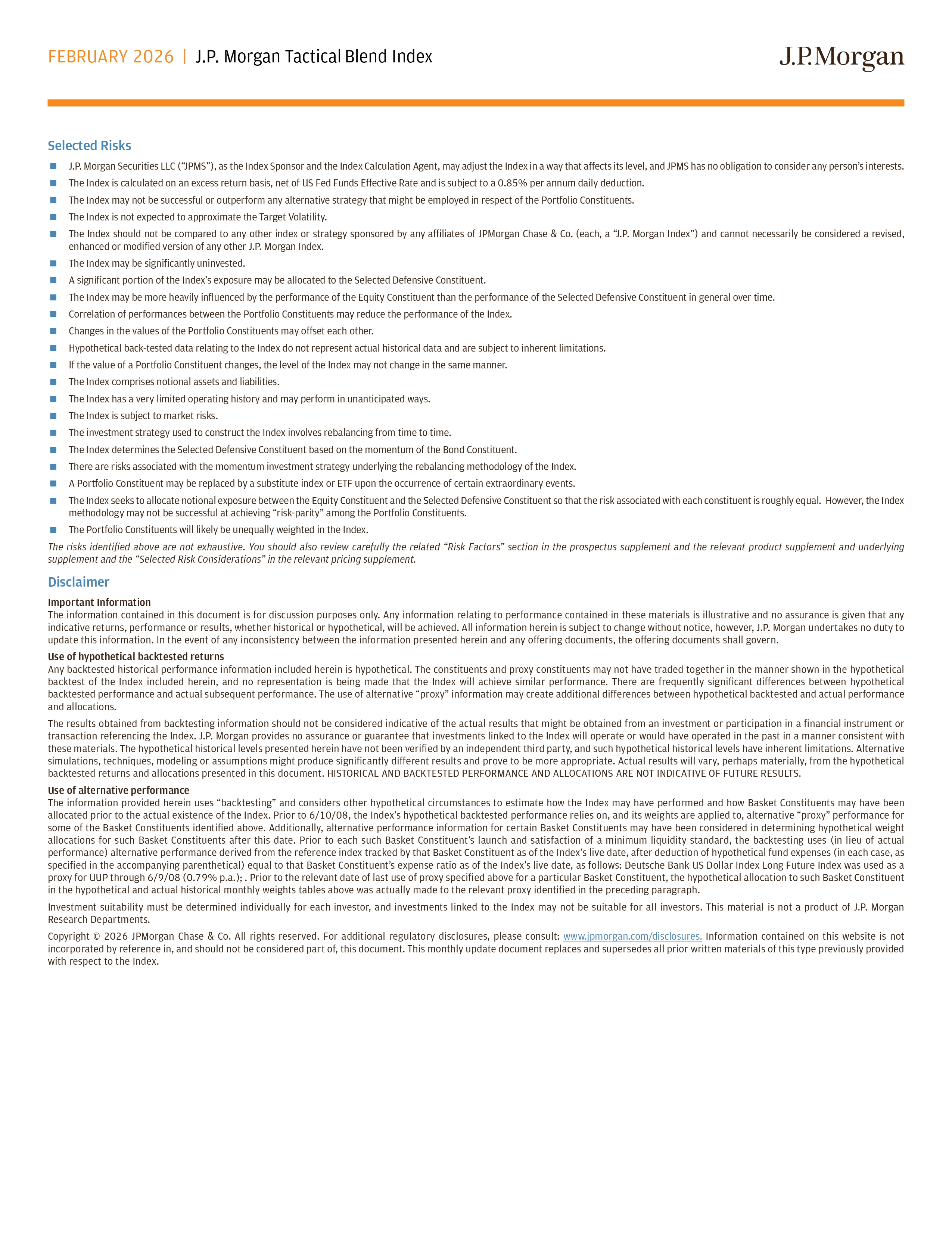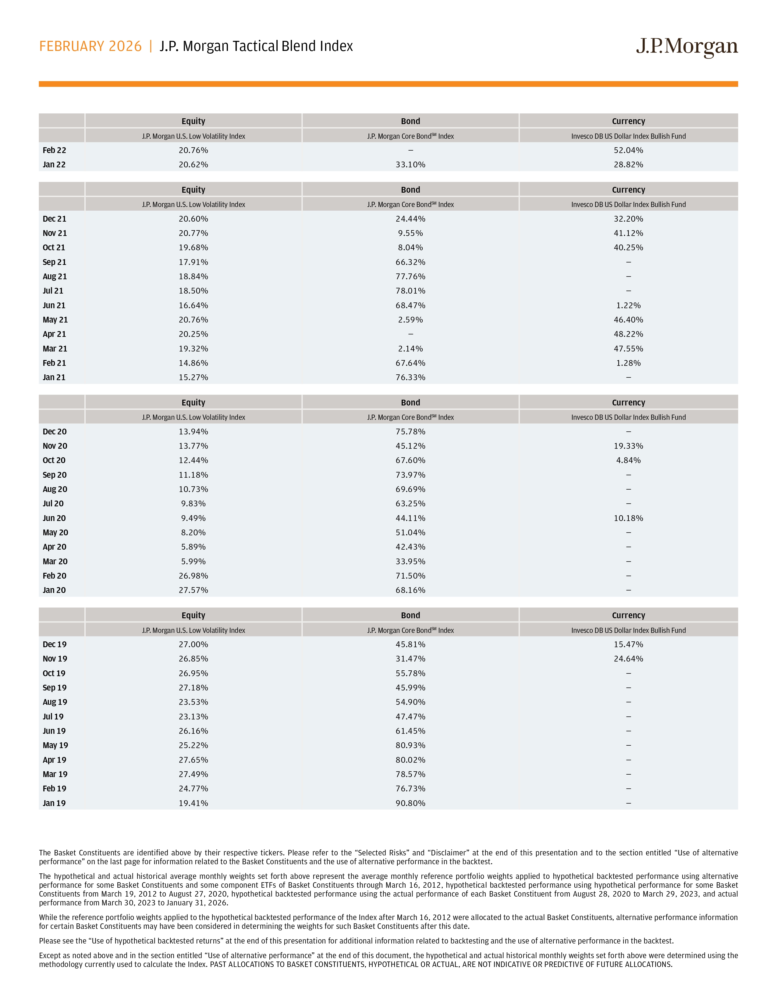 FEBRUARY 2026 | J.P. Morgan Tactical Blend Index The Basket Constituents are identified above by their respective tickers . Please refer to the “Selected Risks” and “Disclaimer” at the end of this presentation and to the section entitled “Use of alternative performance” on the last page for information related to the Basket Constituents and the use of alternative performance in the backtest . The hypothetical and actual historical average monthly weights set forth above represent the average monthly reference portfolio weights applied to hypothetical backtested performance using alternative performance for some Basket Constituents and some component ETFs of Basket Constituents through March 16 , 2012 , hypothetical backtested performance using hypothetical performance for some Basket Constituents from March 19 , 2012 to August 27 , 2020 , hypothetical backtested performance using the actual performance of each Basket Constituent from August 28 , 2020 to March 29 , 2023 , and actual performance from March 30 , 2023 to January 31 , 2026 . While the reference portfolio weights applied to the hypothetical backtested performance of the Index after March 16 , 2012 were allocated to the actual Basket Constituents, alternative performance information for certain Basket Constituents may have been considered in determining the weights for such Basket Constituents after this date . Please see the “Use of hypothetical backtested returns” at the end of this presentation for additional information related to backtesting and the use of alternative performance in the backtest . Except as noted above and in the section entitled “Use of alternative performance” at the end of this document, the hypothetical and actual historical monthly weights set forth above were determined using the methodology currently used to calculate the Index . PAST ALLOCATIONS TO BASKET CONSTITUENTS, HYPOTHETICAL OR ACTUAL, ARE NOT INDICATIVE OR PREDICTIVE OF FUTURE ALLOCATIONS . Currency Bond Equity Invesco DB US Dollar Index Bullish Fund J.P. Morgan Core Bond SM Index J.P. Morgan U.S. Low Volatility Index 52.04% — 20.76% Feb 22 28.82% 33.10% 20.62% Jan 22 Currency Bond Equity Invesco DB US Dollar Index Bullish Fund J.P. Morgan Core Bond SM Index J.P. Morgan U.S. Low Volatility Index 32.20% 24.44% 20.60% Dec 21 41.12% 9.55% 20.77% Nov 21 40.25% 8.04% 19.68% Oct 21 — 66.32% 17.91% Sep 21 — 77.76% 18.84% Aug 21 — 78.01% 18.50% Jul 21 1.22% 68.47% 16.64% Jun 21 46.40% 2.59% 20.76% May 21 48.22% — 20.25% Apr 21 47.55% 2.14% 19.32% Mar 21 1.28% 67.64% 14.86% Feb 21 — 76.33% 15.27% Jan 21 Currency Bond Equity Invesco DB US Dollar Index Bullish Fund J.P. Morgan Core Bond SM Index J.P. Morgan U.S. Low Volatility Index — 75.78% 13.94% Dec 20 19.33% 45.12% 13.77% Nov 20 4.84% 67.60% 12.44% Oct 20 — 73.97% 11.18% Sep 20 — 69.69% 10.73% Aug 20 — 63.25% 9.83% Jul 20 10.18% 44.11% 9.49% Jun 20 — 51.04% 8.20% May 20 — 42.43% 5.89% Apr 20 — 33.95% 5.99% Mar 20 — 71.50% 26.98% Feb 20 — 68.16% 27.57% Jan 20 Currency Bond Equity Invesco DB US Dollar Index Bullish Fund J.P. Morgan Core Bond SM Index J.P. Morgan U.S. Low Volatility Index 15.47% 45.81% 27.00% Dec 19 24.64% 31.47% 26.85% Nov 19 — 55.78% 26.95% Oct 19 — 45.99% 27.18% Sep 19 — 54.90% 23.53% Aug 19 — 47.47% 23.13% Jul 19 — 61.45% 26.16% Jun 19 — 80.93% 25.22% May 19 — 80.02% 27.65% Apr 19 — 78.57% 27.49% Mar 19 — 76.73% 24.77% Feb 19 — 90.80% 19.41% Jan 19
