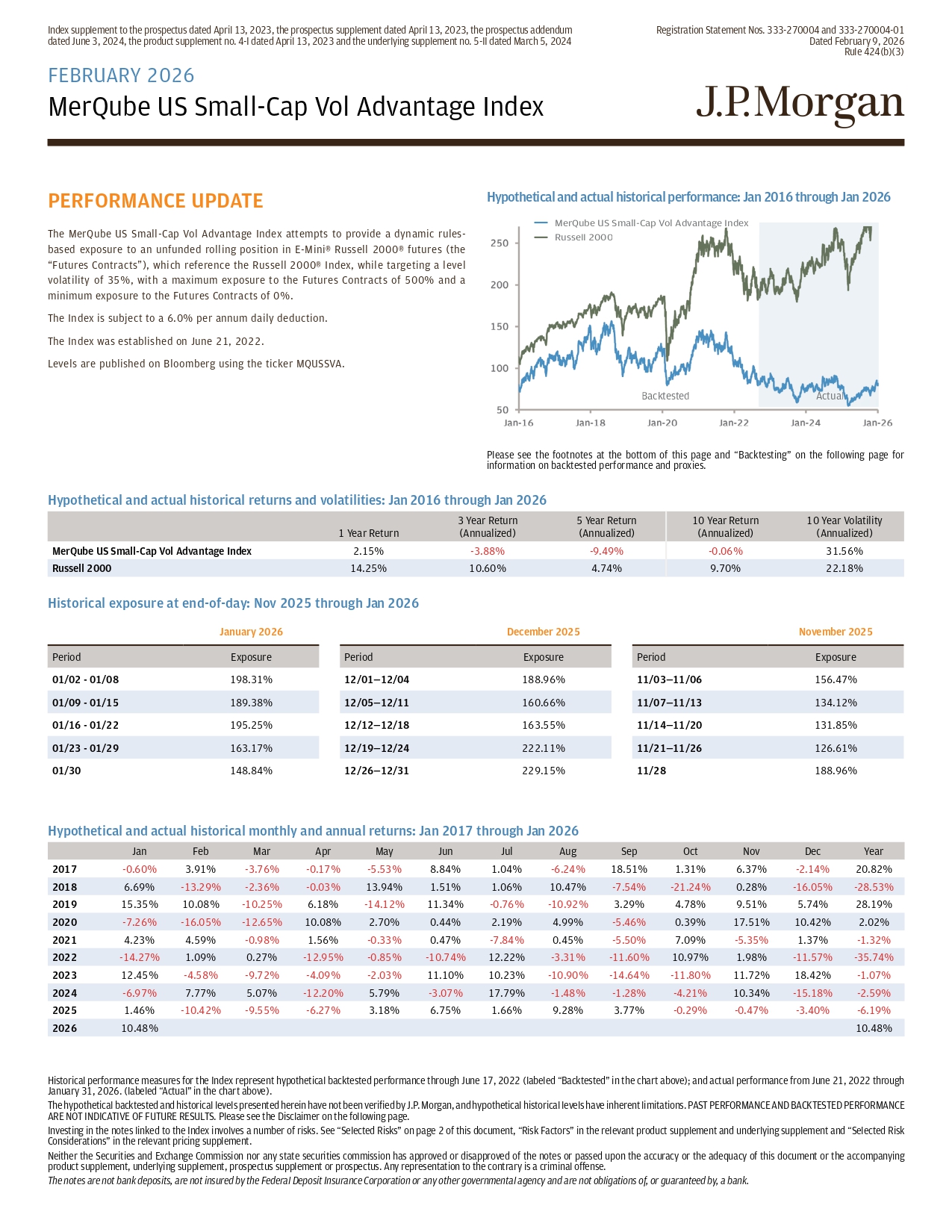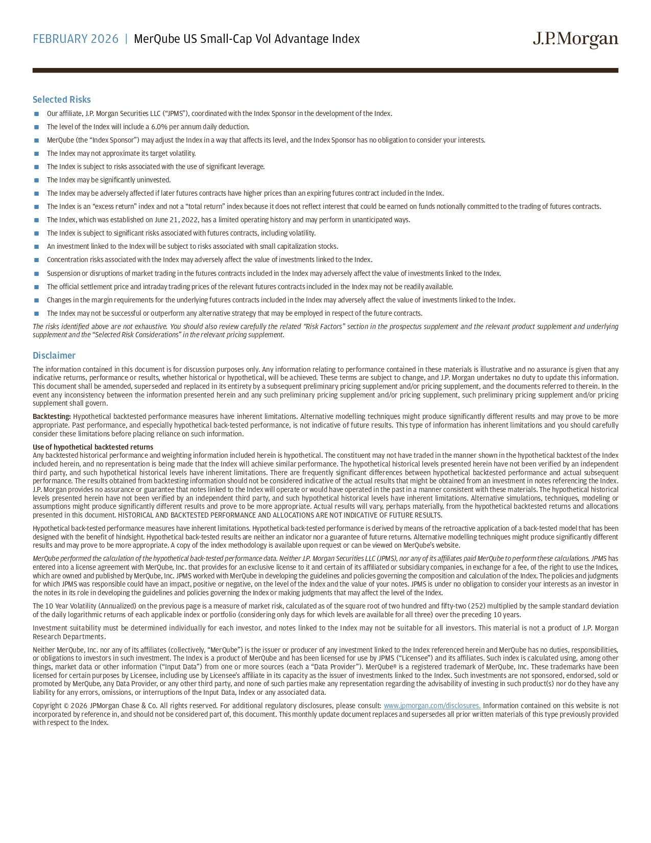 FEBRUARY 2026 | MerQube US Small - Cap Vol Advantage Index Selected Risks Our affiliate, J.P. Morgan Securities LLC (“JPMS”), coordinated with the Index Sponsor in the development of the Index. The level of the Index will include a 6.0% per annum daily deduction. MerQube (the “Index Sponsor”) may adjust the Index in a way that atfects its level, and the Index Sponsor has no obligation to consider your interests. The Index may not approximate its target volatility. The Index is subject to risks associated with the use of significant leverage. The Index may be significantly uninvested. The Index may be adversely atfected if later futures contracts have higher prices than an expiring futures contract included in the Index. The Index is an “excess return” index and not a “total return” index because it does not reflect interest that could be earned on funds notionally committed to the trading of futures contracts. The Index, which was established on June 21, 2022, has a limited operating history and may perform in unanticipated ways. The Index is subject to significant risks associated with futures contracts, including volatility. An investment linked to the Index will be subject to risks associated with small capitalization stocks. Concentration risks associated with the Index may adversely atfect the value of investments linked to the Index. Suspension or disruptions of market trading in the futures contracts included in the Index may adversely atfect the value of investments linked to the Index. The official settlement price and intraday trading prices of the relevant futures contracts included in the Index may not be readily available. Changes in the margin requirements for the underlying futures contracts included in the Index may adversely atfect the value of investments linked to the Index. The Index may not be successful or outperform any alternative strategy that may be employed in respect of the future contracts. The risks identified above are not exhaustive. You should also review carefully the related “Risk Factors” section in the prospectus supplement and the relevant product supplement and underlying supplement and the “Selected Risk Considerations” in the relevant pricing supplement. Disclaimer The information contained in this document is for discussion purposes only . Any information relating to performance contained in these materials is illustrative and no assurance is given that any indicative returns, performance or results, whether historical or hypothetical, will be achieved . These terms are subject to change, and J . P . Morgan undertakes no duty to update this information . This document shall be amended, superseded and replaced in its entirety by a subsequent preliminary pricing supplement and/or pricing supplement, and the documents referred to therein . In the event any inconsistency between the information presented herein and any such preliminary pricing supplement and/or pricing supplement, such preliminary pricing supplement and/or pricing supplement shall govern . Backtesting : Hypothetical backtested performance measures have inherent limitations . Alternative modelling techniques might produce significantly ditferent results and may prove to be more appropriate . Past performance, and especially hypothetical back - tested performance, is not indicative of future results . This type of information has inherent limitations and you should carefully consider these limitations before placing reliance on such information . Use of hypothetical backtested returns Any backtested historical performance and weighting information included herein is hypothetical . The constituent may not have traded in the manner shown in the hypothetical backtest of the Index included herein, and no representation is being made that the Index will achieve similar performance . The hypothetical historical levels presented herein have not been verified by an independent third party, and such hypothetical historical levels have inherent limitations . There are frequently significant ditferences between hypothetical backtested performance and actual subsequent performance . The results obtained from backtesting information should not be considered indicative of the actual results that might be obtained from an investment in notes referencing the Index . J . P . Morgan provides no assurance or guarantee that notes linked to the Index will operate or would have operated in the past in a manner consistent with these materials . The hypothetical historical levels presented herein have not been verified by an independent third party, and such hypothetical historical levels have inherent limitations . Alternative simulations, techniques, modeling or assumptions might produce significantly ditferent results and prove to be more appropriate . Actual results will vary, perhaps materially, from the hypothetical backtested returns and allocations presented in this document . HISTORICAL AND BACKTESTED PERFORMANCE AND ALLOCATIONS ARE NOT INDICATIVE OF FUTURE RESULTS . Hypothetical back - tested performance measures have inherent limitations . Hypothetical back - tested performance is derived by means of the retroactive application of a back - tested model that has been designed with the benefit of hindsight . Hypothetical back - tested results are neither an indicator nor a guarantee of future returns . Alternative modelling techniques might produce significantly ditferent results and may prove to be more appropriate . A copy of the index methodology is available upon request or can be viewed on MerQube’s website . MerQube performed the calculation of the hypothetical back - tested performance data . Neither J . P . Morgan Securities LLC (JPMS), nor any of its affiliates paid MerQube to perform these calculations . JPMS has entered into a license agreement with MerQube, Inc . that provides for an exclusive license to it and certain of its affiliated or subsidiary companies, i