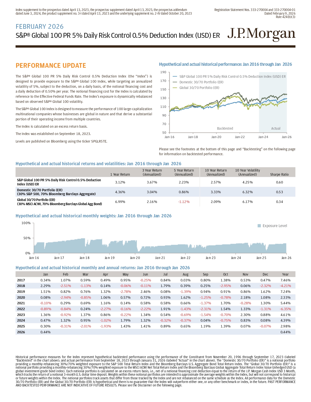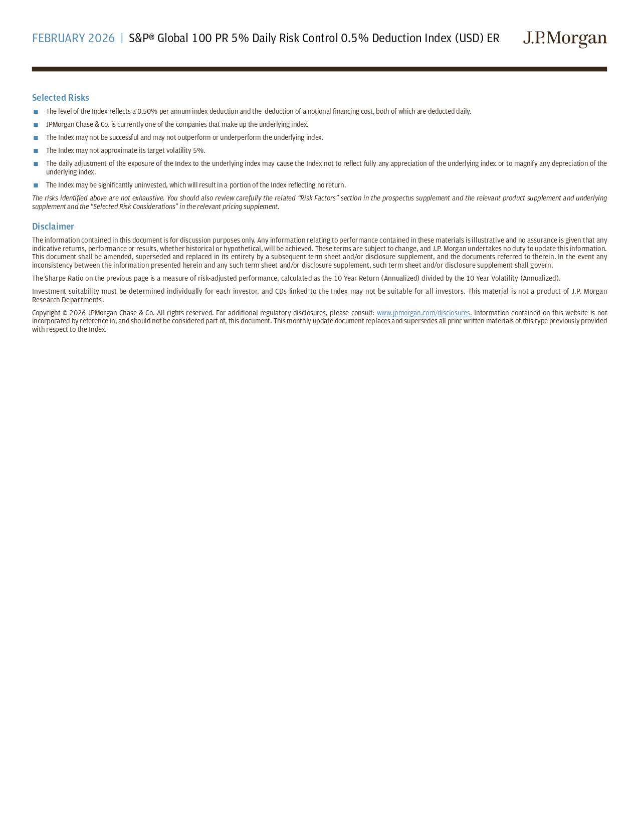FEBRUARY 2026 | S&P® Global 100 PR 5% Daily Risk Control 0.5% Deduction Index (USD) ER Selected Risks The level of the Index reflects a 0.50% per annum index deduction and the deduction of a notional financing cost, both of which are deducted daily. JPMorgan Chase & Co. is currently one of the companies that make up the underlying index. The Index may not be successful and may not outperform or underperform the underlying index. The Index may not approximate its target volatility 5%. The daily adjustment of the exposure of the Index to the underlying index may cause the Index not to reflect fully any appreciation of the underlying index or to magnify any depreciation of the underlying index. The Index may be significantly uninvested, which will result in a portion of the Index reflecting no return. The risks identified above are not exhaustive. You should also review carefully the related “Risk Factors” section in the prospectus supplement and the relevant product supplement and underlying supplement and the “Selected Risk Considerations” in the relevant pricing supplement. Disclaimer The information contained in this document is for discussion purposes only . Any information relating to performance contained in these materials is illustrative and no assurance is given that any indicative returns, performance or results, whether historical or hypothetical, will be achieved . These terms are subject to change, and J . P . Morgan undertakes no duty to update this information . This document shall be amended, superseded and replaced in its entirety by a subsequent term sheet and/or disclosure supplement, and the documents referred to therein . In the event any inconsistency between the information presented herein and any such term sheet and/or disclosure supplement, such term sheet and/or disclosure supplement shall govern . The Sharpe Ratio on the previous page is a measure of risk - adjusted performance, calculated as the 10 Year Return (Annualized) divided by the 10 Year Volatility (Annualized) . Investment suitability must be determined individually for each investor, and CDs linked to the Index may not be suitable for all investors . This material is not a product of J . P . Morgan Research Departments . Copyright © 2026 JPMorgan Chase & Co . All rights reserved . For additional regulatory disclosures, please consult : www . jpmorgan . com/disclosures . Information contained on this website is not incorporated by reference in, and should not be considered part of, this document . This monthly update document replaces and supersedes all prior written materials of this type previously provided with respect to the Index .