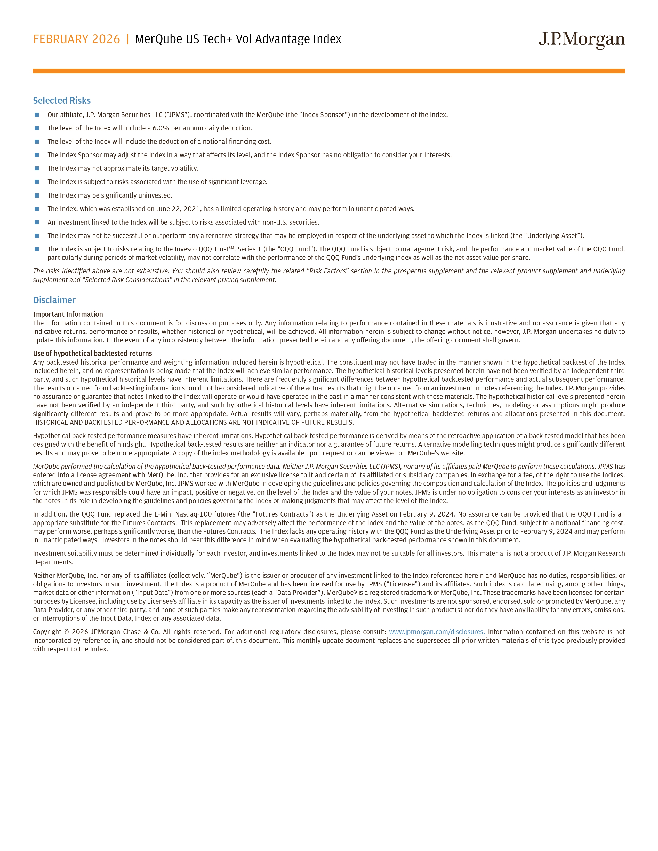 FEBRUARY 2026 | MerQube US Tech+ Vol Advantage Index Selected Risks Our affiliate, J.P. Morgan Securities LLC (“JPMS”), coordinated with the MerQube (the “Index Sponsor”) in the development of the Index. The level of the Index will include a 6.0% per annum daily deduction. The level of the Index will include the deduction of a notional financing cost. The Index Sponsor may adjust the Index in a way that atfects its level, and the Index Sponsor has no obligation to consider your interests. The Index may not approximate its target volatility. The Index is subject to risks associated with the use of significant leverage. The Index may be significantly uninvested. The Index, which was established on June 22, 2021, has a limited operating history and may perform in unanticipated ways. An investment linked to the Index will be subject to risks associated with non - U.S. securities. The Index may not be successful or outperform any alternative strategy that may be employed in respect of the underlying asset to which the Index is linked (the “Underlying Asset”). The Index is subject to risks relating to the Invesco QQQ Trust SM , Series 1 (the “QQQ Fund”). The QQQ Fund is subject to management risk, and the performance and market value of the QQQ Fund, particularly during periods of market volatility, may not correlate with the performance of the QQQ Fund’s underlying index as well as the net asset value per share. The risks identified above are not exhaustive. You should also review carefully the related “Risk Factors” section in the prospectus supplement and the relevant product supplement and underlying supplement and “Selected Risk Considerations” in the relevant pricing supplement. Disclaimer Important Information The information contained in this document is for discussion purposes only . Any information relating to performance contained in these materials is illustrative and no assurance is given that any indicative returns, performance or results, whether historical or hypothetical, will be achieved . All information herein is subject to change without notice, however, J . P . Morgan undertakes no duty to update this information . In the event of any inconsistency between the information presented herein and any otfering document, the otfering document shall govern . Use of hypothetical backtested returns Any backtested historical performance and weighting information included herein is hypothetical . The constituent may not have traded in the manner shown in the hypothetical backtest of the Index included herein, and no representation is being made that the Index will achieve similar performance . The hypothetical historical levels presented herein have not been verified by an independent third party, and such hypothetical historical levels have inherent limitations . There are frequently significant ditferences between hypothetical backtested performance and actual subsequent performance . The results obtained from backtesting information should not be considered indicative of the actual results that might be obtained from an investment in notes referencing the Index . J . P . Morgan provides no assurance or guarantee that notes linked to the Index will operate or would have operated in the past in a manner consistent with these materials . The hypothetical historical levels presented herein have not been verified by an independent third party, and such hypothetical historical levels have inherent limitations . Alternative simulations, techniques, modeling or assumptions might produce significantly ditferent results and prove to be more appropriate . Actual results will vary, perhaps materially, from the hypothetical backtested returns and allocations presented in this document . HISTORICAL AND BACKTESTED PERFORMANCE AND ALLOCATIONS ARE NOT INDICATIVE OF FUTURE RESULTS . Hypothetical back - tested performance measures have inherent limitations . Hypothetical back - tested performance is derived by means of the retroactive application of a back - tested model that has been designed with the benefit of hindsight . Hypothetical back - tested results are neither an indicator nor a guarantee of future returns . Alternative modelling techniques might produce significantly ditferent results and may prove to be more appropriate . A copy of the index methodology is available upon request or can be viewed on MerQube’s website . MerQube performed the calculation of the hypothetical back - tested performance data . Neither J . P . Morgan Securities LLC (JPMS), nor any of its affiliates paid MerQube to perform these calculations . JPMS has entered into a license agreement with MerQube, Inc . that provides for an exclusive license to it and certain of its affiliated or subsidiary companies, in exchange for a fee, of the right to use the Indices, which are owned and published by MerQube, Inc . JPMS worked with MerQube in developing the guidelines and policies governing the composition and calculation of the Index . The policies and judgments for which JPMS was responsible could have an impact, positive or negative, on the level of the Index and the value of your notes . JPMS is under no obligation to consider your interests as an investor in the notes in its role in developing the guidelines and policies governing the Index or making judgments that may atfect the level of the Index . In addition, the QQQ Fund replaced the E - Mini Nasdaq - 100 futures (the “Futures Contracts”) as the Underlying Asset on February 9 , 2024 . No assurance can be provided that the QQQ Fund is an appropriate substitute for the Futures Contracts . This replacement may adversely atfect the performance of the Index and the value of the notes, as the QQQ Fund, subject to a notional financing cost, may perform worse, perhaps significantly worse, than the Futures Contracts . The Index lacks any operating history with the QQQ Fund as the Underlying Asset prior to February 9 , 2024 and may perform 