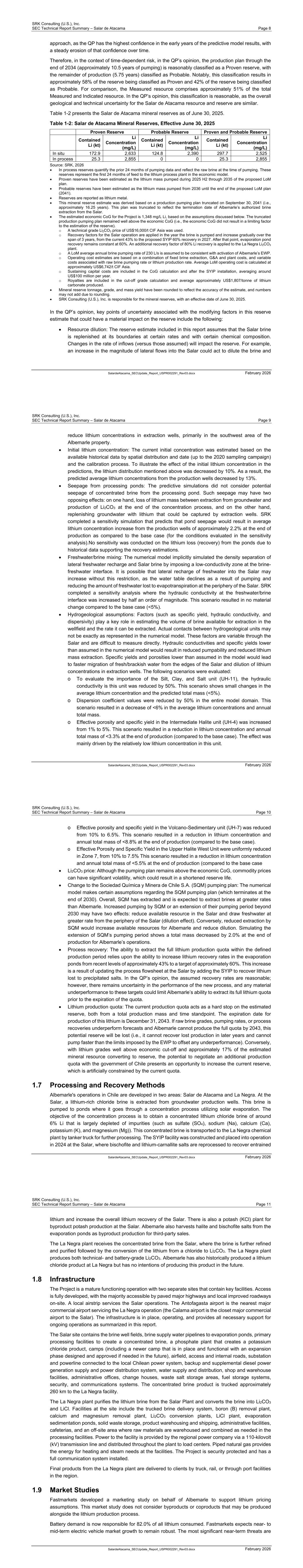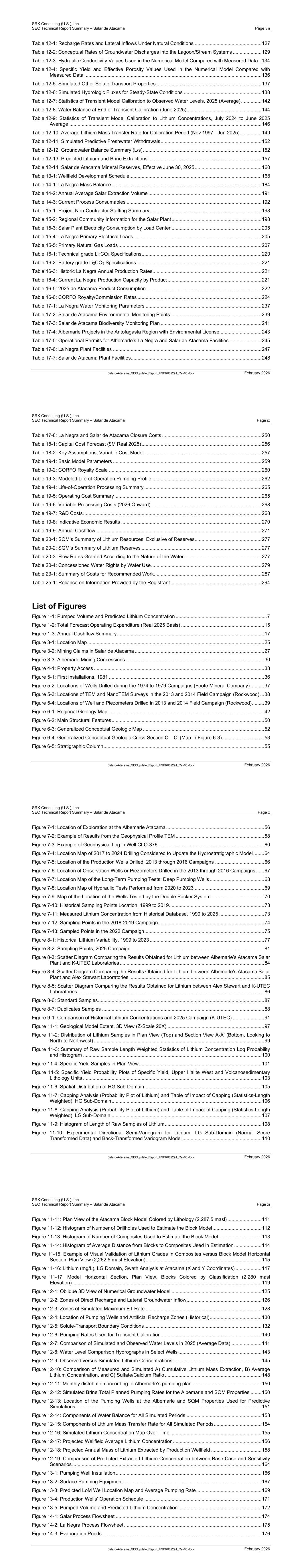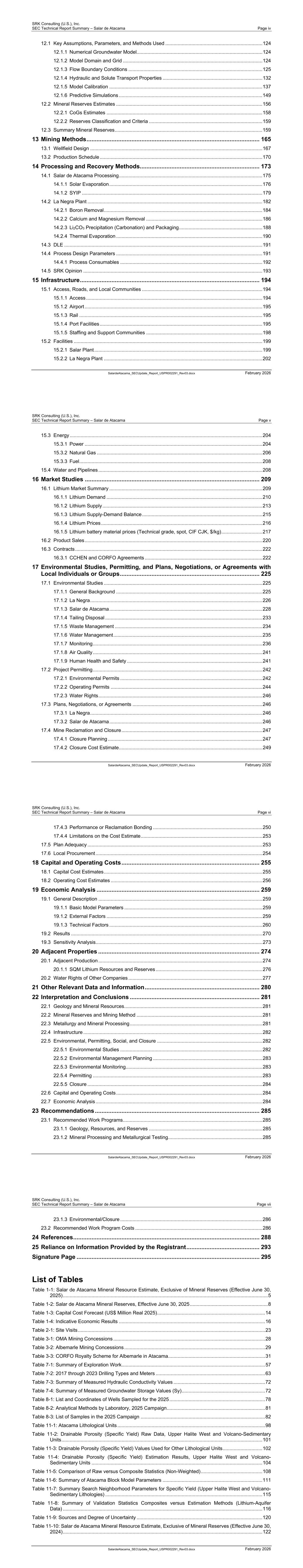 SRK Consulting (U.S.), Inc. SEC Technical Report Summary – Salar de Atacama Page iv SalardeAtacama_SECUpdate_Report_USPR002291_Rev03.docx February 2026 12.1 Key Assumptions, Parameters, and Methods Used ....................................................................... 124 12.1.1 Numerical Groundwater Model............................................................................................ 124 12.1.2 Model Domain and Grid ...................................................................................................... 124 12.1.3 Flow Boundary Conditions .................................................................................................. 125 12.1.4 Hydraulic and Solute Transport Properties ......................................................................... 132 12.1.5 Model Calibration ................................................................................................................ 137 12.1.6 Predictive Simulations ......................................................................................................... 149 12.2 Mineral Reserves Estimates ........................................................................................................... 156 12.2.1 CoGs Estimates .................................................................................................................. 158 12.2.2 Reserves Classification and Criteria ................................................................................... 159 12.3 Summary Mineral Reserves ............................................................................................................ 159 13 Mining Methods ........................................................................................................ 165 13.1 Wellfield Design .............................................................................................................................. 167 13.2 Production Schedule ....................................................................................................................... 170 14 Processing and Recovery Methods........................................................................ 173 14.1 Salar de Atacama Processing ......................................................................................................... 175 14.1.1 Solar Evaporation ................................................................................................................ 176 14.1.2 SYIP .................................................................................................................................... 179 14.2 La Negra Plant ................................................................................................................................ 182 14.2.1 Boron Removal .................................................................................................................... 184 14.2.2 Calcium and Magnesium Removal ..................................................................................... 186 14.2.3 Li2CO3 Precipitation (Carbonation) and Packaging ............................................................. 188 14.2.4 Thermal Evaporation ........................................................................................................... 190 14.3 DLE ................................................................................................................................................. 191 14.4 Process Design Parameters ........................................................................................................... 191 14.4.1 Process Consumables ........................................................................................................ 192 14.5 SRK Opinion ................................................................................................................................... 193 15 Infrastructure ............................................................................................................ 194 15.1 Access, Roads, and Local Communities ........................................................................................ 194 15.1.1 Access ................................................................................................................................. 194 15.1.2 Airport .................................................................................................................................. 195 15.1.3 Rail ...................................................................................................................................... 195 15.1.4 Port Facilities ....................................................................................................................... 195 15.1.5 Staffing and Support Communities ..................................................................................... 198 15.2 Facilities .......................................................................................................................................... 199 15.2.1 Salar Plant ........................................................................................................................... 199 15.2.2 La Negra Plant .................................................................................................................... 202 SRK Consulting (U.S.), Inc. SEC Technical Report Summary – Salar de Atacama Page v SalardeAtacama_SECUpdate_Report_USPR002291_Rev03.docx February 2026 15.3 Energy ............................................................................................................................................. 204 15.3.1 Power .................................................................................................................................. 204 15.3.2 Natural Gas ......................................................................................................................... 206 15.3.3 Fuel ...........................................
