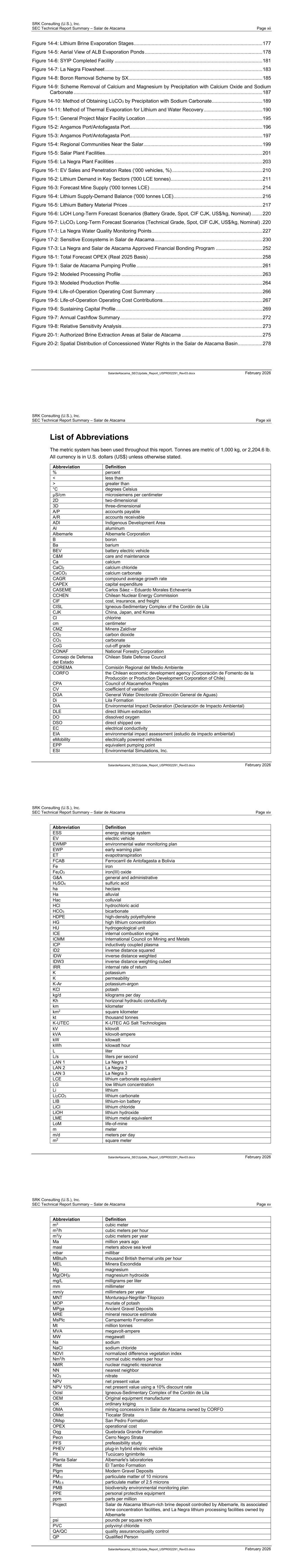 SRK Consulting (U.S.), Inc. SEC Technical Report Summary – Salar de Atacama Page xii SalardeAtacama_SECUpdate_Report_USPR002291_Rev03.docx February 2026 Figure 14-4: Lithium Brine Evaporation Stages .............................................................................................. 177 Figure 14-5: Aerial View of ALB Evaporation Ponds ...................................................................................... 178 Figure 14-6: SYIP Completed Facility ............................................................................................................ 181 Figure 14-7: La Negra Flowsheet ................................................................................................................... 183 Figure 14-8: Boron Removal Scheme by SX .................................................................................................. 185 Figure 14-9: Scheme Removal of Calcium and Magnesium by Precipitation with Calcium Oxide and Sodium Carbonate .......................................................................................................................................... 187 Figure 14-10: Method of Obtaining Li2CO3 by Precipitation with Sodium Carbonate ..................................... 189 Figure 14-11: Method of Thermal Evaporation for Lithium and Water Recovery ........................................... 190 Figure 15-1: General Project Major Facility Location ..................................................................................... 195 Figure 15-2: Angamos Port/Antofagasta Port ................................................................................................. 196 Figure 15-3: Angamos Port/Antofagasta Port ................................................................................................. 197 Figure 15-4: Regional Communities Near the Salar ....................................................................................... 199 Figure 15-5: Salar Plant Facilities ................................................................................................................... 201 Figure 15-6: La Negra Plant Facilities ............................................................................................................ 203 Figure 16-1: EV Sales and Penetration Rates (‘000 vehicles, %) .................................................................. 210 Figure 16-2: Lithium Demand in Key Sectors ('000 LCE tonnes) ................................................................... 211 Figure 16-3: Forecast Mine Supply ('000 tonnes LCE) .................................................................................. 214 Figure 16-4: Lithium Supply-Demand Balance ('000 tonnes LCE) ................................................................. 216 Figure 16-5: Lithium Battery Material Prices .................................................................................................. 217 Figure 16-6: LiOH Long-Term Forecast Scenarios (Battery Grade, Spot, CIF CJK, US$/kg, Nominal) ........ 220 Figure 16-7: Li2CO3 Long-Term Forecast Scenarios (Technical Grade, Spot, CIF CJK, US$/kg, Nominal) . 220 Figure 17-1: La Negra Water Quality Monitoring Points ................................................................................. 227 Figure 17-2: Sensitive Ecosystems in Salar de Atacama ............................................................................... 230 Figure 17-3: La Negra and Salar de Atacama Approved Financial Bonding Program .................................. 252 Figure 18-1: Total Forecast OPEX (Real 2025 Basis) ................................................................................... 258 Figure 19-1: Salar de Atacama Pumping Profile ............................................................................................ 261 Figure 19-2: Modeled Processing Profile ....................................................................................................... 263 Figure 19-3: Modeled Production Profile ........................................................................................................ 264 Figure 19-4: Life-of-Operation Operating Cost Summary .............................................................................. 266 Figure 19-5: Life-of-Operation Operating Cost Contributions ......................................................................... 267 Figure 19-6: Sustaining Capital Profile ........................................................................................................... 269 Figure 19-7: Annual Cashflow Summary ........................................................................................................ 272 Figure 19-8: Relative Sensitivity Analysis ....................................................................................................... 273 Figure 20-1: Authorized Brine Extraction Areas at Salar de Atacama ........................................................... 275 Figure 20-2: Spatial Distribution of Concessioned Water Rights in the Salar de Atacama Basin .................. 278 SRK Consulting (U.S.), Inc. SEC Technical Report Summary – Salar de Atacama Page xiii SalardeAtacama_SECUpdate_Report_USPR002291_Rev03.docx February 2026 List of Abbreviations The metric system has been used throughout this report. Tonnes are metric of 1,000 kg, or 2,204.6 lb. All currency is in U.S. dollars (US$) unless otherwise stated. Abbreviation Definition % percent < less than > greater than °C degrees Celsius µS/cm microsiemens per centimeter 2D two-dimensional 3D three-dimensional A/P accounts payable A/R accounts receivable ADI Indigenous Development Area Al aluminum Albemarle Albemarle Corporation B boron Ba barium BEV battery electric vehicle C&M care and maintenance Ca calcium CaCl2 calcium chloride CaCO3 calcium carbonate CAGR compound average growth rate CAPEX capital expenditure CASEME Carlos Sáez – Eduardo Morales Echeverría CCHEN Chilean Nuclear Energ
