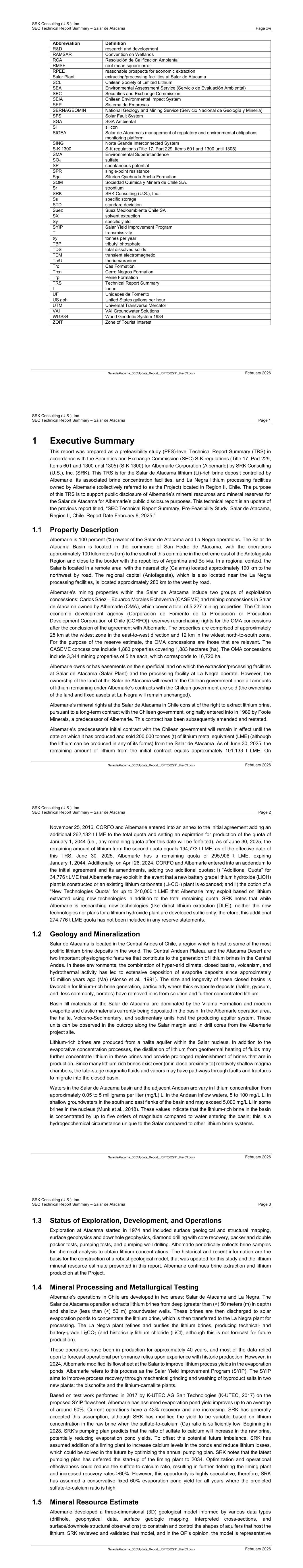 SRK Consulting (U.S.), Inc. SEC Technical Report Summary – Salar de Atacama Page xvi SalardeAtacama_SECUpdate_Report_USPR002291_Rev03.docx February 2026 Abbreviation Definition R&D research and development RAMSAR Convention on Wetlands RCA Resolución de Calificación Ambiental RMSE root mean square error RPEE reasonable prospects for economic extraction Salar Plant extracting/processing facilities at Salar de Atacama SCL Chilean Society of Limited Lithium SEA Environmental Assessment Service (Servicio de Evaluación Ambiental) SEC Securities and Exchange Commission SEIA Chilean Environmental Impact System SEP Sistema de Empresas SERNAGEOMIN National Geology and Mining Service (Servicio Nacional de Geología y Minería) SFS Solar Fault System SGA SGA Ambiental Si silicon SIGEA Salar de Atacama's management of regulatory and environmental obligations monitoring platform SING Norte Grande Interconnected System S-K 1300 S-K regulations (Title 17, Part 229, Items 601 and 1300 until 1305) SMA Environmental Superintendence SO4 sulfate SP spontaneous potential SPR single-point resistance Sqa Silurian Quebrada Ancha Formation SQM Sociedad Química y Minera de Chile S.A. Sr strontium SRK SRK Consulting (U.S.), Inc. Ss specific storage STD standard deviation Suez Suez Medioambiente Chile SA SX solvent extraction Sy specific yield SYIP Salar Yield Improvement Program T transmissivity t/y tonnes per year TBP tributyl phosphate TDS total dissolved solids TEM transient electromagnetic Th/U thorium/uranium Trc Cas Formation Trcn Cerro Negros Formation Trp Peine Formation TRS Technical Report Summary t tonne UF Unidades de Fomento US gph United States gallons per hour UTM Universal Transverse Mercator VAI VAI Groundwater Solutions WGS84 World Geodetic System 1984 ZOIT Zone of Tourist Interest SRK Consulting (U.S.), Inc. SEC Technical Report Summary – Salar de Atacama Page 1 SalardeAtacama_SECUpdate_Report_USPR002291_Rev03.docx February 2026 1 Executive Summary This report was prepared as a prefeasibility study (PFS)-level Technical Report Summary (TRS) in accordance with the Securities and Exchange Commission (SEC) S-K regulations (Title 17, Part 229, Items 601 and 1300 until 1305) (S-K 1300) for Albemarle Corporation (Albemarle) by SRK Consulting (U.S.), Inc. (SRK). This TRS is for the Salar de Atacama lithium (Li)-rich brine deposit controlled by Albemarle, its associated brine concentration facilities, and La Negra lithium processing facilities owned by Albemarle (collectively referred to as the Project) located in Region II, Chile. The purpose of this TRS is to support public disclosure of Albemarle’s mineral resources and mineral reserves for the Salar de Atacama for Albemarle’s public disclosure purposes. This technical report is an update of the previous report titled, "SEC Technical Report Summary, Pre-Feasibility Study, Salar de Atacama, Region II, Chile. Report Date February 8, 2025.” 1.1 Property Description Albemarle is 100 percent (%) owner of the Salar de Atacama and La Negra operations. The Salar de Atacama Basin is located in the commune of San Pedro de Atacama, with the operations approximately 100 kilometers (km) to the south of this commune in the extreme east of the Antofagasta Region and close to the border with the republics of Argentina and Bolivia. In a regional context, the Salar is located in a remote area, with the nearest city (Calama) located approximately 190 km to the northwest by road. The regional capital (Antofagasta), which is also located near the La Negra processing facilities, is located approximately 280 km to the west by road. Albemarle's mining properties within the Salar de Atacama include two groups of exploitation concessions: Carlos Sáez – Eduardo Morales Echeverría (CASEME) and mining concessions in Salar de Atacama owned by Albemarle (OMA), which cover a total of 5,227 mining properties. The Chilean economic development agency (Corporación de Fomento de la Producción or Production Development Corporation of Chile [CORFO]) reserves repurchasing rights for the OMA concessions after the conclusion of the agreement with Albemarle. The properties are comprised of approximately 25 km at the widest zone in the east-to-west direction and 12 km in the widest north-to-south zone. For the purpose of the reserve estimate, the OMA concessions are those that are relevant. The CASEME concessions include 1,883 properties covering 1,883 hectares (ha). The OMA concessions include 3,344 mining properties of 5 ha each, which corresponds to 16,720 ha. Albemarle owns or has easements on the superficial land on which the extraction/processing facilities at Salar de Atacama (Salar Plant) and the processing facility at La Negra operate. However, the ownership of the land at the Salar de Atacama will revert to the Chilean government once all amounts of lithium remaining under Albemarle’s contracts with the Chilean government are sold (the ownership of the land and fixed assets at La Negra will remain unchanged). Albemarle’s mineral rights at the Salar de Atacama in Chile consist of the right to extract lithium brine, pursuant to a long-term contract with the Chilean government, originally entered into in 1980 by Foote Minerals, a predecessor of Albemarle. This contract has been subsequently amended and restated. Albemarle’s predecessor’s initial contract with the Chilean government will remain in effect until the date on which it has produced and sold 200,000 tonnes (t) of lithium metal equivalent (LME) (although the lithium can be produced in any of its forms) from the Salar de Atacama. As of June 30, 2025, the remaining amount of lithium from the initial contract equals approximately 101,133 t LME. On SRK Consulting (U.S.), Inc. SEC Technical Report Summary – Salar de Atacama Page 2 SalardeAtacama_SECUpdate_Report_USPR002291_Rev03.docx February 2026 November 25, 2016, CORFO and Albemarle entered into an annex to the initial agreement adding an additional 