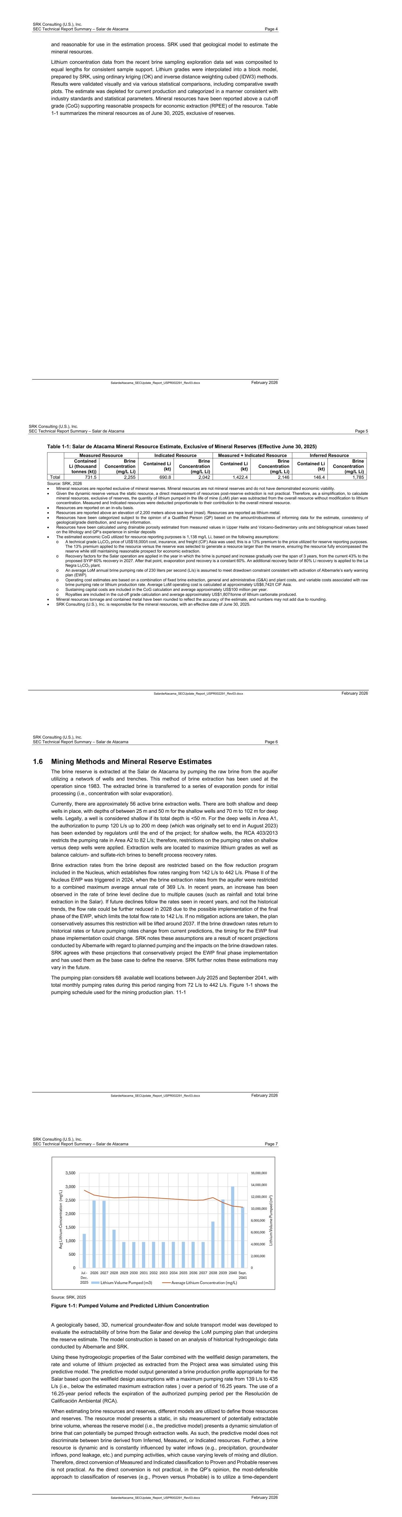SRK Consulting (U.S.), Inc. SEC Technical Report Summary – Salar de Atacama Page 148 SalardeAtacama_SECUpdate_Report_USPR002291_Rev03.docx February 2026 Source: SRK, 2025 Note: Brinechem is the primary hydrochemical database prepared by Albemarle. Chemistry_dt is the alternative hydrochemical database prepared by Albemarle, 2025 Figure 12-10: Comparison of Measured and Simulated A) Cumulative Lithium Mass Extraction, B) Average Lithium Concentration, and C) Sulfate/Calcium Ratio SRK Consulting (U.S.), Inc. SEC Technical Report Summary – Salar de Atacama Page 149 SalardeAtacama_SECUpdate_Report_USPR002291_Rev03.docx February 2026 Table 12-10 shows the average lithium mass transfer rates in the calibration period. As expected, pumping wells represent the main loss of lithium mass from groundwater (208,768 kilograms per day (kg/d)), followed by evapotranspiration or chemical precipitation (104,600 kg/d). Sources of lithium gains in groundwater mainly come from groundwater storage, with the artificial injection and natural lateral recharge contributing to a minor degree. Table 12-10: Average Lithium Mass Transfer Rate for Calibration Period (Nov 1997 - Jun 2025) Component Mass Rate (kg/d) Lithium gain in groundwater Boundary recharge and artificial recharge (Albemarle ponds and SQM Injection) 91,668 Storage release 308,170 Total gain 399,838 Lithium loss in groundwater Pumping wells 208,768 Surface water (drain cells) 3,607 Plant uptake and chemical precipitation 104,600 Storage replenishment 82,863 Total loss 399,837 Percent difference 0.0001% Source: SRK, 2025 Calibration of the model to mass extracted by the production wellfield annually and comparison of simulated to observed lithium concentration versus cumulative production pumping are both reasonable. Calibration of the model to the mass extraction rate in June of 2025 and to the sulfate-to- calcium ratio also look reasonable. It is SRK’s opinion that the numerical model adequately represents the historical and current wellfield production of lithium from the basin and can be used for future production plans to support a reserve estimate. 12.1.6 Predictive Simulations Predictive simulations cover the period from July 2025 to September 2041. The pumping plan was initially provided by Albemarle (ALB, 2025). Figure 12-11 shows the monthly distribution of the pumping plan flow rates, which range from 72 L/s to 442 L/s. The initial pumping plan was simulated until achieving the extraction of 97.4% of the flow rate imposed by the numerical model. The pumping plan considers 68 active wells between July 2025 and September 2041, with total monthly pumping rates during this period ranging from 72 L/s to 442 L/s. Flow rates range from 26.8 L/s to 364.7 L/s in area A1 and from 45.2 L/s to 118.0 L/s in area A2- Between 10 and 65 production wells were active per month to sustain the annual brine pumping rate. Projected SQM brine pumping rates were used in the predictive model starting in July 2025 and are scheduled to terminate at the end of December 2030 (SQM, 2025). Projected SQM brine pumping includes 270 EPPs (with 174 active EPPs between July 2025 and December 2030) with pumping rates of up to 47.8 L/s for a given location. The total monthly brine pumping rate varies from 957,8 L/s to 1,311.5 L/s for the entire system (SQM, 2025). As of the date of this report, SQM is conducting studies to evaluate the possibility of extending the operational period of its extraction wells. This report only considers SQM production up to December 2030. Figure 12-12 shows simulated brine pumping rates for the Albemarle and SQM properties, and Figure 12-13 shows well locations. Seepage from the Albemarle processing ponds and direct brine injections at the SQM property were not included in the base case predictive simulation. Indirect brine SRK Consulting (U.S.), Inc. SEC Technical Report Summary – Salar de Atacama Page 150 SalardeAtacama_SECUpdate_Report_USPR002291_Rev03.docx February 2026 injections at the SQM property were considered with monthly injection flow rate from 203.5 L/s to 135.8 L/s (SQM, 2025). Source: SRK, 2025. ALB, 2025 Figure 12-11: Monthly distribution according to Albemarle’s pumping plan Source: SRK, 2025 Note: SQM pumping rate in this figure does not consider brine injections. Figure 12-12: Simulated Brine Total Planned Pumping Rates for the Albemarle and SQM Properties SRK Consulting (U.S.), Inc. SEC Technical Report Summary – Salar de Atacama Page 151 SalardeAtacama_SECUpdate_Report_USPR002291_Rev03.docx February 2026 Source: SRK, 2025 Figure 12-13: Location of the Pumping Wells at the Albemarle and SQM Properties Used for Predictive Simulations