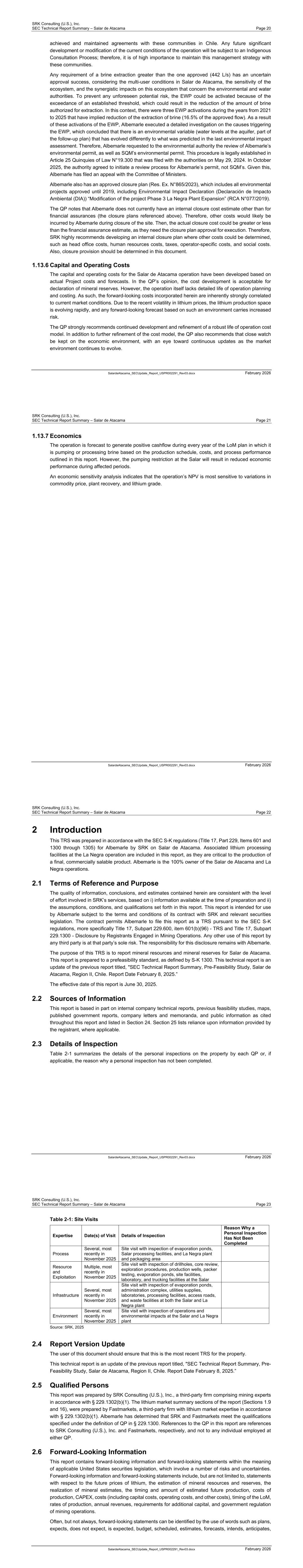 SRK Consulting (U.S.), Inc. SEC Technical Report Summary – Salar de Atacama Page 20 SalardeAtacama_SECUpdate_Report_USPR002291_Rev03.docx February 2026 achieved and maintained agreements with these communities in Chile. Any future significant development or modification of the current conditions of the operation will be subject to an Indigenous Consultation Process; therefore, it is of high importance to maintain this management strategy with these communities. Any requirement of a brine extraction greater than the one approved (442 L/s) has an uncertain approval success, considering the multi-user conditions in Salar de Atacama, the sensitivity of the ecosystem, and the synergistic impacts on this ecosystem that concern the environmental and water authorities. To prevent any unforeseen potential risk, the EWP could be activated because of the exceedance of an established threshold, which could result in the reduction of the amount of brine authorized for extraction. In this context, there were three EWP activations during the years from 2021 to 2025 that have implied reduction of the extraction of brine (16.5% of the approved flow). As a result of these activations of the EWP, Albemarle executed a detailed investigation on the causes triggering the EWP, which concluded that there is an environmental variable (water levels at the aquifer, part of the follow-up plan) that has evolved differently to what was predicted in the last environmental impact assessment. Therefore, Albemarle requested to the environmental authority the review of Albemarle’s environmental permit, as well as SQM’s environmental permit. This procedure is legally established in Article 25 Quinquies of Law N°19.300 that was filed with the authorities on May 29, 2024. In October 2025, the authority agreed to initiate a review process for Albemarle’s permit, not SQM’s. Given this, Albemarle has filed an appeal with the Committee of Ministers. Albemarle also has an approved closure plan (Res. Ex. N°865/2023), which includes all environmental projects approved until 2019, including Environmental Impact Declaration (Declaración de Impacto Ambiental (DIA)) “Modification of the project Phase 3 La Negra Plant Expansion” (RCA N°077/2019). The QP notes that Albemarle does not currently have an internal closure cost estimate other than for financial assurances (the closure plans referenced above). Therefore, other costs would likely be incurred by Albemarle during closure of the site. Then, the actual closure cost could be greater or less than the financial assurance estimate, as they need the closure plan approval for execution. Therefore, SRK highly recommends developing an internal closure plan where other costs could be determined, such as head office costs, human resources costs, taxes, operator-specific costs, and social costs. Also, closure provision should be determined in this document. 1.13.6 Capital and Operating Costs The capital and operating costs for the Salar de Atacama operation have been developed based on actual Project costs and forecasts. In the QP’s opinion, the cost development is acceptable for declaration of mineral reserves. However, the operation itself lacks detailed life of operation planning and costing. As such, the forward-looking costs incorporated herein are inherently strongly correlated to current market conditions. Due to the recent volatility in lithium prices, the lithium production space is evolving rapidly, and any forward-looking forecast based on such an environment carries increased risk. The QP strongly recommends continued development and refinement of a robust life of operation cost model. In addition to further refinement of the cost model, the QP also recommends that close watch be kept on the economic environment, with an eye toward continuous updates as the market environment continues to evolve. SRK Consulting (U.S.), Inc. SEC Technical Report Summary – Salar de Atacama Page 21 SalardeAtacama_SECUpdate_Report_USPR002291_Rev03.docx February 2026 1.13.7 Economics The operation is forecast to generate positive cashflow during every year of the LoM plan in which it is pumping or processing brine based on the production schedule, costs, and process performance outlined in this report. However, the pumping restriction at the Salar will result in reduced economic performance during affected periods. An economic sensitivity analysis indicates that the operation’s NPV is most sensitive to variations in commodity price, plant recovery, and lithium grade. SRK Consulting (U.S.), Inc. SEC Technical Report Summary – Salar de Atacama Page 22 SalardeAtacama_SECUpdate_Report_USPR002291_Rev03.docx February 2026 2 Introduction This TRS was prepared in accordance with the SEC S-K regulations (Title 17, Part 229, Items 601 and 1300 through 1305) for Albemarle by SRK on Salar de Atacama. Associated lithium processing facilities at the La Negra operation are included in this report, as they are critical to the production of a final, commercially salable product. Albemarle is the 100% owner of the Salar de Atacama and La Negra operations. 2.1 Terms of Reference and Purpose The quality of information, conclusions, and estimates contained herein are consistent with the level of effort involved in SRK’s services, based on i) information available at the time of preparation and ii) the assumptions, conditions, and qualifications set forth in this report. This report is intended for use by Albemarle subject to the terms and conditions of its contract with SRK and relevant securities legislation. The contract permits Albemarle to file this report as a TRS pursuant to the SEC S-K regulations, more specifically Title 17, Subpart 229.600, item 601(b)(96) - TRS and Title 17, Subpart 229.1300 - Disclosure by Registrants Engaged in Mining Operations. Any other use of this report by any third party is at that party’s sole risk. The responsibility for this disclosure remains with Albemar