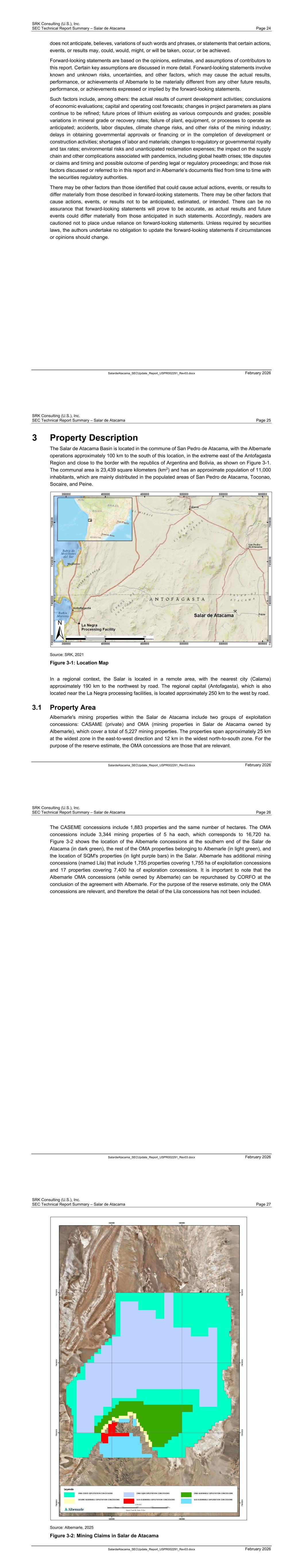 SRK Consulting (U.S.), Inc. SEC Technical Report Summary – Salar de Atacama Page 24 SalardeAtacama_SECUpdate_Report_USPR002291_Rev03.docx February 2026 does not anticipate, believes, variations of such words and phrases, or statements that certain actions, events, or results may, could, would, might, or will be taken, occur, or be achieved. Forward-looking statements are based on the opinions, estimates, and assumptions of contributors to this report. Certain key assumptions are discussed in more detail. Forward-looking statements involve known and unknown risks, uncertainties, and other factors, which may cause the actual results, performance, or achievements of Albemarle to be materially different from any other future results, performance, or achievements expressed or implied by the forward-looking statements. Such factors include, among others: the actual results of current development activities; conclusions of economic evaluations; capital and operating cost forecasts; changes in project parameters as plans continue to be refined; future prices of lithium existing as various compounds and grades; possible variations in mineral grade or recovery rates; failure of plant, equipment, or processes to operate as anticipated; accidents, labor disputes, climate change risks, and other risks of the mining industry; delays in obtaining governmental approvals or financing or in the completion of development or construction activities; shortages of labor and materials; changes to regulatory or governmental royalty and tax rates; environmental risks and unanticipated reclamation expenses; the impact on the supply chain and other complications associated with pandemics, including global health crises; title disputes or claims and timing and possible outcome of pending legal or regulatory proceedings; and those risk factors discussed or referred to in this report and in Albemarle’s documents filed from time to time with the securities regulatory authorities. There may be other factors than those identified that could cause actual actions, events, or results to differ materially from those described in forward-looking statements. There may be other factors that cause actions, events, or results not to be anticipated, estimated, or intended. There can be no assurance that forward-looking statements will prove to be accurate, as actual results and future events could differ materially from those anticipated in such statements. Accordingly, readers are cautioned not to place undue reliance on forward-looking statements. Unless required by securities laws, the authors undertake no obligation to update the forward-looking statements if circumstances or opinions should change. SRK Consulting (U.S.), Inc. SEC Technical Report Summary – Salar de Atacama Page 25 SalardeAtacama_SECUpdate_Report_USPR002291_Rev03.docx February 2026 3 Property Description The Salar de Atacama Basin is located in the commune of San Pedro de Atacama, with the Albemarle operations approximately 100 km to the south of this location, in the extreme east of the Antofagasta Region and close to the border with the republics of Argentina and Bolivia, as shown on Figure 3-1. The communal area is 23,439 square kilometers (km2) and has an approximate population of 11,000 inhabitants, which are mainly distributed in the populated areas of San Pedro de Atacama, Toconao, Socaire, and Peine. Source: SRK, 2021 Figure 3-1: Location Map In a regional context, the Salar is located in a remote area, with the nearest city (Calama) approximately 190 km to the northwest by road. The regional capital (Antofagasta), which is also located near the La Negra processing facilities, is located approximately 250 km to the west by road. 3.1 Property Area Albemarle's mining properties within the Salar de Atacama include two groups of exploitation concessions: CASAME (private) and OMA (mining properties in Salar de Atacama owned by Albemarle), which cover a total of 5,227 mining properties. The properties span approximately 25 km at the widest zone in the east-to-west direction and 12 km in the widest north-to-south zone. For the purpose of the reserve estimate, the OMA concessions are those that are relevant. SRK Consulting (U.S.), Inc. SEC Technical Report Summary – Salar de Atacama Page 26 SalardeAtacama_SECUpdate_Report_USPR002291_Rev03.docx February 2026 The CASEME concessions include 1,883 properties and the same number of hectares. The OMA concessions include 3,344 mining properties of 5 ha each, which corresponds to 16,720 ha. Figure 3-2 shows the location of the Albemarle concessions at the southern end of the Salar de Atacama (in dark green), the rest of the OMA properties belonging to Albemarle (in light green), and the location of SQM's properties (in light purple bars) in the Salar. Albemarle has additional mining concessions (named Lila) that include 1,755 properties covering 1,755 ha of exploitation concessions and 17 properties covering 7,400 ha of exploration concessions. It is important to note that the Albemarle OMA concessions (while owned by Albemarle) can be repurchased by CORFO at the conclusion of the agreement with Albemarle. For the purpose of the reserve estimate, only the OMA concessions are relevant, and therefore the detail of the Lila concessions has not been included. SRK Consulting (U.S.), Inc. SEC Technical Report Summary – Salar de Atacama Page 27 SalardeAtacama_SECUpdate_Report_USPR002291_Rev03.docx February 2026 Source: Albemarle, 2025 Figure 3-2: Mining Claims in Salar de Atacama
