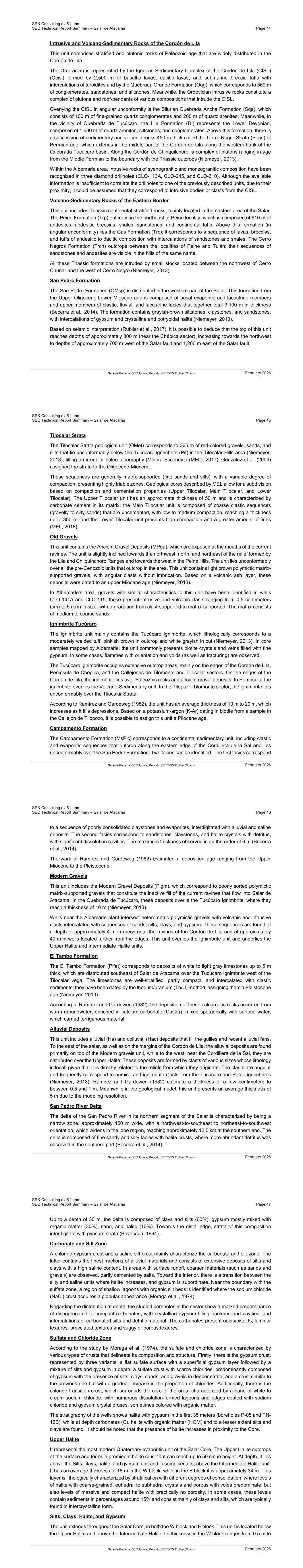 SRK Consulting (U.S.), Inc. SEC Technical Report Summary – Salar de Atacama Page 40 SalardeAtacama_SECUpdate_Report_USPR002291_Rev03.docx February 2026 6 Geological Setting, Mineralization, and Deposit 6.1 Regional, Local, and Property Geology 6.1.1 Regional Geology The Salar de Atacama corresponds to a mature salt flat and is part of the group of salt flats found in the Altiplano-Puna (Houston et al., 2011). The Salar is formed by a core of chlorides in the center, while sulfate salts and carbonates predominate toward the edges (marginal zone). The marginal zone is mainly on the eastern edge of the salt flat and extends from north to south. The saline deposits are included within the Saline Deposits Unit of the Salar de Atacama according to Becerra et al., (2014) of Pleistocene-Holocene age. The nucleus is mainly affected by the Salar Fault System (SFS) and the Horse Fault System. Both structures are inversely kinematic and have a north-to-south to northwest- to-southeast strike that creates a division of the subsurface into two blocks: West block has a thickness of between 625 and 750 m, and East block has the maximum thickness recorded in seismic profiles of 900 m to 1,500 m (Jordan et al., 2007). The oldest rocks that outcrop in the study area date back to the Paleozoic and are mainly distributed in the Cordón de Lila Range, corresponding to sedimentary sequences that were deposited in environments ranging from deep marine during the Lower Ordovician to fluvial conditions during the Permian. The formations of this period are: Igneous-sedimentary complex of the Cordón de Lila, Quebrada Grande Formation, Quebrada Ancha Formation, Lila Formation (Di), and Estratos de Cerro Negro. Two strips of intrusive rocks are also distinguished, the first dating from the Ordovician period and the second from the Permian. These strips represent the presence of a volcanic arc for each period. The sedimentary sequences (in conjunction with the intrusives) have been interpreted as an accretion prism and active magmatic arc at the edge of the supercontinent Gondwana. These rocks would form the geological basement of the Salar de Atacama basin (Niemeyer, 2013). During the Permian–Triassic, a period of deformation and intense volcanism began, as evidenced by the rock units exposed along the eastern and western margins of the salt flat, where an angular unconformity between Paleozoic strata and overlying Triassic deposits has been identified. The units deposited during the Triassic-Early Jurassic are characterized by large thicknesses of volcanic material interspersed with sedimentary sequences deposited in a transitional environment. During this period, dioritic and granitic bodies were emplaced. The Andean tectonic cycle began in the Jurassic, which is currently still active. The few outcrops of this period are found to the west of the basin, in Cerro de Caracoles hills (Basso and Mpodozis, 2012), belonging to the Caracoles Group. The facies are characteristic of a shallow-shelf marine environment, including abundant fossil fauna. Important compressive deformation events occurred in the Middle Cretaceous as part of the tectonic event called Peruvian phase (Steinman, 1929) that constituted the beginnings of the formation of the mountain ranges Cordillera de la Costa and Cordillera de Domeyko. Rocks from this period outcrop in the Domeyko Mountain Range, although few outcrops are also found south of the Lilac Range. These Cretaceous units are affected by structures such as the Barros Arana syncline in the northwest of the basin. The units present facies typical of braided and alluvial fluvial systems interspersed with evaporitic, aeolian, and lacustrine sedimentation, characteristic of arid to semi-arid environments (Bascuñán et al., 2015). During the Paleocene, an intrusion event occurred that is still accompanied by the compressive deformation that began in the Cretaceous. This event corresponds to a second period of exhumation of the Domeyko Mountain Range that occurred between 65 and 50 Ma SRK Consulting (U.S.), Inc. SEC Technical Report Summary – Salar de Atacama Page 41 SalardeAtacama_SECUpdate_Report_USPR002291_Rev03.docx February 2026 (Henríquez et al., 2019). Rocks from this period correspond to the Naranja Formation and outcrop discontinuously to the west of the Llano de la Paciencia flat. To the east of Cerro Negro, this unit is affected by chevron-like folds (Cortés, J., 2012). The Naranja Formation has proximal alluvial facies that grade to distal; this was interpreted as a sequence of post-tectonic sedimentation to a pulse of compressive deformation that affected the Domeyko Cordillera (Mpodozis et al., 2005). In the Eocene- Oligocene, the final phase of uplift of the Domeyko Cordillera (50 Ma to 28 Ma) was generated (Henríquez et al., 2019). The Loma Amarilla Formation (Eocene-Oligocene sequences) characteristic of this period corresponds to a sedimentary unit with alluvial facies that outcrop to the west of the Llano Paciencia flat. The formation is affected by the syncline of the same name and is interpreted as a sequence of synthectonic sedimentation from the Inca Phase, which affected the Domeyko Mountain Range (Mpodozis et al., 2005). In this period, the exhumation of morphostructural elements (such as the Precordillera and the Cordón de Lila) also began. The Oligocene-Early Miocene period was characterized by an extensive (possibly transtensional) tectonic event, allowing the accommodation of sedimentary units of significant thickness, forming the Paciencia Group (Pananont et al., 2004). These units outcrop in the Cordillera de la Sal area and are affected by multiple synclines and anticlines (Becerra, et al., 2014). The units present facies characteristic of lacustrine, beach, and evaporite deposits (San Pedro Formation) and alluvial (Tambores Formation). The Estratos de Tilocalar is another sedimentary sequence from this period (gravel, sand, and silt), which outcrops in
