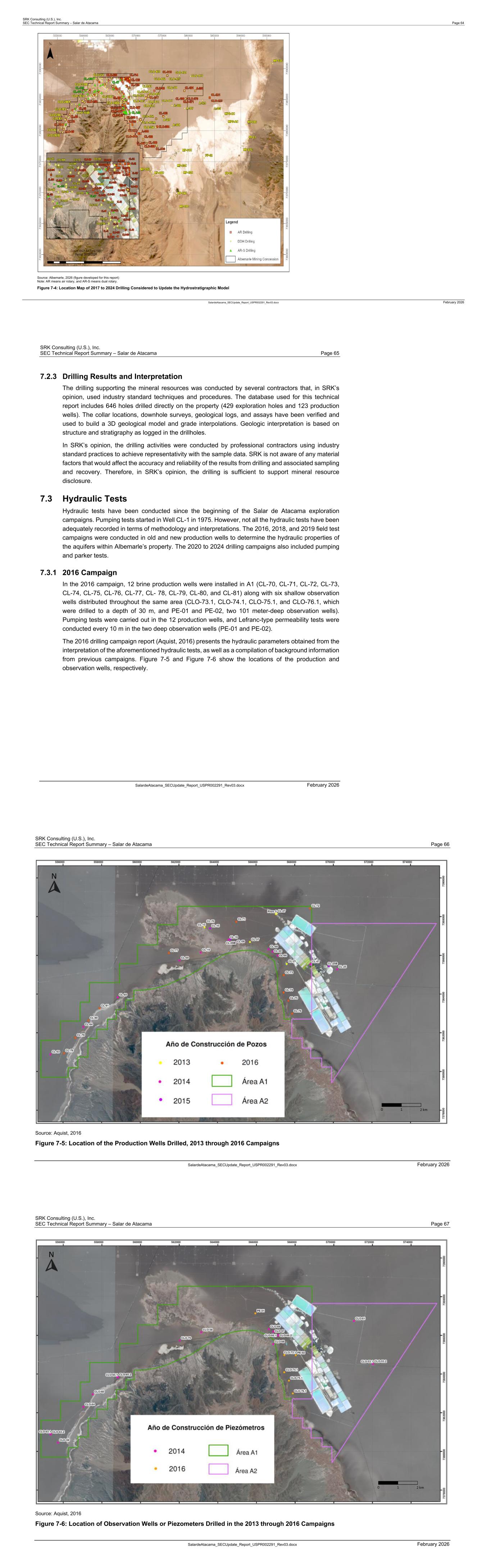 SRK Consulting (U.S.), Inc. SEC Technical Report Summary – Salar de Atacama Page 64 SalardeAtacama_SECUpdate_Report_USPR002291_Rev03.docx February 2026 Source: Albemarle, 2026 (figure developed for this report) Note: AR means air rotary, and AR-S means dual rotary. Figure 7-4: Location Map of 2017 to 2024 Drilling Considered to Update the Hydrostratigraphic Model SRK Consulting (U.S.), Inc. SEC Technical Report Summary – Salar de Atacama Page 65 SalardeAtacama_SECUpdate_Report_USPR002291_Rev03.docx February 2026 7.2.3 Drilling Results and Interpretation The drilling supporting the mineral resources was conducted by several contractors that, in SRK’s opinion, used industry standard techniques and procedures. The database used for this technical report includes 646 holes drilled directly on the property (429 exploration holes and 123 production wells). The collar locations, downhole surveys, geological logs, and assays have been verified and used to build a 3D geological model and grade interpolations. Geologic interpretation is based on structure and stratigraphy as logged in the drillholes. In SRK’s opinion, the drilling activities were conducted by professional contractors using industry standard practices to achieve representativity with the sample data. SRK is not aware of any material factors that would affect the accuracy and reliability of the results from drilling and associated sampling and recovery. Therefore, in SRK’s opinion, the drilling is sufficient to support mineral resource disclosure. 7.3 Hydraulic Tests Hydraulic tests have been conducted since the beginning of the Salar de Atacama exploration campaigns. Pumping tests started in Well CL-1 in 1975. However, not all the hydraulic tests have been adequately recorded in terms of methodology and interpretations. The 2016, 2018, and 2019 field test campaigns were conducted in old and new production wells to determine the hydraulic properties of the aquifers within Albemarle’s property. The 2020 to 2024 drilling campaigns also included pumping and parker tests. 7.3.1 2016 Campaign In the 2016 campaign, 12 brine production wells were installed in A1 (CL-70, CL-71, CL-72, CL-73, CL-74, CL-75, CL-76, CL-77, CL- 78, CL-79, CL-80, and CL-81) along with six shallow observation wells distributed throughout the same area (CLO-73.1, CLO-74.1, CLO-75.1, and CLO-76.1, which were drilled to a depth of 30 m, and PE-01 and PE-02, two 101 meter-deep observation wells). Pumping tests were carried out in the 12 production wells, and Lefranc-type permeability tests were conducted every 10 m in the two deep observation wells (PE-01 and PE-02). The 2016 drilling campaign report (Aquist, 2016) presents the hydraulic parameters obtained from the interpretation of the aforementioned hydraulic tests, as well as a compilation of background information from previous campaigns. Figure 7-5 and Figure 7-6 show the locations of the production and observation wells, respectively. SRK Consulting (U.S.), Inc. SEC Technical Report Summary – Salar de Atacama Page 66 SalardeAtacama_SECUpdate_Report_USPR002291_Rev03.docx February 2026 Source: Aquist, 2016 Figure 7-5: Location of the Production Wells Drilled, 2013 through 2016 Campaigns SRK Consulting (U.S.), Inc. SEC Technical Report Summary – Salar de Atacama Page 67 SalardeAtacama_SECUpdate_Report_USPR002291_Rev03.docx February 2026 Source: Aquist, 2016 Figure 7-6: Location of Observation Wells or Piezometers Drilled in the 2013 through 2016 Campaigns