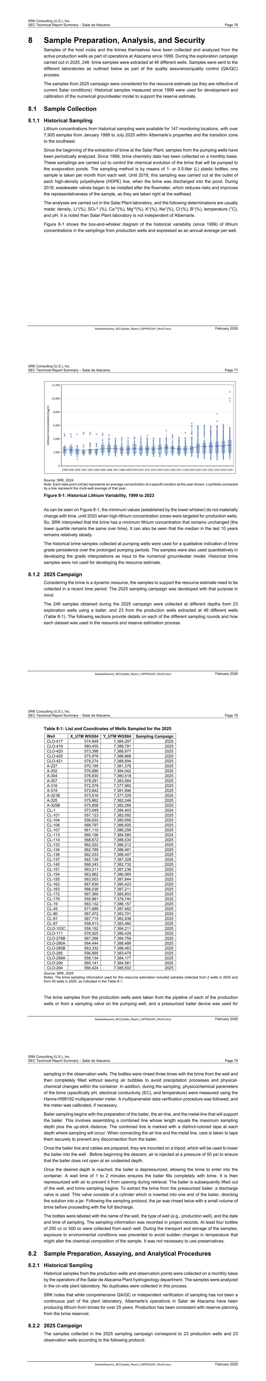 SRK Consulting (U.S.), Inc. SEC Technical Report Summary – Salar de Atacama Page 76 SalardeAtacama_SECUpdate_Report_USPR002291_Rev03.docx February 2026 8 Sample Preparation, Analysis, and Security Samples of the host rocks and the brines themselves have been collected and analyzed from the active production wells as part of operations at Atacama since 1999. During the exploration campaign carried out in 2025, 246 brine samples were extracted at 46 different wells. Samples were sent to the different laboratories as outlined below as part of the quality assurance/quality control (QA/QC) process. The samples from 2025 campaign were considered for the resource estimate (as they are reflective of current Salar conditions). Historical samples measured since 1999 were used for development and calibration of the numerical groundwater model to support the reserve estimate. 8.1 Sample Collection 8.1.1 Historical Sampling Lithium concentrations from historical sampling were available for 147 monitoring locations, with over 7,900 samples from January 1999 to July 2025 within Albemarle’s properties and the transition zone to the southeast. Since the beginning of the extraction of brine at the Salar Plant, samples from the pumping wells have been periodically analyzed. Since 1999, brine chemistry data has been collected on a monthly basis. These samplings are carried out to control the chemical evolution of the brine that will be pumped to the evaporation ponds. The sampling method is by means of 1- or 0.5-liter (L) plastic bottles; one sample is taken per month from each well. Until 2018, this sampling was carried out at the outlet of each high-density polyethylene (HDPE) line, when the brine was discharged into the pond. During 2018, wastewater valves began to be installed after the flowmeter, which reduces risks and improves the representativeness of the sample, as they are taken right at the wellhead. The analyses are carried out in the Salar Plant laboratory, and the following determinations are usually made: density, Li+(%), SO4 -2 (%), Ca+2(%), Mg+2(%), K+(%), Na+(%), Cl-(%), B+(%), temperature (°C), and pH. It is noted than Salar Plant laboratory is not independent of Albemarle. Figure 8-1 shows the box-and-whisker diagram of the historical variability (since 1999) of lithium concentrations in the samplings from production wells and expressed as an annual average per well. SRK Consulting (U.S.), Inc. SEC Technical Report Summary – Salar de Atacama Page 77 SalardeAtacama_SECUpdate_Report_USPR002291_Rev03.docx February 2026 Source: SRK, 2024 Note: Each data point (circle) represents an average concentration at a specific location at the year shown; x symbols connected by a line represent the multi-well average of that year. Figure 8-1: Historical Lithium Variability, 1999 to 2023 As can be seen on Figure 8-1, the minimum values (established by the lower whisker) do not materially change with time, until 2020 when high-lithium concentration zones were targeted for production wells. So, SRK interpreted that the brine has a minimum lithium concentration that remains unchanged (the lower quartile remains the same over time). It can also be seen that the median in the last 10 years remains relatively steady. The historical brine samples collected at pumping wells were used for a qualitative indication of brine grade persistence over the prolonged pumping periods. The samples were also used quantitatively in developing the grade interpolations as input to the numerical groundwater model. Historical brine samples were not used for developing the resource estimate. 8.1.2 2025 Campaign Considering the brine is a dynamic resource, the samples to support the resource estimate need to be collected in a recent time period. The 2025 sampling campaign was developed with that purpose in mind. The 246 samples obtained during the 2025 campaign were collected at different depths from 23 exploration wells using a bailer, and 23 from the production wells extracted at 46 different wells (Table 8-1). The following sections provide details on each of the different sampling rounds and how each dataset was used in the resource and reserve estimation process. SRK Consulting (U.S.), Inc. SEC Technical Report Summary – Salar de Atacama Page 78 SalardeAtacama_SECUpdate_Report_USPR002291_Rev03.docx February 2026 Table 8-1: List and Coordinates of Wells Sampled for the 2025 Well X_UTM WGS84 Y_UTM WGS84 Sampling Campaign CLO-417 574,849 7,384,297 2025 CLO-419 580,455 7,388,781 2025 CLO-420 573,398 7,388,977 2025 CLO-425 575,978 7,388,868 2025 CLO-421 578,274 7,388,894 2025 A-227 570,195 7,381,376 2025 A-302 576,886 7,384,042 2025 A-304 576,830 7,380,518 2025 A-307 579,291 7,383,584 2025 A-316 572,079 7,377,960 2025 A-319 573,842 7,381,896 2025 A-321B 573,916 7,377,529 2025 A-325 575,862 7,382,246 2025 A-325B 575,858 7,382,268 2025 CL-1 573,049 7,384,403 2024 CL-101 557,123 7,382,092 2025 CL-104 556,633 7,380,959 2025 CL-106 568,797 7,388,505 2025 CL-107 561,110 7,386,256 2025 CL-113 560,156 7,384,585 2024 CL-114 568,672 7,388,530 2025 CL-133 562,022 7,386,212 2025 CL-134 562,789 7,386,481 2025 CL-136 562,033 7,388,407 2025 CL-137 562,139 7,387,328 2025 CL-140 568,243 7,382,732 2025 CL-151 563,211 7,387,236 2025 CL-154 563,962 7,386,065 2025 CL-155 563,003 7,387,844 2025 CL-162 567,630 7,385,423 2025 CL-163 566,038 7,387,211 2025 CL-172 567,360 7,385,803 2025 CL-176 555,961 7,379,740 2025 CL-19 563,132 7,386,157 2025 CL-45 571,689 7,387,482 2025 CL-90 567,472 7,383,701 2025 CL-91 567,715 7,382,838 2025 CL-97 558,413 7,383,460 2025 CLO-103C 559,152 7,384,211 2025 CLO-111 576,925 7,386,429 2025 CLO-278B 567,266 7,384,759 2025 CLO-280A 564,444 7,388,488 2025 CLO-280B 563,332 7,388,463 2025 CLO-285 556,895 7,383,479 2025 CLO-289A 559,134 7,384,177 2025 CLO-290 560,141 7,384,581 2025 CLO-294 566,424 7,388,502 2025 Source: SRK, 2025 Notes: The brine sampling information used for this resource estimation included samples colle