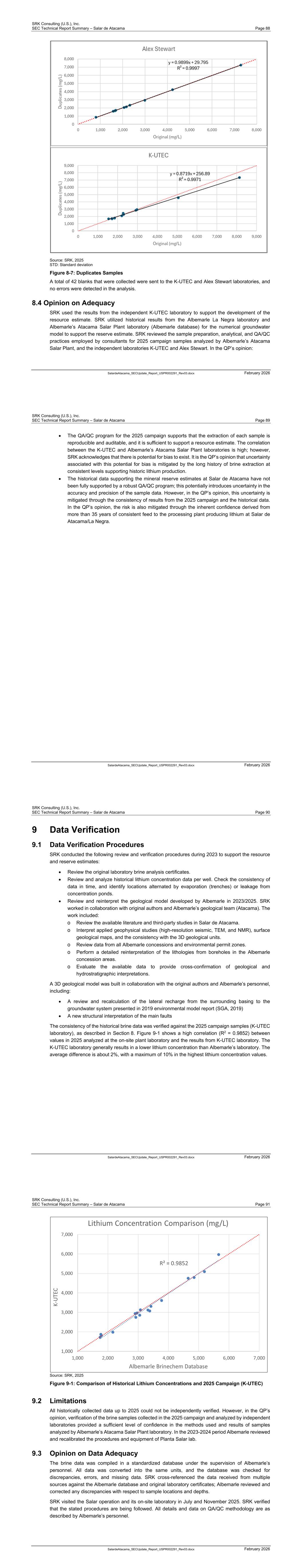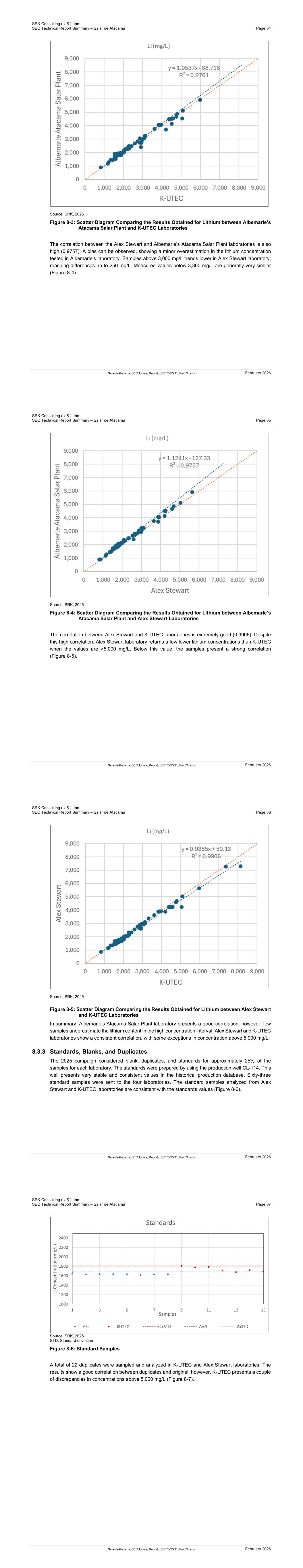 SRK Consulting (U.S.), Inc. SEC Technical Report Summary – Salar de Atacama Page 84 SalardeAtacama_SECUpdate_Report_USPR002291_Rev03.docx February 2026 Source: SRK, 2025 Figure 8-3: Scatter Diagram Comparing the Results Obtained for Lithium between Albemarle’s Atacama Salar Plant and K-UTEC Laboratories The correlation between the Alex Stewart and Albemarle’s Atacama Salar Plant laboratories is also high (0.9757). A bias can be observed, showing a minor overestimation in the lithium concentration tested in Albemarle’s laboratory. Samples above 3,000 mg/L trends lower in Alex Stewart laboratory, reaching differences up to 250 mg/L. Measured values below 3,300 mg/L are generally very similar (Figure 8-4). SRK Consulting (U.S.), Inc. SEC Technical Report Summary – Salar de Atacama Page 85 SalardeAtacama_SECUpdate_Report_USPR002291_Rev03.docx February 2026 Source: SRK, 2025 Figure 8-4: Scatter Diagram Comparing the Results Obtained for Lithium between Albemarle’s Atacama Salar Plant and Alex Stewart Laboratories The correlation between Alex Stewart and K-UTEC laboratories is extremely good (0.9906). Despite this high correlation, Alex Stewart laboratory returns a few lower lithium concentrations than K-UTEC when the values are >5,000 mg/L. Below this value, the samples present a strong correlation (Figure 8-5). SRK Consulting (U.S.), Inc. SEC Technical Report Summary – Salar de Atacama Page 86 SalardeAtacama_SECUpdate_Report_USPR002291_Rev03.docx February 2026 Source: SRK, 2025 Figure 8-5: Scatter Diagram Comparing the Results Obtained for Lithium between Alex Stewart and K-UTEC Laboratories In summary, Albemarle’s Atacama Salar Plant laboratory presents a good correlation; however, few samples underestimate the lithium content in the high concentration interval. Alex Stewart and K-UTEC laboratories show a consistent correlation, with some exceptions in concentration above 5,000 mg/L. 8.3.3 Standards, Blanks, and Duplicates The 2025 campaign considered blank, duplicates, and standards for approximately 25% of the samples for each laboratory. The standards were prepared by using the production well CL-114. This well presents very stable and consistent values in the historical production database. Sixty-three standard samples were sent to the four laboratories. The standard samples analyzed from Alex Stewart and K-UTEC laboratories are consistent with the standards values (Figure 8-6). SRK Consulting (U.S.), Inc. SEC Technical Report Summary – Salar de Atacama Page 87 SalardeAtacama_SECUpdate_Report_USPR002291_Rev03.docx February 2026 Source: SRK, 2025 STD: Standard deviation Figure 8-6: Standard Samples A total of 22 duplicates were sampled and analyzed in K-UTEC and Alex Stewart laboratories. The results show a good correlation between duplicates and original, however, K-UTEC presents a couple of discrepancies in concentrations above 5,000 mg/L (Figure 8-7).
