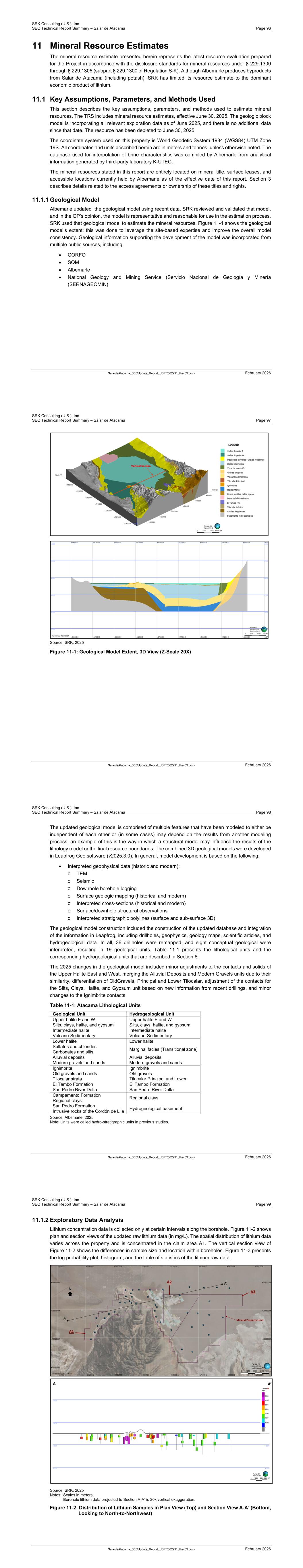 SRK Consulting (U.S.), Inc. SEC Technical Report Summary – Salar de Atacama Page 96 SalardeAtacama_SECUpdate_Report_USPR002291_Rev03.docx February 2026 11 Mineral Resource Estimates The mineral resource estimate presented herein represents the latest resource evaluation prepared for the Project in accordance with the disclosure standards for mineral resources under § 229.1300 through § 229.1305 (subpart § 229.1300 of Regulation S-K). Although Albemarle produces byproducts from Salar de Atacama (including potash), SRK has limited its resource estimate to the dominant economic product of lithium. 11.1 Key Assumptions, Parameters, and Methods Used This section describes the key assumptions, parameters, and methods used to estimate mineral resources. The TRS includes mineral resource estimates, effective June 30, 2025. The geologic block model is incorporating all relevant exploration data as of June 2025, and there is no additional data since that date. The resource has been depleted to June 30, 2025. The coordinate system used on this property is World Geodetic System 1984 (WGS84) UTM Zone 19S. All coordinates and units described herein are in meters and tonnes, unless otherwise noted. The database used for interpolation of brine characteristics was compiled by Albemarle from analytical information generated by third-party laboratory K-UTEC. The mineral resources stated in this report are entirely located on mineral title, surface leases, and accessible locations currently held by Albemarle as of the effective date of this report. Section 3 describes details related to the access agreements or ownership of these titles and rights. 11.1.1 Geological Model Albemarle updated the geological model using recent data. SRK reviewed and validated that model, and in the QP’s opinion, the model is representative and reasonable for use in the estimation process. SRK used that geological model to estimate the mineral resources. Figure 11-1 shows the geological model’s extent; this was done to leverage the site-based expertise and improve the overall model consistency. Geological information supporting the development of the model was incorporated from multiple public sources, including: CORFO SQM Albemarle National Geology and Mining Service (Servicio Nacional de Geología y Minería (SERNAGEOMIN) SRK Consulting (U.S.), Inc. SEC Technical Report Summary – Salar de Atacama Page 97 SalardeAtacama_SECUpdate_Report_USPR002291_Rev03.docx February 2026 Source: SRK, 2025 Figure 11-1: Geological Model Extent, 3D View (Z-Scale 20X) SRK Consulting (U.S.), Inc. SEC Technical Report Summary – Salar de Atacama Page 98 SalardeAtacama_SECUpdate_Report_USPR002291_Rev03.docx February 2026 The updated geological model is comprised of multiple features that have been modeled to either be independent of each other or (in some cases) may depend on the results from another modeling process; an example of this is the way in which a structural model may influence the results of the lithology model or the final resource boundaries. The combined 3D geological models were developed in Leapfrog Geo software (v2025.3.0). In general, model development is based on the following: Interpreted geophysical data (historic and modern): o TEM o Seismic o Downhole borehole logging o Surface geologic mapping (historical and modern) o Interpreted cross-sections (historical and modern) o Surface/downhole structural observations o Interpreted stratigraphic polylines (surface and sub-surface 3D) The geological model construction included the construction of the updated database and integration of the information in Leapfrog, including drillholes, geophysics, geology maps, scientific articles, and hydrogeological data. In all, 36 drillholes were remapped, and eight conceptual geological were interpreted, resulting in 19 geological units. Table 11-1 presents the lithological units and the corresponding hydrogeological units that are described in Section 6. The 2025 changes in the geological model included minor adjustments to the contacts and solids of the Upper Halite East and West, merging the Alluvial Deposits and Modern Gravels units due to their similarity, differentiation of OldGravels, Principal and Lower Tilocalar, adjustment of the contacts for the Silts, Clays, Halite, and Gypsum unit based on new information from recent drillings, and minor changes to the Ignimbrite contacts. Table 11-1: Atacama Lithological Units Geological Unit Hydrogeological Unit Upper halite E and W Upper halite E and W Silts, clays, halite, and gypsum Silts, clays, halite, and gypsum Intermediate halite Intermediate halite Volcano-Sedimentary Volcano-Sedimentary Lower halite Lower halite Sulfates and chlorides Marginal facies (Transitional zone) Carbonates and silts Alluvial deposits Alluvial deposits Modern gravels and sands Modern gravels and sands Ignimbrite Ignimbrite Old gravels and sands Old gravels Tilocalar Principal and Lower Tilocalar strata El Tambo Formation El Tambo Formation San Pedro River Delta San Pedro River Delta Campamento Formation Regional clays Regional clays San Pedro Formation Hydrogeological basement Intrusive rocks of the Cordón de Lila Source: Albemarle, 2025 Note: Units were called hydro-stratigraphic units in previous studies. SRK Consulting (U.S.), Inc. SEC Technical Report Summary – Salar de Atacama Page 99 SalardeAtacama_SECUpdate_Report_USPR002291_Rev03.docx February 2026 11.1.2 Exploratory Data Analysis Lithium concentration data is collected only at certain intervals along the borehole. Figure 11-2 shows plan and section views of the updated raw lithium data (in mg/L). The spatial distribution of lithium data varies across the property and is concentrated in the claim area A1. The vertical section view of Figure 11-2 shows the differences in sample size and location within boreholes. Figure 11-3 presents the log probability plot, histogram, and the table of statistics of the lithium raw data. Source: SRK, 2025 No