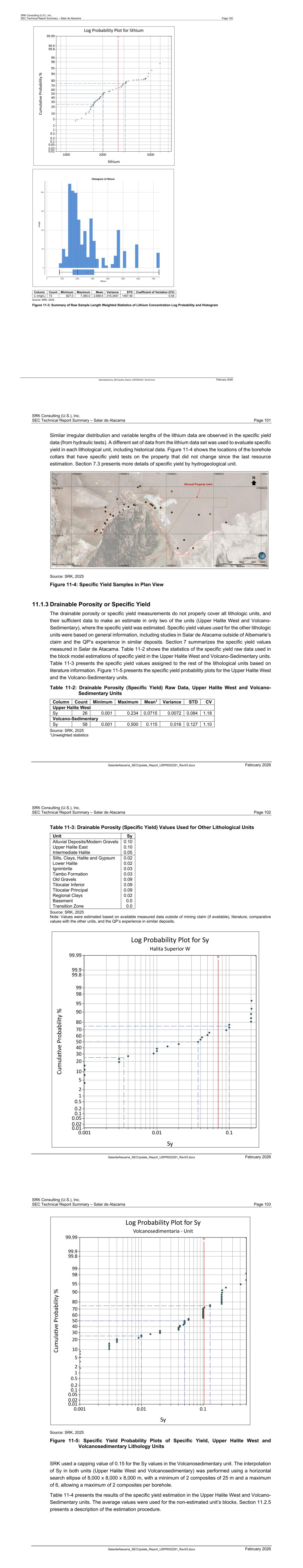 SRK Consulting (U.S.), Inc. SEC Technical Report Summary – Salar de Atacama Page 100 SalardeAtacama_SECUpdate_Report_USPR002291_Rev03.docx February 2026 Column Count Minimum Maximum Mean Variance STD Coefficient of Variation (CV) Li (mg/L) 73 827.0 7,360.0 2,689.5 215,3451 1467.46 0.54 Source: SRK, 2025 Figure 11-3: Summary of Raw Sample Length Weighted Statistics of Lithium Concentration Log Probability and Histogram 1000 2000 5000 lithium 0.01 0.02 0.05 0.1 0.2 0.5 1 2 5 10 20 30 40 50 60 70 80 90 95 98 99 99.8 99.9 99.99 C u m u la ve P ro b ab ili ty % Log Probability Plot for lithium M SRK Consulting (U.S.), Inc. SEC Technical Report Summary – Salar de Atacama Page 101 SalardeAtacama_SECUpdate_Report_USPR002291_Rev03.docx February 2026 Similar irregular distribution and variable lengths of the lithium data are observed in the specific yield data (from hydraulic tests). A different set of data from the lithium data set was used to evaluate specific yield in each lithological unit, including historical data. Figure 11-4 shows the locations of the borehole collars that have specific yield tests on the property that did not change since the last resource estimation. Section 7.3 presents more details of specific yield by hydrogeological unit. Source: SRK, 2025 Figure 11-4: Specific Yield Samples in Plan View 11.1.3 Drainable Porosity or Specific Yield The drainable porosity or specific yield measurements do not properly cover all lithologic units, and their sufficient data to make an estimate in only two of the units (Upper Halite West and Volcano- Sedimentary), where the specific yield was estimated. Specific yield values used for the other lithologic units were based on general information, including studies in Salar de Atacama outside of Albemarle’s claim and the QP’s experience in similar deposits. Section 7 summarizes the specific yield values measured in Salar de Atacama. Table 11-2 shows the statistics of the specific yield raw data used in the block model estimations of specific yield in the Upper Halite West and Volcano-Sedimentary units. Table 11-3 presents the specific yield values assigned to the rest of the lithological units based on literature information. Figure 11-5 presents the specific yield probability plots for the Upper Halite West and the Volcano-Sedimentary units. Table 11-2: Drainable Porosity (Specific Yield) Raw Data, Upper Halite West and Volcano- Sedimentary Units Column Count Minimum Maximum Mean1 Variance STD CV Upper Halite West Sy 26 0.001 0.234 0.0715 0.0072 0.084 1.18 Volcano-Sedimentary Sy 58 0.001 0.500 0.115 0.016 0.127 1.10 Source: SRK, 2025 1Unweighted statistics SRK Consulting (U.S.), Inc. SEC Technical Report Summary – Salar de Atacama Page 102 SalardeAtacama_SECUpdate_Report_USPR002291_Rev03.docx February 2026 Table 11-3: Drainable Porosity (Specific Yield) Values Used for Other Lithological Units Unit Sy Alluvial Deposits/Modern Gravels 0.10 Upper Halite East 0.10 Intermediate Halite 0.05 Silts, Clays, Halite and Gypsum 0.02 Lower Halite 0.02 Ignimbrite 0.03 Tambo Formation 0.03 Old Gravels 0.09 Tilocalar Inferior 0.09 Tilocalar Principal 0.09 Regional Clays 0.02 Basement 0.0 Transition Zone 0.0 Source: SRK, 2025 Note: Values were estimated based on available measured data outside of mining claim (if available), literature, comparative values with the other units, and the QP’s experience in similar deposits. 0.001 0.01 0.1 Sy 0.01 0.02 0.05 0.1 0.2 0.5 1 2 5 10 20 30 40 50 60 70 80 90 95 98 99 99.8 99.9 99.99 Halita Superior W Log Probability Plot for Sy M SRK Consulting (U.S.), Inc. SEC Technical Report Summary – Salar de Atacama Page 103 SalardeAtacama_SECUpdate_Report_USPR002291_Rev03.docx February 2026 Source: SRK, 2025 Figure 11-5: Specific Yield Probability Plots of Specific Yield, Upper Halite West and Volcanosedimentary Lithology Units SRK used a capping value of 0.15 for the Sy values in the Volcanosedimentary unit. The interpolation of Sy in both units (Upper Halite West and Volcanosedimentary) was performed using a horizontal search ellipse of 8,000 x 8,000 x 8,000 m, with a minimum of 2 composites of 25 m and a maximum of 6, allowing a maximum of 2 composites per borehole. Table 11-4 presents the results of the specific yield estimation in the Upper Halite West and Volcano- Sedimentary units. The average values were used for the non-estimated unit’s blocks. Section 11.2.5 presents a description of the estimation procedure. 0.001 0.01 0.1 Sy 0.01 0.02 0.05 0.1 0.2 0.5 1 2 5 10 20 30 40 50 60 70 80 90 95 98 99 99.8 99.9 99.99 Volcanosedimentaria - Unit Log Probability Plot for Sy M