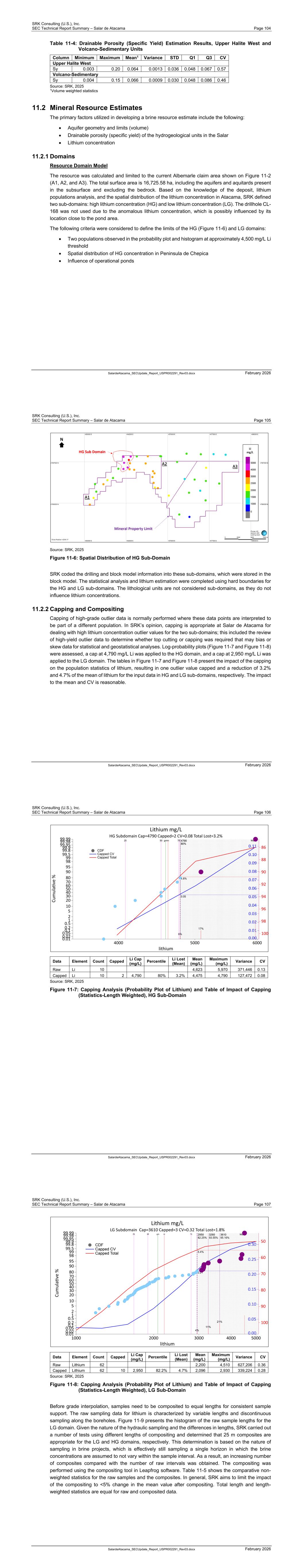 SRK Consulting (U.S.), Inc. SEC Technical Report Summary – Salar de Atacama Page 104 SalardeAtacama_SECUpdate_Report_USPR002291_Rev03.docx February 2026 Table 11-4: Drainable Porosity (Specific Yield) Estimation Results, Upper Halite West and Volcano-Sedimentary Units Column Minimum Maximum Mean1 Variance STD Q1 Q3 CV Upper Halite West Sy 0.003 0.20 0.064 0.0013 0.036 0.048 0.067 0.57 Volcano-Sedimentary Sy 0.004 0.15 0.066 0.0009 0.030 0.048 0.086 0.46 Source: SRK, 2025 1Volume weighted statistics 11.2 Mineral Resource Estimates The primary factors utilized in developing a brine resource estimate include the following: Aquifer geometry and limits (volume) Drainable porosity (specific yield) of the hydrogeological units in the Salar Lithium concentration 11.2.1 Domains Resource Domain Model The resource was calculated and limited to the current Albemarle claim area shown on Figure 11-2 (A1, A2, and A3). The total surface area is 16,725.58 ha, including the aquifers and aquitards present in the subsurface and excluding the bedrock. Based on the knowledge of the deposit, lithium populations analysis, and the spatial distribution of the lithium concentration in Atacama, SRK defined two sub-domains: high lithium concentration (HG) and low lithium concentration (LG). The drillhole CL- 168 was not used due to the anomalous lithium concentration, which is possibly influenced by its location close to the pond area. The following criteria were considered to define the limits of the HG (Figure 11-6) and LG domains: Two populations observed in the probability plot and histogram at approximately 4,500 mg/L Li threshold Spatial distribution of HG concentration in Peninsula de Chepica Influence of operational ponds SRK Consulting (U.S.), Inc. SEC Technical Report Summary – Salar de Atacama Page 105 SalardeAtacama_SECUpdate_Report_USPR002291_Rev03.docx February 2026 Source: SRK, 2025 Figure 11-6: Spatial Distribution of HG Sub-Domain SRK coded the drilling and block model information into these sub-domains, which were stored in the block model. The statistical analysis and lithium estimation were completed using hard boundaries for the HG and LG sub-domains. The lithological units are not considered sub-domains, as they do not influence lithium concentrations. 11.2.2 Capping and Compositing Capping of high-grade outlier data is normally performed where these data points are interpreted to be part of a different population. In SRK’s opinion, capping is appropriate at Salar de Atacama for dealing with high lithium concentration outlier values for the two sub-domains; this included the review of high-yield outlier data to determine whether top cutting or capping was required that may bias or skew data for statistical and geostatistical analyses. Log-probability plots (Figure 11-7 and Figure 11-8) were assessed, a cap at 4,790 mg/L Li was applied to the HG domain, and a cap at 2,950 mg/L Li was applied to the LG domain. The tables in Figure 11-7 and Figure 11-8 present the impact of the capping on the population statistics of lithium, resulting in one outlier value capped and a reduction of 3.2% and 4.7% of the mean of lithium for the input data in HG and LG sub-domains, respectively. The impact to the mean and CV is reasonable. SRK Consulting (U.S.), Inc. SEC Technical Report Summary – Salar de Atacama Page 106 SalardeAtacama_SECUpdate_Report_USPR002291_Rev03.docx February 2026 Data Element Count Capped Li Cap (mg/L) Percentile Li Lost (Mean) Mean (mg/L) Maximum (mg/L) Variance CV Raw Li 10 4,623 5,970 371,446 0.13 Capped Li 10 2 4,790 80% 3.2% 4,475 4,790 127,472 0.08 Source: SRK, 2025 Figure 11-7: Capping Analysis (Probability Plot of Lithium) and Table of Impact of Capping (Statistics-Length Weighted), HG Sub-Domain 4000 5000 6000 lithium 0.01 0.02 0.05 0.1 0.2 0.5 1 2 5 10 20 30 40 50 60 70 80 90 95 98 99 99.5 99.8 99.9 99.95 99.98 99.99 0.00 0.01 0.02 0.03 0.04 0.05 0.06 0.07 0.08 0.09 0.10 0.11 100 98 96 94 92 90 88 86 C u m u la ve % HG Subdomain Cap=4790 Capped=2 CV=0.08 Total Lost=3.2% Lithium mg/L 4790 80% 0.05 4.8% mgm25 50 75 Max 6% 17% CDF Capped CV Capped Total SRK Consulting (U.S.), Inc. SEC Technical Report Summary – Salar de Atacama Page 107 SalardeAtacama_SECUpdate_Report_USPR002291_Rev03.docx February 2026 Data Element Count Capped Li Cap (mg/L) Percentile Li Lost (Mean) Mean (mg/L) Maximum (mg/L) Variance CV Raw Lithium 62 2,200 4,510 627,206 0.36 Capped Lithium 62 10 2,950 82.2% 4.7% 2,096 2,930 339,224 0.28 Source: SRK, 2025 Figure 11-8: Capping Analysis (Probability Plot of Lithium) and Table of Impact of Capping (Statistics-Length Weighted), LG Sub-Domain Before grade interpolation, samples need to be composited to equal lengths for consistent sample support. The raw sampling data for lithium is characterized by variable lengths and discontinuous sampling along the boreholes. Figure 11-9 presents the histogram of the raw sample lengths for the LG domain. Given the nature of the hydraulic sampling and the differences in lengths, SRK carried out a number of tests using different lengths of compositing and determined that 25 m composites are appropriate for the LG and HG domains, respectively. This determination is based on the nature of sampling in brine projects, which is effectively still sampling a single horizon in which the brine concentrations are assumed to not vary within the sample interval. As a result, an increasing number of composites compared with the number of raw intervals was obtained. The compositing was performed using the compositing tool in Leapfrog software. Table 11-5 shows the comparative non- weighted statistics for the raw samples and the composites. In general, SRK aims to limit the impact of the compositing to <5% change in the mean value after compositing. Total length and length- weighted statistics are equal for raw and composited data. C u m u la ve %