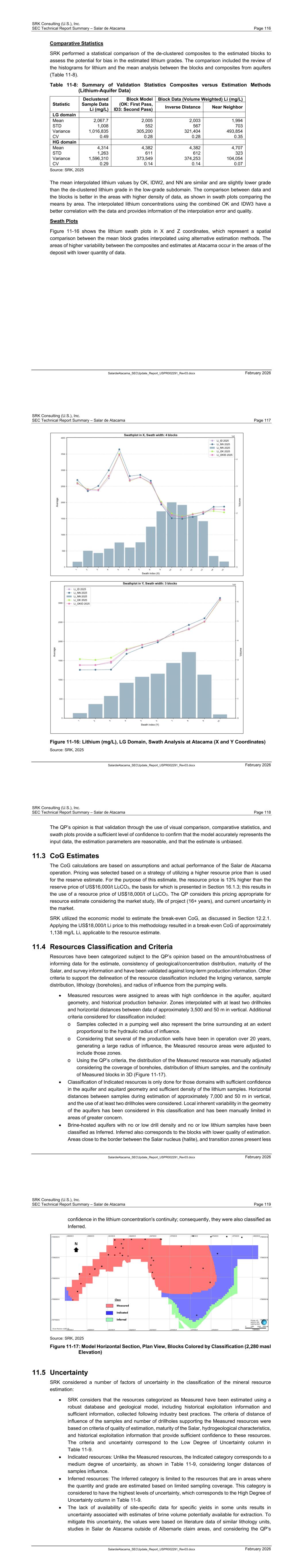 SRK Consulting (U.S.), Inc. SEC Technical Report Summary – Salar de Atacama Page 116 SalardeAtacama_SECUpdate_Report_USPR002291_Rev03.docx February 2026 Comparative Statistics SRK performed a statistical comparison of the de-clustered composites to the estimated blocks to assess the potential for bias in the estimated lithium grades. The comparison included the review of the histograms for lithium and the mean analysis between the blocks and composites from aquifers (Table 11-8). Table 11-8: Summary of Validation Statistics Composites versus Estimation Methods (Lithium-Aquifer Data) Statistic Declustered Sample Data Li (mg/L) Block Model (OK: First Pass, ID3: Second Pass) Block Data (Volume Weighted) Li (mg/L) Inverse Distance Near Neighbor LG domain Mean 2,067.7 2,005 2,003 1,994 STD 1,008 552 567 703 Variance 1,016,835 305,200 321,404 493,854 CV 0.49 0.28 0.28 0.35 HG domain Mean 4,314 4,382 4,382 4,707 STD 1,263 611 612 323 Variance 1,596,310 373,549 374,253 104,054 CV 0.29 0.14 0.14 0.07 Source: SRK, 2025 The mean interpolated lithium values by OK, IDW2, and NN are similar and are slightly lower grade than the de-clustered lithium grade in the low-grade subdomain. The comparison between data and the blocks is better in the areas with higher density of data, as shown in swath plots comparing the means by area. The interpolated lithium concentrations using the combined OK and IDW3 have a better correlation with the data and provides information of the interpolation error and quality. Swath Plots Figure 11-16 shows the lithium swath plots in X and Z coordinates, which represent a spatial comparison between the mean block grades interpolated using alternative estimation methods. The areas of higher variability between the composites and estimates at Atacama occur in the areas of the deposit with lower quantity of data. SRK Consulting (U.S.), Inc. SEC Technical Report Summary – Salar de Atacama Page 117 SalardeAtacama_SECUpdate_Report_USPR002291_Rev03.docx February 2026 Figure 11-16: Lithium (mg/L), LG Domain, Swath Analysis at Atacama (X and Y Coordinates) Source: SRK, 2025 SRK Consulting (U.S.), Inc. SEC Technical Report Summary – Salar de Atacama Page 118 SalardeAtacama_SECUpdate_Report_USPR002291_Rev03.docx February 2026 The QP’s opinion is that validation through the use of visual comparison, comparative statistics, and swath plots provide a sufficient level of confidence to confirm that the model accurately represents the input data, the estimation parameters are reasonable, and that the estimate is unbiased. 11.3 CoG Estimates The CoG calculations are based on assumptions and actual performance of the Salar de Atacama operation. Pricing was selected based on a strategy of utilizing a higher resource price than is used for the reserve estimate. For the purpose of this estimate, the resource price is 13% higher than the reserve price of US$16,000/t Li2CO3, the basis for which is presented in Section 16.1.3; this results in the use of a resource price of US$18,000/t of Li2CO3. The QP considers this pricing appropriate for resource estimate considering the market study, life of project (16+ years), and current uncertainty in the market. SRK utilized the economic model to estimate the break-even CoG, as discussed in Section 12.2.1. Applying the US$18,000/t Li price to this methodology resulted in a break-even CoG of approximately 1,138 mg/L Li, applicable to the resource estimate. 11.4 Resources Classification and Criteria Resources have been categorized subject to the QP’s opinion based on the amount/robustness of informing data for the estimate, consistency of geological/concentration distribution, maturity of the Salar, and survey information and have been validated against long-term production information. Other criteria to support the delineation of the resource classification included the kriging variance, sample distribution, lithology (boreholes), and radius of influence from the pumping wells. Measured resources were assigned to areas with high confidence in the aquifer, aquitard geometry, and historical production behavior. Zones interpolated with at least two drillholes and horizontal distances between data of approximately 3,500 and 50 m in vertical. Additional criteria considered for classification included: o Samples collected in a pumping well also represent the brine surrounding at an extent proportional to the hydraulic radius of influence. o Considering that several of the production wells have been in operation over 20 years, generating a large radius of influence, the Measured resource areas were adjusted to include those zones. o Using the QP’s criteria, the distribution of the Measured resource was manually adjusted considering the coverage of boreholes, distribution of lithium samples, and the continuity of Measured blocks in 3D (Figure 11-17). Classification of Indicated resources is only done for those domains with sufficient confidence in the aquifer and aquitard geometry and sufficient density of the lithium samples. Horizontal distances between samples during estimation of approximately 7,000 and 50 m in vertical, and the use of at least two drillholes were considered. Local inherent variability in the geometry of the aquifers has been considered in this classification and has been manually limited in areas of greater concern. Brine-hosted aquifers with no or low drill density and no or low lithium samples have been classified as Inferred. Inferred also corresponds to the blocks with lower quality of estimation. Areas close to the border between the Salar nucleus (halite), and transition zones present less SRK Consulting (U.S.), Inc. SEC Technical Report Summary – Salar de Atacama Page 119 SalardeAtacama_SECUpdate_Report_USPR002291_Rev03.docx February 2026 confidence in the lithium concentration's continuity; consequently, they were also classified as Inferred. Source: SRK, 2025 Figure 11-17: Model Horizontal Section, Plan View, Blocks Colored b