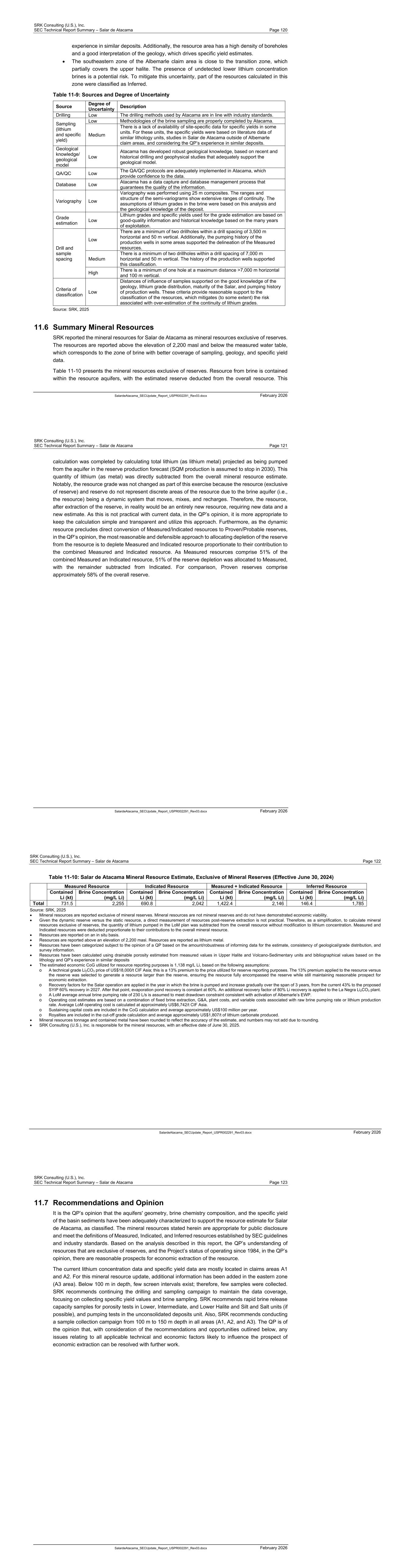 SRK Consulting (U.S.), Inc. SEC Technical Report Summary – Salar de Atacama Page 120 SalardeAtacama_SECUpdate_Report_USPR002291_Rev03.docx February 2026 experience in similar deposits. Additionally, the resource area has a high density of boreholes and a good interpretation of the geology, which drives specific yield estimates. The southeastern zone of the Albemarle claim area is close to the transition zone, which partially covers the upper halite. The presence of undetected lower lithium concentration brines is a potential risk. To mitigate this uncertainty, part of the resources calculated in this zone were classified as Inferred. Table 11-9: Sources and Degree of Uncertainty Source Degree of Uncertainty Description Drilling Low The drilling methods used by Atacama are in line with industry standards. Sampling (lithium and specific yield) Low Methodologies of the brine sampling are properly completed by Atacama. Medium There is a lack of availability of site-specific data for specific yields in some units. For these units, the specific yields were based on literature data of similar lithology units, studies in Salar de Atacama outside of Albemarle claim areas, and considering the QP’s experience in similar deposits. Geological knowledge/ geological model Low Atacama has developed robust geological knowledge, based on recent and historical drilling and geophysical studies that adequately support the geological model. QA/QC Low The QA/QC protocols are adequately implemented in Atacama, which provide confidence to the data. Database Low Atacama has a data capture and database management process that guarantees the quality of the information. Variography Low Variography was performed using 25 m composites. The ranges and structure of the semi-variograms show extensive ranges of continuity. The assumptions of lithium grades in the brine were based on this analysis and the geological knowledge of the deposit. Grade estimation Low Lithium grades and specific yields used for the grade estimation are based on good-quality information and historical knowledge based on the many years of exploitation. Drill and sample spacing Low There are a minimum of two drillholes within a drill spacing of 3,500 m horizontal and 50 m vertical. Additionally, the pumping history of the production wells in some areas supported the delineation of the Measured resources. Medium There is a minimum of two drillholes within a drill spacing of 7,000 m horizontal and 50 m vertical. The history of the production wells supported this classification. High There is a minimum of one hole at a maximum distance >7,000 m horizontal and 100 m vertical. Criteria of classification Low Distances of influence of samples supported on the good knowledge of the geology, lithium grade distribution, maturity of the Salar, and pumping history of production wells. These criteria provide reasonable support to the classification of the resources, which mitigates (to some extent) the risk associated with over-estimation of the continuity of lithium grades. Source: SRK, 2025 11.6 Summary Mineral Resources SRK reported the mineral resources for Salar de Atacama as mineral resources exclusive of reserves. The resources are reported above the elevation of 2,200 masl and below the measured water table, which corresponds to the zone of brine with better coverage of sampling, geology, and specific yield data. Table 11-10 presents the mineral resources exclusive of reserves. Resource from brine is contained within the resource aquifers, with the estimated reserve deducted from the overall resource. This SRK Consulting (U.S.), Inc. SEC Technical Report Summary – Salar de Atacama Page 121 SalardeAtacama_SECUpdate_Report_USPR002291_Rev03.docx February 2026 calculation was completed by calculating total lithium (as lithium metal) projected as being pumped from the aquifer in the reserve production forecast (SQM production is assumed to stop in 2030). This quantity of lithium (as metal) was directly subtracted from the overall mineral resource estimate. Notably, the resource grade was not changed as part of this exercise because the resource (exclusive of reserve) and reserve do not represent discrete areas of the resource due to the brine aquifer (i.e., the resource) being a dynamic system that moves, mixes, and recharges. Therefore, the resource, after extraction of the reserve, in reality would be an entirely new resource, requiring new data and a new estimate. As this is not practical with current data, in the QP’s opinion, it is more appropriate to keep the calculation simple and transparent and utilize this approach. Furthermore, as the dynamic resource precludes direct conversion of Measured/Indicated resources to Proven/Probable reserves, in the QP’s opinion, the most reasonable and defensible approach to allocating depletion of the reserve from the resource is to deplete Measured and Indicated resource proportionate to their contribution to the combined Measured and Indicated resource. As Measured resources comprise 51% of the combined Measured an Indicated resource, 51% of the reserve depletion was allocated to Measured, with the remainder subtracted from Indicated. For comparison, Proven reserves comprise approximately 58% of the overall reserve. SRK Consulting (U.S.), Inc. SEC Technical Report Summary – Salar de Atacama Page 122 SalardeAtacama_SECUpdate_Report_USPR002291_Rev03.docx February 2026 Table 11-10: Salar de Atacama Mineral Resource Estimate, Exclusive of Mineral Reserves (Effective June 30, 2024) Measured Resource Indicated Resource Measured + Indicated Resource Inferred Resource Contained Li (kt) Brine Concentration (mg/L Li) Contained Li (kt) Brine Concentration (mg/L Li) Contained Li (kt) Brine Concentration (mg/L Li) Contained Li (kt) Brine Concentration (mg/L Li) Total 731.5 2,255 690.8 2,042 1,422.4 2,146 146.4 1,785 Source: SRK, 2025 Mineral resources are reported exclusive of mineral reserves. Mineral resources ar