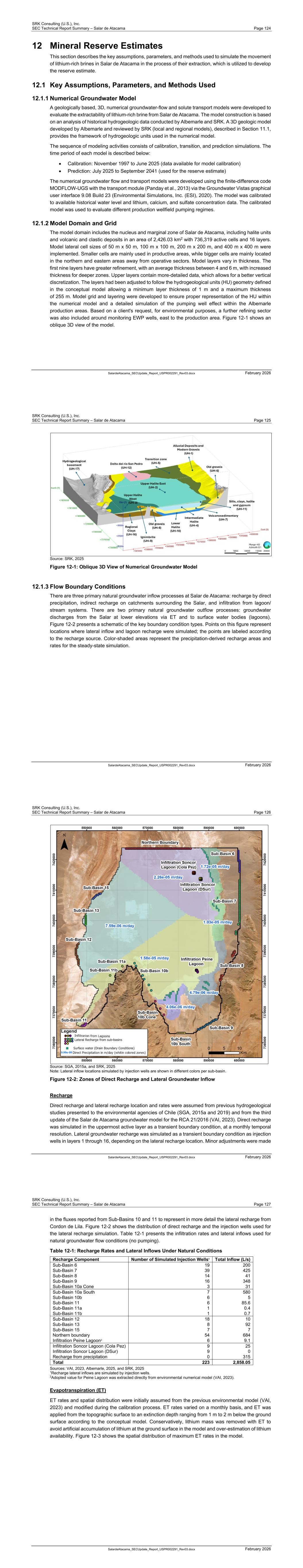 SRK Consulting (U.S.), Inc. SEC Technical Report Summary – Salar de Atacama Page 124 SalardeAtacama_SECUpdate_Report_USPR002291_Rev03.docx February 2026 12 Mineral Reserve Estimates This section describes the key assumptions, parameters, and methods used to simulate the movement of lithium-rich brines in Salar de Atacama in the process of their extraction, which is utilized to develop the reserve estimate. 12.1 Key Assumptions, Parameters, and Methods Used 12.1.1 Numerical Groundwater Model A geologically based, 3D, numerical groundwater-flow and solute transport models were developed to evaluate the extractability of lithium-rich brine from Salar de Atacama. The model construction is based on an analysis of historical hydrogeologic data conducted by Albemarle and SRK. A 3D geologic model developed by Albemarle and reviewed by SRK (local and regional models), described in Section 11.1, provides the framework of hydrogeologic units used in the numerical model. The sequence of modeling activities consists of calibration, transition, and prediction simulations. The time period of each model is described below: Calibration: November 1997 to June 2025 (data available for model calibration) Prediction: July 2025 to September 2041 (used for the reserve estimate) The numerical groundwater flow and transport models were developed using the finite-difference code MODFLOW-UGS with the transport module (Panday et al., 2013) via the Groundwater Vistas graphical user interface 9.08 Build 23 (Environmental Simulations, Inc. (ESI), 2020). The model was calibrated to available historical water level and lithium, calcium, and sulfate concentration data. The calibrated model was used to evaluate different production wellfield pumping regimes. 12.1.2 Model Domain and Grid The model domain includes the nucleus and marginal zone of Salar de Atacama, including halite units and volcanic and clastic deposits in an area of 2,426.03 km2 with 736,319 active cells and 16 layers. Model lateral cell sizes of 50 m x 50 m, 100 m x 100 m, 200 m x 200 m, and 400 m x 400 m were implemented. Smaller cells are mainly used in productive areas, while bigger cells are mainly located in the northern and eastern areas away from operative sectors. Model layers vary in thickness. The first nine layers have greater refinement, with an average thickness between 4 and 6 m, with increased thickness for deeper zones. Upper layers contain more-detailed data, which allows for a better vertical discretization. The layers had been adjusted to follow the hydrogeological units (HU) geometry defined in the conceptual model allowing a minimum layer thickness of 1 m and a maximum thickness of 255 m. Model grid and layering were developed to ensure proper representation of the HU within the numerical model and a detailed simulation of the pumping well effect within the Albemarle production areas. Based on a client's request, for environmental purposes, a further refining sector was also included around monitoring EWP wells, east to the production area. Figure 12-1 shows an oblique 3D view of the model. SRK Consulting (U.S.), Inc. SEC Technical Report Summary – Salar de Atacama Page 125 SalardeAtacama_SECUpdate_Report_USPR002291_Rev03.docx February 2026 Source: SRK, 2025 Figure 12-1: Oblique 3D View of Numerical Groundwater Model 12.1.3 Flow Boundary Conditions There are three primary natural groundwater inflow processes at Salar de Atacama: recharge by direct precipitation, indirect recharge on catchments surrounding the Salar, and infiltration from lagoon/ stream systems. There are two primary natural groundwater outflow processes: groundwater discharges from the Salar at lower elevations via ET and to surface water bodies (lagoons). Figure 12-2 presents a schematic of the key boundary condition types. Points on this figure represent locations where lateral inflow and lagoon recharge were simulated; the points are labeled according to the recharge source. Color-shaded areas represent the precipitation-derived recharge areas and rates for the steady-state simulation. SRK Consulting (U.S.), Inc. SEC Technical Report Summary – Salar de Atacama Page 126 SalardeAtacama_SECUpdate_Report_USPR002291_Rev03.docx February 2026 Source: SGA, 2015a, and SRK, 2025 Note: Lateral inflow locations simulated by injection wells are shown in different colors per sub-basin. Figure 12-2: Zones of Direct Recharge and Lateral Groundwater Inflow Recharge Direct recharge and lateral recharge location and rates were assumed from previous hydrogeological studies presented to the environmental agencies of Chile (SGA, 2015a and 2019) and from the third update of the Salar de Atacama groundwater model for the RCA 21/2016 (VAI, 2023). Direct recharge was simulated in the uppermost active layer as a transient boundary condition, at a monthly temporal resolution. Lateral groundwater recharge was simulated as a transient boundary condition as injection wells in layers 1 through 16, depending on the lateral recharge location. Minor adjustments were made SRK Consulting (U.S.), Inc. SEC Technical Report Summary – Salar de Atacama Page 127 SalardeAtacama_SECUpdate_Report_USPR002291_Rev03.docx February 2026 in the fluxes reported from Sub-Basins 10 and 11 to represent in more detail the lateral recharge from Cordon de Lila. Figure 12-2 shows the distribution of direct recharge and the injection wells used for the lateral recharge simulation. Table 12-1 presents the infiltration rates and lateral inflows used for natural groundwater flow conditions (no pumping). Table 12-1: Recharge Rates and Lateral Inflows Under Natural Conditions Recharge Component Number of Simulated Injection Wells1 Total Inflow (L/s) Sub-Basin 6 19 200 Sub-Basin 7 39 425 Sub-Basin 8 14 41 Sub-Basin 9 16 348 Sub-Basin 10a Cone 3 31 Sub-Basin 10a South 7 580 Sub-Basin 10b 6 5 Sub-Basin 11 6 85.6 Sub-Basin 11a 1 0.4 Sub-Basin 11b 1 0.7 Sub-Basin 12 18 10 Sub-Basin 13 8 92 Sub-Basin 15 7 7 Northern boundary 54