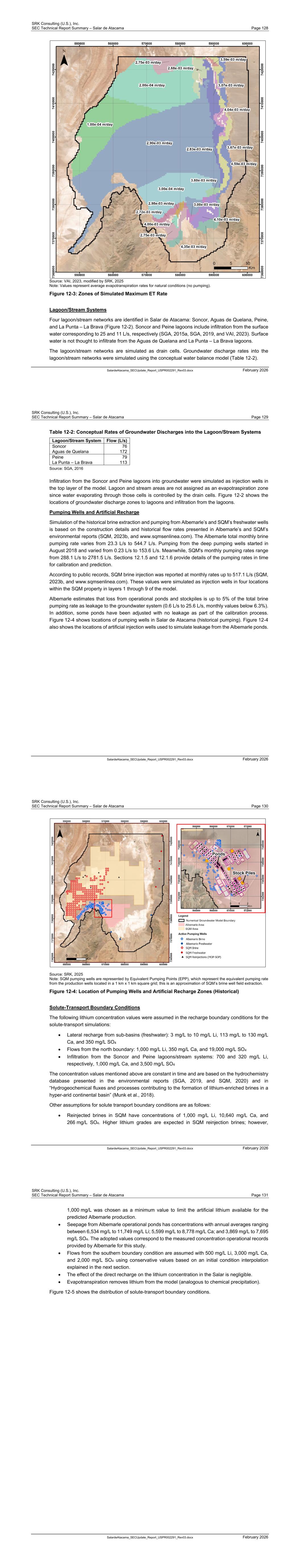 SRK Consulting (U.S.), Inc. SEC Technical Report Summary – Salar de Atacama Page 128 SalardeAtacama_SECUpdate_Report_USPR002291_Rev03.docx February 2026 Source: VAI, 2023, modified by SRK, 2025 Note: Values represent average evapotranspiration rates for natural conditions (no pumping). Figure 12-3: Zones of Simulated Maximum ET Rate Lagoon/Stream Systems Four lagoon/stream networks are identified in Salar de Atacama: Soncor, Aguas de Quelana, Peine, and La Punta – La Brava (Figure 12-2). Soncor and Peine lagoons include infiltration from the surface water corresponding to 25 and 11 L/s, respectively (SGA, 2015a, SGA, 2019, and VAI, 2023). Surface water is not thought to infiltrate from the Aguas de Quelana and La Punta – La Brava lagoons. The lagoon/stream networks are simulated as drain cells. Groundwater discharge rates into the lagoon/stream networks were simulated using the conceptual water balance model (Table 12-2). SRK Consulting (U.S.), Inc. SEC Technical Report Summary – Salar de Atacama Page 129 SalardeAtacama_SECUpdate_Report_USPR002291_Rev03.docx February 2026 Table 12-2: Conceptual Rates of Groundwater Discharges into the Lagoon/Stream Systems Lagoon/Stream System Flow (L/s) Soncor 76 Aguas de Quelana 172 Peine 79 La Punta – La Brava 113 Source: SGA, 2016 Infiltration from the Soncor and Peine lagoons into groundwater were simulated as injection wells in the top layer of the model. Lagoon and stream areas are not assigned as an evapotraspiration zone since water evaporating through those cells is controlled by the drain cells. Figure 12-2 shows the locations of groundwater discharge zones to lagoons and infiltration from the lagoons. Pumping Wells and Artificial Recharge Simulation of the historical brine extraction and pumping from Albemarle’s and SQM’s freshwater wells is based on the construction details and historical flow rates presented in Albemarle’s and SQM’s environmental reports (SQM, 2023b, and www.sqmsenlinea.com). The Albemarle total monthly brine pumping rate varies from 23.3 L/s to 544.7 L/s. Pumping from the deep pumping wells started in August 2018 and varied from 0.23 L/s to 153.6 L/s. Meanwhile, SQM's monthly pumping rates range from 288.1 L/s to 2781.5 L/s. Sections 12.1.5 and 12.1.6 provide details of the pumping rates in time for calibration and prediction. According to public records, SQM brine injection was reported at monthly rates up to 517.1 L/s (SQM, 2023b, and www.sqmsenlinea.com). These values were simulated as injection wells in four locations within the SQM property in layers 1 through 9 of the model. Albemarle estimates that loss from operational ponds and stockpiles is up to 5% of the total brine pumping rate as leakage to the groundwater system (0.6 L/s to 25.6 L/s, monthly values below 6.3%). In addition, some ponds have been adjusted with no leakage as part of the calibration process. Figure 12-4 shows locations of pumping wells in Salar de Atacama (historical pumping). Figure 12-4 also shows the locations of artificial injection wells used to simulate leakage from the Albemarle ponds. SRK Consulting (U.S.), Inc. SEC Technical Report Summary – Salar de Atacama Page 130 SalardeAtacama_SECUpdate_Report_USPR002291_Rev03.docx February 2026 Source: SRK, 2025 Note: SQM pumping wells are represented by Equivalent Pumping Points (EPP), which represent the equivalent pumping rate from the production wells located in a 1 km x 1 km square grid; this is an approximation of SQM’s brine well field extraction. Figure 12-4: Location of Pumping Wells and Artificial Recharge Zones (Historical) Solute-Transport Boundary Conditions The following lithium concentration values were assumed in the recharge boundary conditions for the solute-transport simulations: Lateral recharge from sub-basins (freshwater): 3 mg/L to 10 mg/L Li, 113 mg/L to 130 mg/L Ca, and 350 mg/L SO4 Flows from the north boundary: 1,000 mg/L Li, 350 mg/L Ca, and 19,000 mg/L SO4 Infiltration from the Soncor and Peine lagoons/stream systems: 700 and 320 mg/L Li, respectively, 1,000 mg/L Ca, and 3,500 mg/L SO4 The concentration values mentioned above are constant in time and are based on the hydrochemistry database presented in the environmental reports (SGA, 2019, and SQM, 2020) and in “Hydrogeochemical fluxes and processes contributing to the formation of lithium-enriched brines in a hyper-arid continental basin” (Munk et al., 2018). Other assumptions for solute transport boundary conditions are as follows: Reinjected brines in SQM have concentrations of 1,000 mg/L Li, 10,640 mg/L Ca, and 266 mg/L SO4. Higher lithium grades are expected in SQM reinjection brines; however, SRK Consulting (U.S.), Inc. SEC Technical Report Summary – Salar de Atacama Page 131 SalardeAtacama_SECUpdate_Report_USPR002291_Rev03.docx February 2026 1,000 mg/L was chosen as a minimum value to limit the artificial lithium available for the predicted Albemarle production. Seepage from Albemarle operational ponds has concentrations with annual averages ranging between 6,534 mg/L to 11,749 mg/L Li; 5,599 mg/L to 8,778 mg/L Ca; and 3,869 mg/L to 7,695 mg/L SO4. The adopted values correspond to the measured concentration operational records provided by Albemarle for this study. Flows from the southern boundary condition are assumed with 500 mg/L Li, 3,000 mg/L Ca, and 2,000 mg/L SO4 using conservative values based on an initial condition interpolation explained in the next section. The effect of the direct recharge on the lithium concentration in the Salar is negligible. Evapotranspiration removes lithium from the model (analogous to chemical precipitation). Figure 12-5 shows the distribution of solute-transport boundary conditions.