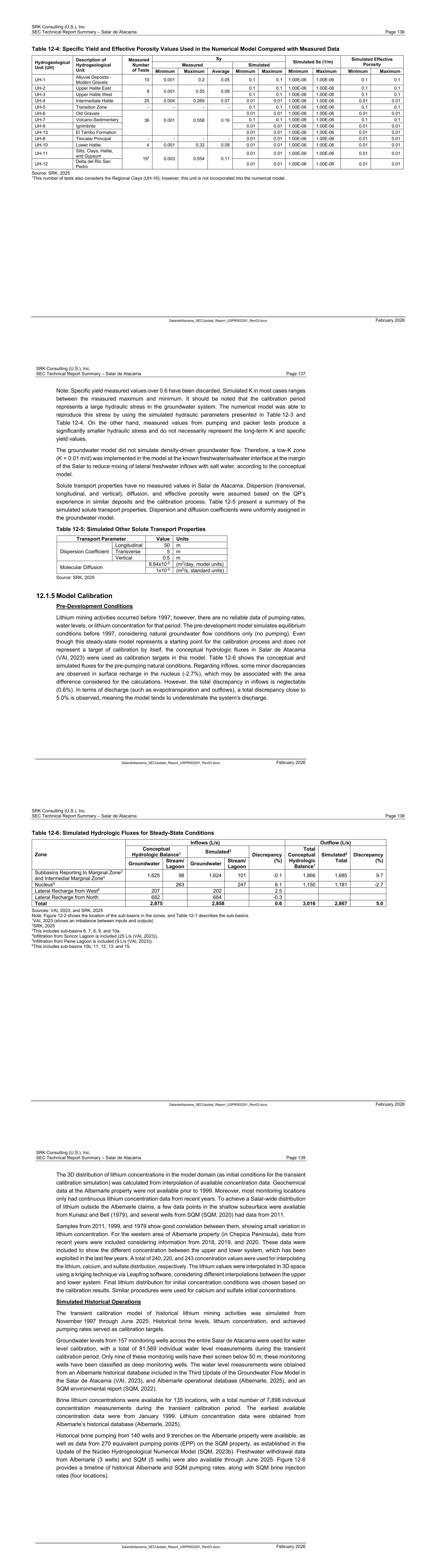 SRK Consulting (U.S.), Inc. SEC Technical Report Summary – Salar de Atacama Page 132 SalardeAtacama_SECUpdate_Report_USPR002291_Rev03.docx February 2026 Source: SRK, 2025 Note: Colors in Albemarle ponds are proportional to the leakage concentration (red represents high and yellow represents low). Figure 12-5: Solute-Transport Boundary Conditions 12.1.4 Hydraulic and Solute Transport Properties The hydrogeologic units specified in the model were derived from the conceptual hydrogeologic model developed using the Leapfrog Geo software and are described in Section 11.1. Aquifer parameters of hydraulic conductivity, specific yield, and specific storage, in addition to the transport parameter of effective porosity, are specified by HU in the model. SRK Consulting (U.S.), Inc. SEC Technical Report Summary – Salar de Atacama Page 133 SalardeAtacama_SECUpdate_Report_USPR002291_Rev03.docx February 2026 Horizontal hydraulic conductivity (Kh) values used in the model were derived from historical information from Albemarle (Gestionare, 2025) and as a result of the calibration processes. Table 12-3 shows a summary of hydraulic conductivity values measured per aquifer unit. Table 12-3 also presents the final values defined at the end of the calibration process (calibrated values). SRK Consulting (U.S.), Inc. SEC Technical Report Summary – Salar de Atacama Page 134 SalardeAtacama_SECUpdate_Report_USPR002291_Rev03.docx February 2026 Table 12-3: Hydraulic Conductivity Values Used in the Numerical Model Compared with Measured Data Hydrogeological Unit (UH)5 Description Measured (m/d) Calibrated (m/d) Number of Tests Minimum Maximum Median1 Minimum Maximum Median1 UH-1 Alluvial Deposits -Modern Gravels 18 0.29 558 8 0.13 57 2.23 UH-2 Upper Halite East 79 0.2 10,000 100 618 7110 1475 UH-3 Upper Halite West 26 0.4 500 3 3.9 10182 139 UH-4 Intermediate Halite 72 0.002 100 0.55 0.03 0.03 0.03 UH-5 Transition Zone 62 0.00099 416 3 0.2 3.2 0.8 UH-6 Old Gravels 5 7 26 16 14.0 14.0 14.0 UH-7 Volcano-Sedimentary 35 0.1 188 1.95 0.1 6.1 0.1 UH-8 Tilocalar Principal 1 0.05 0.05 0.05 1.2 1.2 1.2 UH-9 Ignimbrite 5 0.16 0.47 0.21 10.0 10.0 10.0 UH-10 Lower Halite 6 0.00046 0.74 0.07 0.1 0.1 0.1 UH-11 Silts, Clays, Halite, and Gypsum 14 0.09 5.45 0.9 0.1 0.1 0.1 UH-12 Delta del Rio San Pedro 6 0.00008 0.0004 0.00017 7.04 7.04 7.04 UH-13 El Tambo Formation - - - - 0.001 0.001 0.001 Source: SRK, 2025 1Median is the value in the middle of a set of measurements (also called 50th percentile); it was only used as a reference value (not used as a calibration target). 2Although the maximum conceptual value is 100 m/d (UH-3), during the calibration process it was necessary to increase the K value (close to 1,018 m/d) in the western sector (SQM) to achieve the required flow rates without encountering cell drying problems and numerical instability. However, the mean remains within the same order of magnitude. 3Although this value is slightly lower than the minimum defined in the tests, the minimum value of the conceptual range is 0.1 m/d. 4The calibrated value from the SRK (2022) model is maintained. 5The hydrogeological basement (UH-17) was not simulated because it was considered a no-flow boundary. In this update, some units were adjusted based on the new geological and hydrogeological model, incorporating in the numerical model an UH called Tilocalar Principal (UH-8). SRK Consulting (U.S.), Inc. SEC Technical Report Summary – Salar de Atacama Page 135 SalardeAtacama_SECUpdate_Report_USPR002291_Rev03.docx February 2026 Specific yields were also available in the historical records mentioned in Section 7. Specific yields used in the model were derived from those values and adjusted during the calibration process. Table 12-4 shows these models. No specific storage (Ss) values were measured in Salar de Atacama. Ss values used in the model were derived from the QP’s experience in similar deposits and as a result of the calibration process.