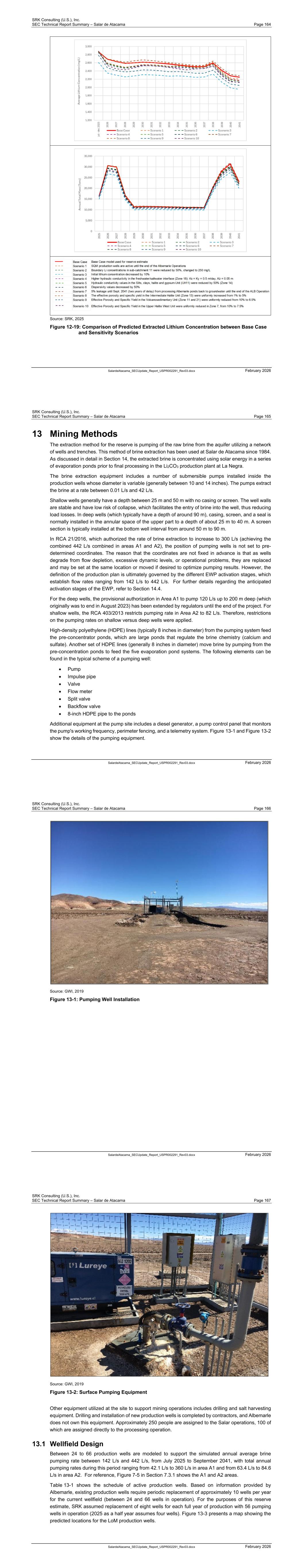 SRK Consulting (U.S.), Inc. SEC Technical Report Summary – Salar de Atacama Page 164 SalardeAtacama_SECUpdate_Report_USPR002291_Rev03.docx February 2026 Source: SRK, 2025 Figure 12-19: Comparison of Predicted Extracted Lithium Concentration between Base Case and Sensitivity Scenarios SRK Consulting (U.S.), Inc. SEC Technical Report Summary – Salar de Atacama Page 165 SalardeAtacama_SECUpdate_Report_USPR002291_Rev03.docx February 2026 13 Mining Methods The extraction method for the reserve is pumping of the raw brine from the aquifer utilizing a network of wells and trenches. This method of brine extraction has been used at Salar de Atacama since 1984. As discussed in detail in Section 14, the extracted brine is concentrated using solar energy in a series of evaporation ponds prior to final processing in the Li2CO3 production plant at La Negra. The brine extraction equipment includes a number of submersible pumps installed inside the production wells whose diameter is variable (generally between 10 and 14 inches). The pumps extract the brine at a rate between 0.01 L/s and 42 L/s. Shallow wells generally have a depth between 25 m and 50 m with no casing or screen. The well walls are stable and have low risk of collapse, which facilitates the entry of brine into the well, thus reducing load losses. In deep wells (which typically have a depth of around 90 m), casing, screen, and a seal is normally installed in the annular space of the upper part to a depth of about 25 m to 40 m. A screen section is typically installed at the bottom well interval from around 50 m to 90 m. In RCA 21/2016, which authorized the rate of brine extraction to increase to 300 L/s (achieving the combined 442 L/s combined in areas A1 and A2), the position of pumping wells is not set to pre- determined coordinates. The reason that the coordinates are not fixed in advance is that as wells degrade from flow depletion, excessive dynamic levels, or operational problems, they are replaced and may be set at the same location or moved if desired to optimize pumping results. However, the definition of the production plan is ultimately governed by the different EWP activation stages, which establish flow rates ranging from 142 L/s to 442 L/s. For further details regarding the anticipated activation stages of the EWP, refer to Section 14.4. For the deep wells, the provisional authorization in Area A1 to pump 120 L/s up to 200 m deep (which originally was to end in August 2023) has been extended by regulators until the end of the project. For shallow wells, the RCA 403/2013 restricts pumping rate in Area A2 to 82 L/s. Therefore, restrictions on the pumping rates on shallow versus deep wells were applied. High-density polyethylene (HDPE) lines (typically 8 inches in diameter) from the pumping system feed the pre-concentrator ponds, which are large ponds that regulate the brine chemistry (calcium and sulfate). Another set of HDPE lines (generally 8 inches in diameter) move brine by pumping from the pre-concentration ponds to feed the five evaporation pond systems. The following elements can be found in the typical scheme of a pumping well: Pump Impulse pipe Valve Flow meter Split valve Backflow valve 8-inch HDPE pipe to the ponds Additional equipment at the pump site includes a diesel generator, a pump control panel that monitors the pump's working frequency, perimeter fencing, and a telemetry system. Figure 13-1 and Figure 13-2 show the details of the pumping equipment. SRK Consulting (U.S.), Inc. SEC Technical Report Summary – Salar de Atacama Page 166 SalardeAtacama_SECUpdate_Report_USPR002291_Rev03.docx February 2026 Source: GWI, 2019 Figure 13-1: Pumping Well Installation SRK Consulting (U.S.), Inc. SEC Technical Report Summary – Salar de Atacama Page 167 SalardeAtacama_SECUpdate_Report_USPR002291_Rev03.docx February 2026 Source: GWI, 2019 Figure 13-2: Surface Pumping Equipment Other equipment utilized at the site to support mining operations includes drilling and salt harvesting equipment. Drilling and installation of new production wells is completed by contractors, and Albemarle does not own this equipment. Approximately 250 people are assigned to the Salar operations, 100 of which are assigned directly to the processing operation. 13.1 Wellfield Design Between 24 to 66 production wells are modeled to support the simulated annual average brine pumping rate between 142 L/s and 442 L/s, from July 2025 to September 2041, with total annual pumping rates during this period ranging from 42.1 L/s to 360 L/s in area A1 and from 63.4 L/s to 84.6 L/s in area A2. For reference, Figure 7-5 in Section 7.3.1 shows the A1 and A2 areas. Table 13-1 shows the schedule of active production wells. Based on information provided by Albemarle, existing production wells require periodic replacement of approximately 10 wells per year for the current wellfield (between 24 and 66 wells in operation). For the purposes of this reserve estimate, SRK assumed replacement of eight wells for each full year of production with 56 pumping wells in operation (2025 as a half year assumes four wells). Figure 13-3 presents a map showing the predicted locations for the LoM production wells.