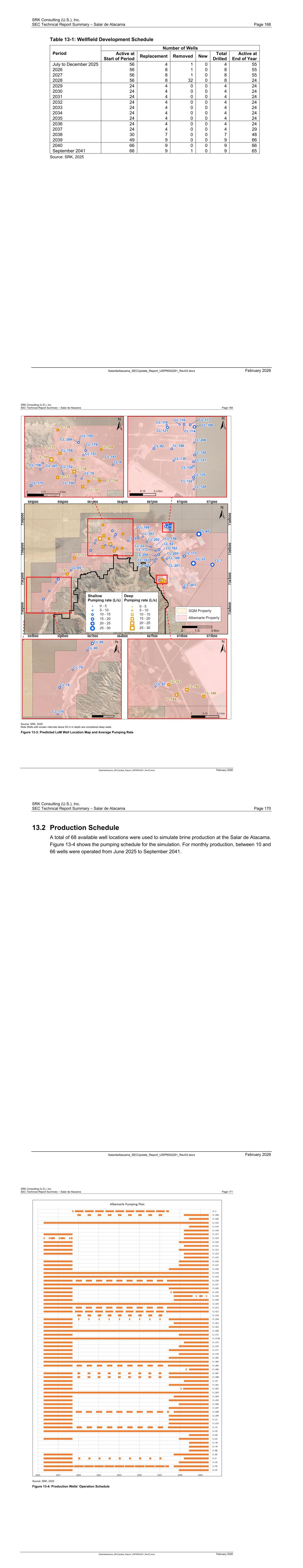 SRK Consulting (U.S.), Inc. SEC Technical Report Summary – Salar de Atacama Page 168 SalardeAtacama_SECUpdate_Report_USPR002291_Rev03.docx February 2026 Table 13-1: Wellfield Development Schedule Period Number of Wells Active at Start of Period Replacement Removed New Total Drilled Active at End of Year July to December 2025 56 4 1 0 4 55 2026 56 8 1 0 8 55 2027 56 8 1 0 8 55 2028 56 8 32 0 8 24 2029 24 4 0 0 4 24 2030 24 4 0 0 4 24 2031 24 4 0 0 4 24 2032 24 4 0 0 4 24 2033 24 4 0 0 4 24 2034 24 4 0 0 4 24 2035 24 4 0 0 4 24 2036 24 4 0 0 4 24 2037 24 4 0 0 4 29 2038 30 7 0 0 7 48 2039 49 9 0 0 9 66 2040 66 9 0 0 9 66 September 2041 66 9 1 0 9 65 Source: SRK, 2025 SRK Consulting (U.S.), Inc. SEC Technical Report Summary – Salar de Atacama Page 169 SalardeAtacama_SECUpdate_Report_USPR002291_Rev03.docx February 2026 Source: SRK, 2025 Note Wells with screen intervals below 50 m in depth are considered deep wells. Figure 13-3: Predicted LoM Well Location Map and Average Pumping Rate SRK Consulting (U.S.), Inc. SEC Technical Report Summary – Salar de Atacama Page 170 SalardeAtacama_SECUpdate_Report_USPR002291_Rev03.docx February 2026 13.2 Production Schedule A total of 68 available well locations were used to simulate brine production at the Salar de Atacama. Figure 13-4 shows the pumping schedule for the simulation. For monthly production, between 10 and 66 wells were operated from June 2025 to September 2041. SRK Consulting (U.S.), Inc. SEC Technical Report Summary – Salar de Atacama Page 171 SalardeAtacama_SECUpdate_Report_USPR002291_Rev03.docx February 2026 Source: SRK, 2025 Figure 13-4: Production Wells’ Operation Schedule