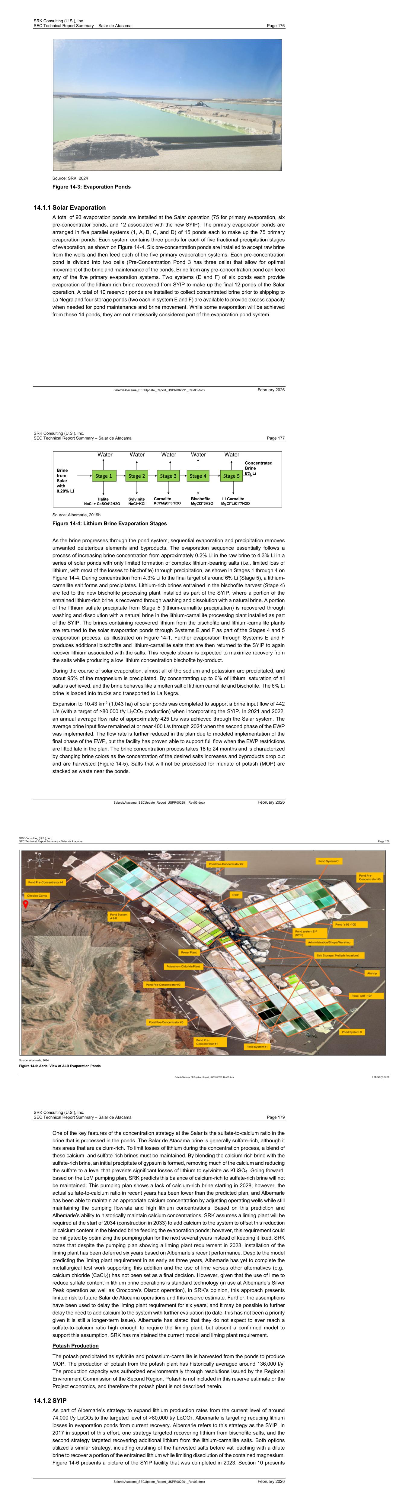 SRK Consulting (U.S.), Inc. SEC Technical Report Summary – Salar de Atacama Page 176 SalardeAtacama_SECUpdate_Report_USPR002291_Rev03.docx February 2026 Source: SRK, 2024 Figure 14-3: Evaporation Ponds 14.1.1 Solar Evaporation A total of 93 evaporation ponds are installed at the Salar operation (75 for primary evaporation, six pre-concentrator ponds, and 12 associated with the new SYIP). The primary evaporation ponds are arranged in five parallel systems (1, A, B, C, and D) of 15 ponds each to make up the 75 primary evaporation ponds. Each system contains three ponds for each of five fractional precipitation stages of evaporation, as shown on Figure 14-4. Six pre-concentration ponds are installed to accept raw brine from the wells and then feed each of the five primary evaporation systems. Each pre-concentration pond is divided into two cells (Pre-Concentration Pond 3 has three cells) that allow for optimal movement of the brine and maintenance of the ponds. Brine from any pre-concentration pond can feed any of the five primary evaporation systems. Two systems (E and F) of six ponds each provide evaporation of the lithium rich brine recovered from SYIP to make up the final 12 ponds of the Salar operation. A total of 10 reservoir ponds are installed to collect concentrated brine prior to shipping to La Negra and four storage ponds (two each in system E and F) are available to provide excess capacity when needed for pond maintenance and brine movement. While some evaporation will be achieved from these 14 ponds, they are not necessarily considered part of the evaporation pond system. SRK Consulting (U.S.), Inc. SEC Technical Report Summary – Salar de Atacama Page 177 SalardeAtacama_SECUpdate_Report_USPR002291_Rev03.docx February 2026 Source: Albemarle, 2019b Figure 14-4: Lithium Brine Evaporation Stages As the brine progresses through the pond system, sequential evaporation and precipitation removes unwanted deleterious elements and byproducts. The evaporation sequence essentially follows a process of increasing brine concentration from approximately 0.2% Li in the raw brine to 4.3% Li in a series of solar ponds with only limited formation of complex lithium-bearing salts (i.e., limited loss of lithium, with most of the losses to bischofite) through precipitation, as shown in Stages 1 through 4 on Figure 14-4. During concentration from 4.3% Li to the final target of around 6% Li (Stage 5), a lithium- carnallite salt forms and precipitates. Lithium-rich brines entrained in the bischofite harvest (Stage 4) are fed to the new bischofite processing plant installed as part of the SYIP, where a portion of the entrained lithium-rich brine is recovered through washing and dissolution with a natural brine. A portion of the lithium sulfate precipitate from Stage 5 (lithium-carnallite precipitation) is recovered through washing and dissolution with a natural brine in the lithium-carnallite processing plant installed as part of the SYIP. The brines containing recovered lithium from the bischofite and lithium-carnallite plants are returned to the solar evaporation ponds through Systems E and F as part of the Stages 4 and 5 evaporation process, as illustrated on Figure 14-1. Further evaporation through Systems E and F produces additional bischofite and lithium-carnallite salts that are then returned to the SYIP to again recover lithium associated with the salts. This recycle stream is expected to maximize recovery from the salts while producing a low lithium concentration bischofite by-product. During the course of solar evaporation, almost all of the sodium and potassium are precipitated, and about 95% of the magnesium is precipitated. By concentrating up to 6% of lithium, saturation of all salts is achieved, and the brine behaves like a molten salt of lithium carnallite and bischofite. The 6% Li brine is loaded into trucks and transported to La Negra. Expansion to 10.43 km2 (1,043 ha) of solar ponds was completed to support a brine input flow of 442 L/s (with a target of >80,000 t/y Li2CO3 production) when incorporating the SYIP. In 2021 and 2022, an annual average flow rate of approximately 425 L/s was achieved through the Salar system. The average brine input flow remained at or near 400 L/s through 2024 when the second phase of the EWP was implemented. The flow rate is further reduced in the plan due to modeled implementation of the final phase of the EWP, but the facility has proven able to support full flow when the EWP restrictions are lifted late in the plan. The brine concentration process takes 18 to 24 months and is characterized by changing brine colors as the concentration of the desired salts increases and byproducts drop out and are harvested (Figure 14-5). Salts that will not be processed for muriate of potash (MOP) are stacked as waste near the ponds. Stage 1 Stage 2 Stage 3 Stage 4 Stage 5 Brine from Salar with 0.20% Li Halite NaCl + CaSO4*2H2O Sylvinite NaCl+KCl Carnalite KCl*MgCl*6*H2O Bischofite MgCl2*6H2O Li Carnalite MgCl*LiCl*7H2O Concentrated Brine 6% Li Water Water Water Water Water SRK Consulting (U.S.), Inc. SEC Technical Report Summary – Salar de Atacama Page 178 SalardeAtacama_SECUpdate_Report_USPR002291_Rev03.docx February 2026 Source: Albemarle, 2024 Figure 14-5: Aerial View of ALB Evaporation Ponds SRK Consulting (U.S.), Inc. SEC Technical Report Summary – Salar de Atacama Page 179 SalardeAtacama_SECUpdate_Report_USPR002291_Rev03.docx February 2026 One of the key features of the concentration strategy at the Salar is the sulfate-to-calcium ratio in the brine that is processed in the ponds. The Salar de Atacama brine is generally sulfate-rich, although it has areas that are calcium-rich. To limit losses of lithium during the concentration process, a blend of these calcium- and sulfate-rich brines must be maintained. By blending the calcium-rich brine with the sulfate-rich brine, an initial precipitate of gypsum is formed, removing much of the calcium and reducing