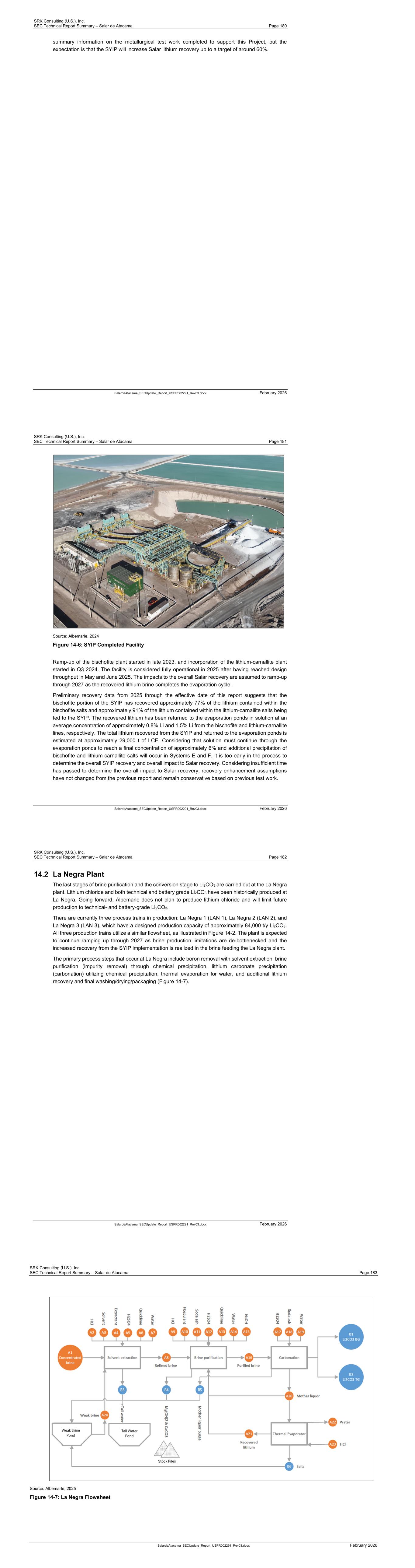 SRK Consulting (U.S.), Inc. SEC Technical Report Summary – Salar de Atacama Page 180 SalardeAtacama_SECUpdate_Report_USPR002291_Rev03.docx February 2026 summary information on the metallurgical test work completed to support this Project, but the expectation is that the SYIP will increase Salar lithium recovery up to a target of around 60%. SRK Consulting (U.S.), Inc. SEC Technical Report Summary – Salar de Atacama Page 181 SalardeAtacama_SECUpdate_Report_USPR002291_Rev03.docx February 2026 Source: Albemarle, 2024 Figure 14-6: SYIP Completed Facility Ramp-up of the bischofite plant started in late 2023, and incorporation of the lithium-carnallite plant started in Q3 2024. The facility is considered fully operational in 2025 after having reached design throughput in May and June 2025. The impacts to the overall Salar recovery are assumed to ramp-up through 2027 as the recovered lithium brine completes the evaporation cycle. Preliminary recovery data from 2025 through the effective date of this report suggests that the bischofite portion of the SYIP has recovered approximately 77% of the lithium contained within the bischofite salts and approximately 91% of the lithium contained within the lithium-carnallite salts being fed to the SYIP. The recovered lithium has been returned to the evaporation ponds in solution at an average concentration of approximately 0.8% Li and 1.5% Li from the bischofite and lithium-carnallite lines, respectively. The total lithium recovered from the SYIP and returned to the evaporation ponds is estimated at approximately 29,000 t of LCE. Considering that solution must continue through the evaporation ponds to reach a final concentration of approximately 6% and additional precipitation of bischofite and lithium-carnallite salts will occur in Systems E and F, it is too early in the process to determine the overall SYIP recovery and overall impact to Salar recovery. Considering insufficient time has passed to determine the overall impact to Salar recovery, recovery enhancement assumptions have not changed from the previous report and remain conservative based on previous test work. SRK Consulting (U.S.), Inc. SEC Technical Report Summary – Salar de Atacama Page 182 SalardeAtacama_SECUpdate_Report_USPR002291_Rev03.docx February 2026 14.2 La Negra Plant The last stages of brine purification and the conversion stage to Li2CO3 are carried out at the La Negra plant. Lithium chloride and both technical and battery grade Li2CO3 have been historically produced at La Negra. Going forward, Albemarle does not plan to produce lithium chloride and will limit future production to technical- and battery-grade Li2CO3. There are currently three process trains in production: La Negra 1 (LAN 1), La Negra 2 (LAN 2), and La Negra 3 (LAN 3), which have a designed production capacity of approximately 84,000 t/y Li2CO3. All three production trains utilize a similar flowsheet, as illustrated in Figure 14-2. The plant is expected to continue ramping up through 2027 as brine production limitations are de-bottlenecked and the increased recovery from the SYIP implementation is realized in the brine feeding the La Negra plant. The primary process steps that occur at La Negra include boron removal with solvent extraction, brine purification (impurity removal) through chemical precipitation, lithium carbonate precipitation (carbonation) utilizing chemical precipitation, thermal evaporation for water, and additional lithium recovery and final washing/drying/packaging (Figure 14-7). SRK Consulting (U.S.), Inc. SEC Technical Report Summary – Salar de Atacama Page 183 SalardeAtacama_SECUpdate_Report_USPR002291_Rev03.docx February 2026 Source: Albemarle, 2025 Figure 14-7: La Negra Flowsheet