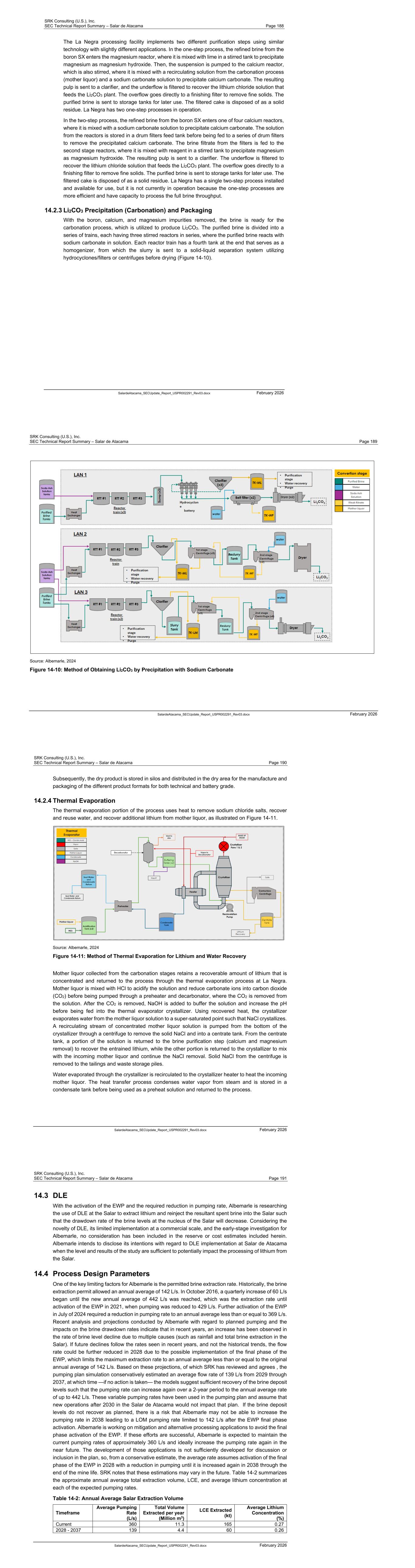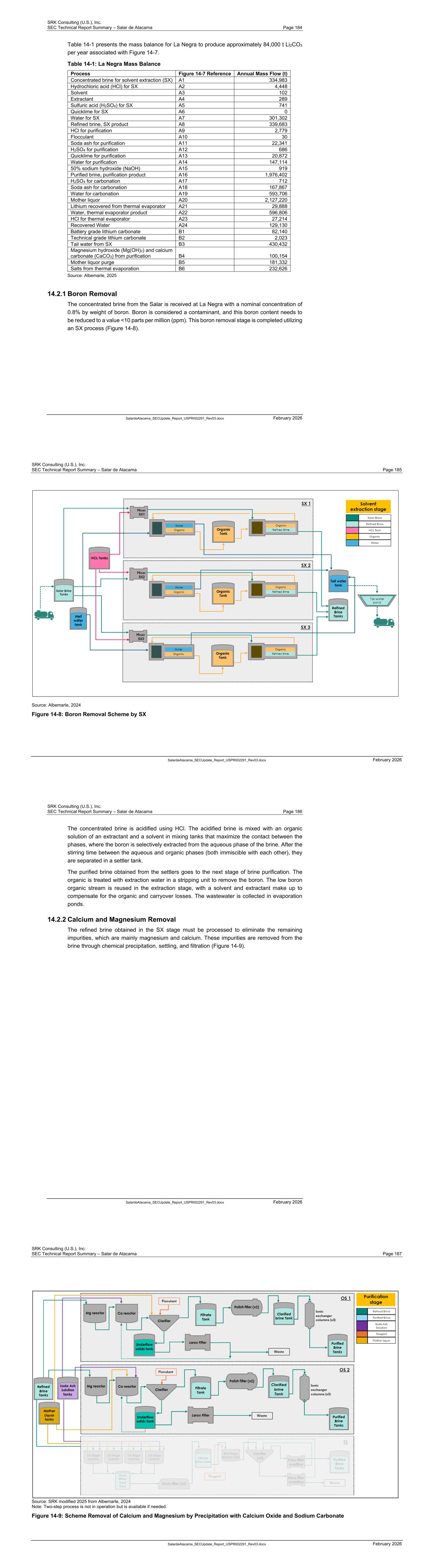SRK Consulting (U.S.), Inc. SEC Technical Report Summary – Salar de Atacama Page 184 SalardeAtacama_SECUpdate_Report_USPR002291_Rev03.docx February 2026 Table 14-1 presents the mass balance for La Negra to produce approximately 84,000 t Li2CO3 per year associated with Figure 14-7. Table 14-1: La Negra Mass Balance Process Figure 14-7 Reference Annual Mass Flow (t) Concentrated brine for solvent extraction (SX) A1 334,983 Hydrochloric acid (HCl) for SX A2 4,448 Solvent A3 102 Extractant A4 289 Sulfuric acid (H2SO4) for SX A5 741 Quicklime for SX A6 0 Water for SX A7 301,302 Refined brine, SX product A8 339,683 HCl for purification A9 2,779 Flocculant A10 30 Soda ash for purification A11 22,341 H2SO4 for purification A12 686 Quicklime for purification A13 20,872 Water for purification A14 147,114 50% sodium hydroxide (NaOH) A15 919 Purified brine, purification product A16 1,976,402 H2SO4 for carbonation A17 712 Soda ash for carbonation A18 167,867 Water for carbonation A19 593,706 Mother liquor A20 2,127,220 Lithium recovered from thermal evaporator A21 29,888 Water, thermal evaporator product A22 596,806 HCl for thermal evaporator A23 27,214 Recovered Water A24 129,130 Battery grade lithium carbonate B1 82,140 Technical grade lithium carbonate B2 2,023 Tail water from SX B3 430,432 Magnesium hydroxide (Mg(OH)2) and calcium carbonate (CaCO3) from purification B4 100,154 Mother liquor purge B5 181,332 Salts from thermal evaporation B6 232,626 Source: Albemarle, 2025 14.2.1 Boron Removal The concentrated brine from the Salar is received at La Negra with a nominal concentration of 0.8% by weight of boron. Boron is considered a contaminant, and this boron content needs to be reduced to a value <10 parts per million (ppm). This boron removal stage is completed utilizing an SX process (Figure 14-8). SRK Consulting (U.S.), Inc. SEC Technical Report Summary – Salar de Atacama Page 185 SalardeAtacama_SECUpdate_Report_USPR002291_Rev03.docx February 2026 Source: Albemarle, 2024 Figure 14-8: Boron Removal Scheme by SX SRK Consulting (U.S.), Inc. SEC Technical Report Summary – Salar de Atacama Page 186 SalardeAtacama_SECUpdate_Report_USPR002291_Rev03.docx February 2026 The concentrated brine is acidified using HCl. The acidified brine is mixed with an organic solution of an extractant and a solvent in mixing tanks that maximize the contact between the phases, where the boron is selectively extracted from the aqueous phase of the brine. After the stirring time between the aqueous and organic phases (both immiscible with each other), they are separated in a settler tank. The purified brine obtained from the settlers goes to the next stage of brine purification. The organic is treated with extraction water in a stripping unit to remove the boron. The low boron organic stream is reused in the extraction stage, with a solvent and extractant make up to compensate for the organic and carryover losses. The wastewater is collected in evaporation ponds. 14.2.2 Calcium and Magnesium Removal The refined brine obtained in the SX stage must be processed to eliminate the remaining impurities, which are mainly magnesium and calcium. These impurities are removed from the brine through chemical precipitation, settling, and filtration (Figure 14-9). SRK Consulting (U.S.), Inc. SEC Technical Report Summary – Salar de Atacama Page 187 SalardeAtacama_SECUpdate_Report_USPR002291_Rev03.docx February 2026 Source: SRK modified 2025 from Albemarle, 2024 Note: Two-step process is not in operation but is available if needed. Figure 14-9: Scheme Removal of Calcium and Magnesium by Precipitation with Calcium Oxide and Sodium Carbonate