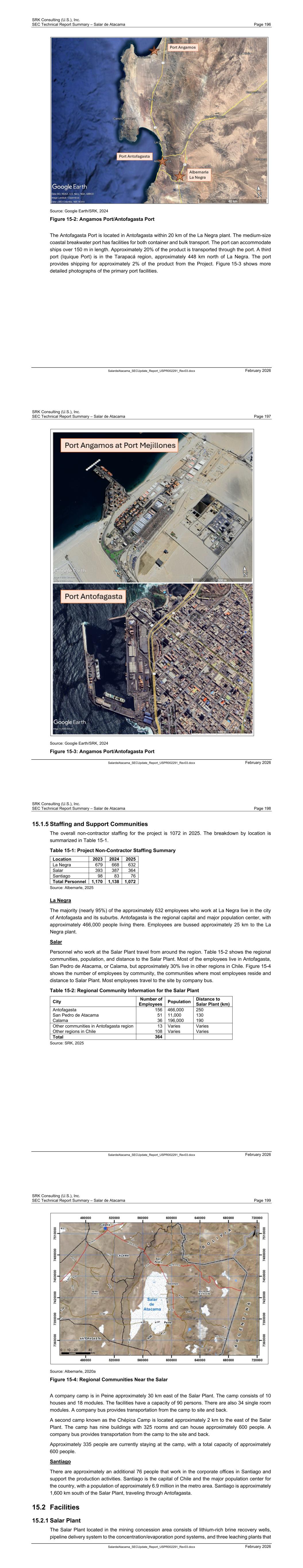 SRK Consulting (U.S.), Inc. SEC Technical Report Summary – Salar de Atacama Page 196 SalardeAtacama_SECUpdate_Report_USPR002291_Rev03.docx February 2026 Source: Google Earth/SRK, 2024 Figure 15-2: Angamos Port/Antofagasta Port The Antofagasta Port is located in Antofagasta within 20 km of the La Negra plant. The medium-size coastal breakwater port has facilities for both container and bulk transport. The port can accommodate ships over 150 m in length. Approximately 20% of the product is transported through the port. A third port (Iquique Port) is in the Tarapacá region, approximately 448 km north of La Negra. The port provides shipping for approximately 2% of the product from the Project. Figure 15-3 shows more detailed photographs of the primary port facilities. SRK Consulting (U.S.), Inc. SEC Technical Report Summary – Salar de Atacama Page 197 SalardeAtacama_SECUpdate_Report_USPR002291_Rev03.docx February 2026 Source: Google Earth/SRK, 2024 Figure 15-3: Angamos Port/Antofagasta Port SRK Consulting (U.S.), Inc. SEC Technical Report Summary – Salar de Atacama Page 198 SalardeAtacama_SECUpdate_Report_USPR002291_Rev03.docx February 2026 15.1.5 Staffing and Support Communities The overall non-contractor staffing for the project is 1072 in 2025. The breakdown by location is summarized in Table 15-1. Table 15-1: Project Non-Contractor Staffing Summary Location 2023 2024 2025 La Negra 679 668 632 Salar 393 387 364 Santiago 98 83 76 Total Personnel 1,170 1,138 1,072 Source: Albemarle, 2025 La Negra The majority (nearly 95%) of the approximately 632 employees who work at La Negra live in the city of Antofagasta and its suburbs. Antofagasta is the regional capital and major population center, with approximately 466,000 people living there. Employees are bussed approximately 25 km to the La Negra plant. Salar Personnel who work at the Salar Plant travel from around the region. Table 15-2 shows the regional communities, population, and distance to the Salar Plant. Most of the employees live in Antofagasta, San Pedro de Atacama, or Calama, but approximately 30% live in other regions in Chile. Figure 15-4 shows the number of employees by community, the communities where most employees reside and distance to Salar Plant. Most employees travel to the site by company bus. Table 15-2: Regional Community Information for the Salar Plant City Number of Employees Population Distance to Salar Plant (km) Antofagasta 156 466,000 250 San Pedro de Atacama 51 11,000 130 Calama 36 196,000 190 Other communities in Antofagasta region 13 Varies Varies Other regions in Chile 108 Varies Varies Total 364 Source: SRK, 2025 SRK Consulting (U.S.), Inc. SEC Technical Report Summary – Salar de Atacama Page 199 SalardeAtacama_SECUpdate_Report_USPR002291_Rev03.docx February 2026 Source: Albemarle, 2020a Figure 15-4: Regional Communities Near the Salar A company camp is in Peine approximately 30 km east of the Salar Plant. The camp consists of 10 houses and 18 modules. The facilities have a capacity of 90 persons. There are also 34 single room modules. A company bus provides transportation from the camp to site and back. A second camp known as the Chépica Camp is located approximately 2 km to the east of the Salar Plant. The camp has nine buildings with 325 rooms and can house approximately 600 people. A company bus provides transportation from the camp to the site and back. Approximately 335 people are currently staying at the camp, with a total capacity of approximately 600 people. Santiago There are approximately an additional 76 people that work in the corporate offices in Santiago and support the production activities. Santiago is the capital of Chile and the major population center for the country, with a population of approximately 6.9 million in the metro area. Santiago is approximately 1,600 km south of the Salar Plant, traveling through Antofagasta. 15.2 Facilities 15.2.1 Salar Plant The Salar Plant located in the mining concession area consists of lithium-rich brine recovery wells, pipeline delivery system to the concentration/evaporation pond systems, and three leaching plants that