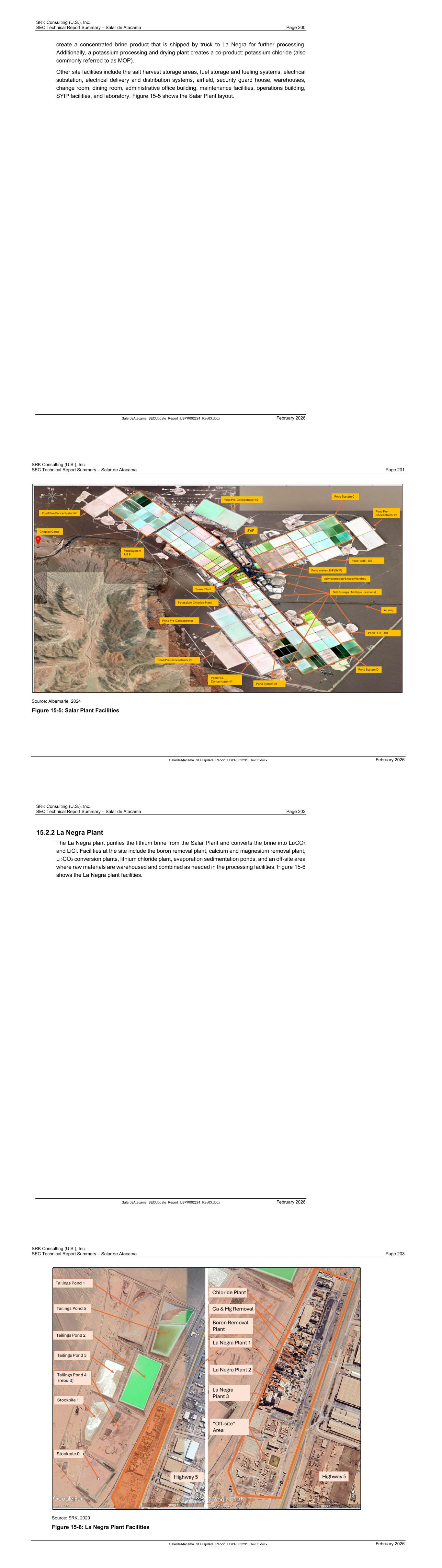 SRK Consulting (U.S.), Inc. SEC Technical Report Summary – Salar de Atacama Page 200 SalardeAtacama_SECUpdate_Report_USPR002291_Rev03.docx February 2026 create a concentrated brine product that is shipped by truck to La Negra for further processing. Additionally, a potassium processing and drying plant creates a co-product: potassium chloride (also commonly referred to as MOP). Other site facilities include the salt harvest storage areas, fuel storage and fueling systems, electrical substation, electrical delivery and distribution systems, airfield, security guard house, warehouses, change room, dining room, administrative office building, maintenance facilities, operations building, SYIP facilities, and laboratory. Figure 15-5 shows the Salar Plant layout. SRK Consulting (U.S.), Inc. SEC Technical Report Summary – Salar de Atacama Page 201 SalardeAtacama_SECUpdate_Report_USPR002291_Rev03.docx February 2026 Source: Albemarle, 2024 Figure 15-5: Salar Plant Facilities SRK Consulting (U.S.), Inc. SEC Technical Report Summary – Salar de Atacama Page 202 SalardeAtacama_SECUpdate_Report_USPR002291_Rev03.docx February 2026 15.2.2 La Negra Plant The La Negra plant purifies the lithium brine from the Salar Plant and converts the brine into Li2CO3 and LiCl. Facilities at the site include the boron removal plant, calcium and magnesium removal plant, Li2CO3 conversion plants, lithium chloride plant, evaporation sedimentation ponds, and an off-site area where raw materials are warehoused and combined as needed in the processing facilities. Figure 15-6 shows the La Negra plant facilities. SRK Consulting (U.S.), Inc. SEC Technical Report Summary – Salar de Atacama Page 203 SalardeAtacama_SECUpdate_Report_USPR002291_Rev03.docx February 2026 Source: SRK, 2020 Figure 15-6: La Negra Plant Facilities