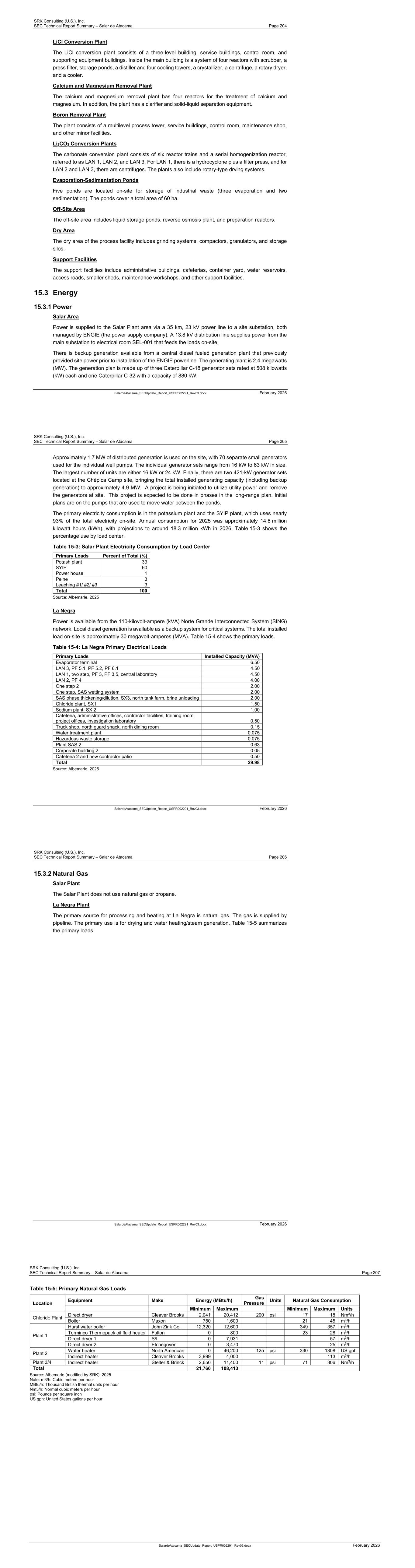 SRK Consulting (U.S.), Inc. SEC Technical Report Summary – Salar de Atacama Page 204 SalardeAtacama_SECUpdate_Report_USPR002291_Rev03.docx February 2026 LiCl Conversion Plant The LiCl conversion plant consists of a three-level building, service buildings, control room, and supporting equipment buildings. Inside the main building is a system of four reactors with scrubber, a press filter, storage ponds, a distiller and four cooling towers, a crystallizer, a centrifuge, a rotary dryer, and a cooler. Calcium and Magnesium Removal Plant The calcium and magnesium removal plant has four reactors for the treatment of calcium and magnesium. In addition, the plant has a clarifier and solid-liquid separation equipment. Boron Removal Plant The plant consists of a multilevel process tower, service buildings, control room, maintenance shop, and other minor facilities. Li2CO3 Conversion Plants The carbonate conversion plant consists of six reactor trains and a serial homogenization reactor, referred to as LAN 1, LAN 2, and LAN 3. For LAN 1, there is a hydrocyclone plus a filter press, and for LAN 2 and LAN 3, there are centrifuges. The plants also include rotary-type drying systems. Evaporation-Sedimentation Ponds Five ponds are located on-site for storage of industrial waste (three evaporation and two sedimentation). The ponds cover a total area of 60 ha. Off-Site Area The off-site area includes liquid storage ponds, reverse osmosis plant, and preparation reactors. Dry Area The dry area of the process facility includes grinding systems, compactors, granulators, and storage silos. Support Facilities The support facilities include administrative buildings, cafeterias, container yard, water reservoirs, access roads, smaller sheds, maintenance workshops, and other support facilities. 15.3 Energy 15.3.1 Power Salar Area Power is supplied to the Salar Plant area via a 35 km, 23 kV power line to a site substation, both managed by ENGIE (the power supply company). A 13.8 kV distribution line supplies power from the main substation to electrical room SEL-001 that feeds the loads on-site. There is backup generation available from a central diesel fueled generation plant that previously provided site power prior to installation of the ENGIE powerline. The generating plant is 2.4 megawatts (MW). The generation plan is made up of three Caterpillar C-18 generator sets rated at 508 kilowatts (kW) each and one Caterpillar C-32 with a capacity of 880 kW. SRK Consulting (U.S.), Inc. SEC Technical Report Summary – Salar de Atacama Page 205 SalardeAtacama_SECUpdate_Report_USPR002291_Rev03.docx February 2026 Approximately 1.7 MW of distributed generation is used on the site, with 70 separate small generators used for the individual well pumps. The individual generator sets range from 16 kW to 63 kW in size. The largest number of units are either 16 kW or 24 kW. Finally, there are two 421-kW generator sets located at the Chépica Camp site, bringing the total installed generating capacity (including backup generation) to approximately 4.9 MW. A project is being initiated to utilize utility power and remove the generators at site. This project is expected to be done in phases in the long-range plan. Initial plans are on the pumps that are used to move water between the ponds. The primary electricity consumption is in the potassium plant and the SYIP plant, which uses nearly 93% of the total electricity on-site. Annual consumption for 2025 was approximately 14.8 million kilowatt hours (kWh), with projections to around 18.3 million kWh in 2026. Table 15-3 shows the percentage use by load center. Table 15-3: Salar Plant Electricity Consumption by Load Center Primary Loads Percent of Total (%) Potash plant 33 SYIP 60 Power house 1 Peine 3 Leaching #1/ #2/ #3 3 Total 100 Source: Albemarle, 2025 La Negra Power is available from the 110-kilovolt-ampere (kVA) Norte Grande Interconnected System (SING) network. Local diesel generation is available as a backup system for critical systems. The total installed load on-site is approximately 30 megavolt-amperes (MVA). Table 15-4 shows the primary loads. Table 15-4: La Negra Primary Electrical Loads Primary Loads Installed Capacity (MVA) Evaporator terminal 6.50 LAN 3, PF 5.1, PF 5.2, PF 6.1 4.50 LAN 1, two step, PF 3, PF 3.5, central laboratory 4.50 LAN 2, PF 4 4.00 One step 2 2.00 One step, SAS wetting system 2.00 SAS phase thickening/dilution, SX3, north tank farm, brine unloading 2.00 Chloride plant, SX1 1.50 Sodium plant, SX 2 1.00 Cafeteria, administrative offices, contractor facilities, training room, project offices, investigation laboratory 0.50 Truck shop, north guard shack, north dining room 0.15 Water treatment plant 0.075 Hazardous waste storage 0.075 Plant SAS 2 0.63 Corporate building 2 0.05 Cafeteria 2 and new contractor patio 0.50 Total 29.98 Source: Albemarle, 2025 SRK Consulting (U.S.), Inc. SEC Technical Report Summary – Salar de Atacama Page 206 SalardeAtacama_SECUpdate_Report_USPR002291_Rev03.docx February 2026 15.3.2 Natural Gas Salar Plant The Salar Plant does not use natural gas or propane. La Negra Plant The primary source for processing and heating at La Negra is natural gas. The gas is supplied by pipeline. The primary use is for drying and water heating/steam generation. Table 15-5 summarizes the primary loads. SRK Consulting (U.S.), Inc. SEC Technical Report Summary – Salar de Atacama Page 207 SalardeAtacama_SECUpdate_Report_USPR002291_Rev03.docx February 2026 Table 15-5: Primary Natural Gas Loads Location Equipment Make Energy (MBtu/h) Gas Pressure Units Natural Gas Consumption Minimum Maximum Minimum Maximum Units Chloride Plant Direct dryer Cleaver Brooks 2,041 20,412 200 psi 17 18 Nm3/h Boiler Maxon 750 1,600 21 45 m3/h Plant 1 Hurst water boiler John Zink Co. 12,320 12,600 349 357 m3/h Terminco Thermopack oil fluid heater Fulton 0 800 23 28 m3/h Direct dryer 1 S/I 0 7,931 57 m3/h Direct dryer 2 Etchegoyen 0 3,470 25 m3/h Plant 2 Water heater Nort