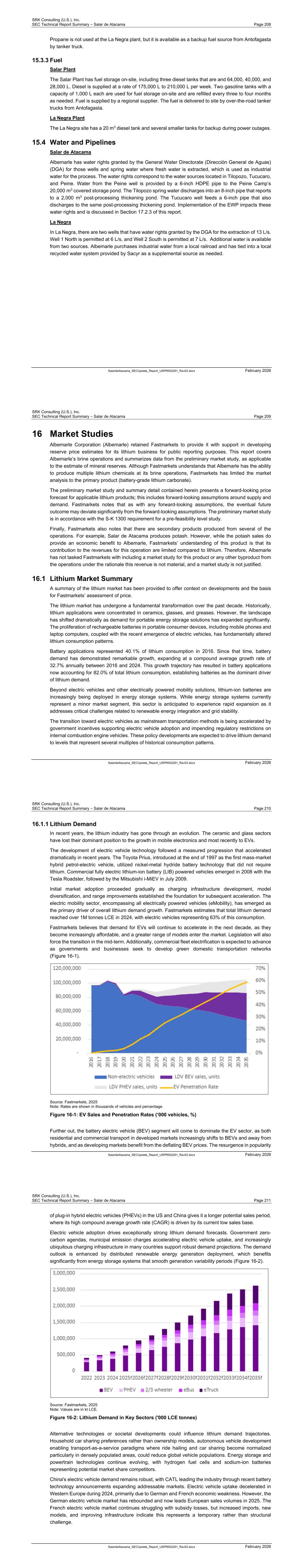 SRK Consulting (U.S.), Inc. SEC Technical Report Summary – Salar de Atacama Page 208 SalardeAtacama_SECUpdate_Report_USPR002291_Rev03.docx February 2026 Propane is not used at the La Negra plant, but it is available as a backup fuel source from Antofagasta by tanker truck. 15.3.3 Fuel Salar Plant The Salar Plant has fuel storage on-site, including three diesel tanks that are and 64,000, 40,000, and 28,000 L. Diesel is supplied at a rate of 175,000 L to 210,000 L per week. Two gasoline tanks with a capacity of 1,000 L each are used for fuel storage on-site and are refilled every three to four months as needed. Fuel is supplied by a regional supplier. The fuel is delivered to site by over-the-road tanker trucks from Antofagasta. La Negra Plant The La Negra site has a 20 m3 diesel tank and several smaller tanks for backup during power outages. 15.4 Water and Pipelines Salar de Atacama Albemarle has water rights granted by the General Water Directorate (Dirección General de Aguas) (DGA) for those wells and spring water where fresh water is extracted, which is used as industrial water for the process. The water rights correspond to the water sources located in Tilopozo, Tucucaro, and Peine. Water from the Peine well is provided by a 6-inch HDPE pipe to the Peine Camp’s 20,000 m3 covered storage pond. The Tilopozo spring water discharges into an 8-inch pipe that reports to a 2,000 m3 post-processing thickening pond. The Tucucaro well feeds a 6-inch pipe that also discharges to the same post-processing thickening pond. Implementation of the EWP impacts these water rights and is discussed in Section 17.2.3 of this report. La Negra In La Negra, there are two wells that have water rights granted by the DGA for the extraction of 13 L/s. Well 1 North is permitted at 6 L/s, and Well 2 South is permitted at 7 L/s. Additional water is available from two sources. Albemarle purchases industrial water from a local railroad and has tied into a local recycled water system provided by Sacyr as a supplemental source as needed. SRK Consulting (U.S.), Inc. SEC Technical Report Summary – Salar de Atacama Page 209 SalardeAtacama_SECUpdate_Report_USPR002291_Rev03.docx February 2026 16 Market Studies Albemarle Corporation (Albemarle) retained Fastmarkets to provide it with support in developing reserve price estimates for its lithium business for public reporting purposes. This report covers Albemarle’s brine operations and summarizes data from the preliminary market study, as applicable to the estimate of mineral reserves. Although Fastmarkets understands that Albemarle has the ability to produce multiple lithium chemicals at its brine operations, Fastmarkets has limited the market analysis to the primary product (battery-grade lithium carbonate). The preliminary market study and summary detail contained herein presents a forward-looking price forecast for applicable lithium products; this includes forward-looking assumptions around supply and demand. Fastmarkets notes that as with any forward-looking assumptions, the eventual future outcome may deviate significantly from the forward-looking assumptions. The preliminary market study is in accordance with the S-K 1300 requirement for a pre-feasibility level study. Finally, Fastmarkets also notes that there are secondary products produced from several of the operations. For example, Salar de Atacama produces potash. However, while the potash sales do provide an economic benefit to Albemarle, Fastmarkets’ understanding of this product is that its contribution to the revenues for this operation are limited compared to lithium. Therefore, Albemarle has not tasked Fastmarkets with including a market study for this product or any other byproduct from the operations under the rationale this revenue is not material, and a market study is not justified. 16.1 Lithium Market Summary A summary of the lithium market has been provided to offer context on developments and the basis for Fastmarkets’ assessment of price. The lithium market has undergone a fundamental transformation over the past decade. Historically, lithium applications were concentrated in ceramics, glasses, and greases. However, the landscape has shifted dramatically as demand for portable energy storage solutions has expanded significantly. The proliferation of rechargeable batteries in portable consumer devices, including mobile phones and laptop computers, coupled with the recent emergence of electric vehicles, has fundamentally altered lithium consumption patterns. Battery applications represented 40.1% of lithium consumption in 2016. Since that time, battery demand has demonstrated remarkable growth, expanding at a compound average growth rate of 32.7% annually between 2016 and 2024. This growth trajectory has resulted in battery applications now accounting for 82.0% of total lithium consumption, establishing batteries as the dominant driver of lithium demand. Beyond electric vehicles and other electrically powered mobility solutions, lithium-ion batteries are increasingly being deployed in energy storage systems. While energy storage systems currently represent a minor market segment, this sector is anticipated to experience rapid expansion as it addresses critical challenges related to renewable energy integration and grid stability. The transition toward electric vehicles as mainstream transportation methods is being accelerated by government incentives supporting electric vehicle adoption and impending regulatory restrictions on internal combustion engine vehicles. These policy developments are expected to drive lithium demand to levels that represent several multiples of historical consumption patterns. SRK Consulting (U.S.), Inc. SEC Technical Report Summary – Salar de Atacama Page 210 SalardeAtacama_SECUpdate_Report_USPR002291_Rev03.docx February 2026 16.1.1 Lithium Demand In recent years, the lithium industry has gone through an evolution. The ceramic and glass sectors have lost their