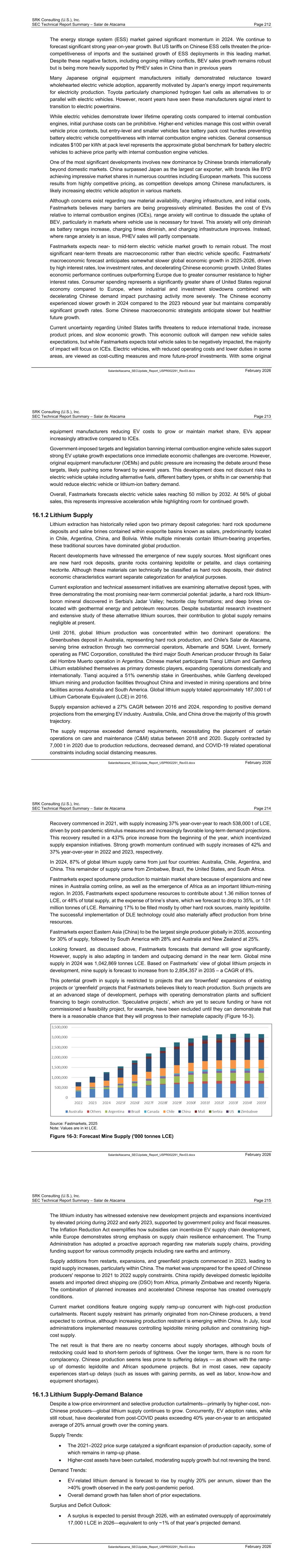 SRK Consulting (U.S.), Inc. SEC Technical Report Summary – Salar de Atacama Page 212 SalardeAtacama_SECUpdate_Report_USPR002291_Rev03.docx February 2026 The energy storage system (ESS) market gained significant momentum in 2024. We continue to forecast significant strong year-on-year growth. But US tariffs on Chinese ESS cells threaten the price- competitiveness of imports and the sustained growth of ESS deployments in this leading market. Despite these negative factors, including ongoing military conflicts, BEV sales growth remains robust but is being more heavily supported by PHEV sales in China than in previous years Many Japanese original equipment manufacturers initially demonstrated reluctance toward wholehearted electric vehicle adoption, apparently motivated by Japan's energy import requirements for electricity production. Toyota particularly championed hydrogen fuel cells as alternatives to or parallel with electric vehicles. However, recent years have seen these manufacturers signal intent to transition to electric powertrains. While electric vehicles demonstrate lower lifetime operating costs compared to internal combustion engines, initial purchase costs can be prohibitive. Higher-end vehicles manage this cost within overall vehicle price contexts, but entry-level and smaller vehicles face battery pack cost hurdles preventing battery electric vehicle competitiveness with internal combustion engine vehicles. General consensus indicates $100 per kWh at pack level represents the approximate global benchmark for battery electric vehicles to achieve price parity with internal combustion engine vehicles. One of the most significant developments involves new dominance by Chinese brands internationally beyond domestic markets. China surpassed Japan as the largest car exporter, with brands like BYD achieving impressive market shares in numerous countries including European markets. This success results from highly competitive pricing, as competition develops among Chinese manufacturers, is likely increasing electric vehicle adoption in various markets. Although concerns exist regarding raw material availability, charging infrastructure, and initial costs, Fastmarkets believes many barriers are being progressively eliminated. Besides the cost of EVs relative to internal combustion engines (ICEs), range anxiety will continue to dissuade the uptake of BEV, particularly in markets where vehicle use is necessary for travel. This anxiety will only diminish as battery ranges increase, charging times diminish, and charging infrastructure improves. Instead, where range anxiety is an issue, PHEV sales will partly compensate. Fastmarkets expects near- to mid-term electric vehicle market growth to remain robust. The most significant near-term threats are macroeconomic rather than electric vehicle specific. Fastmarkets' macroeconomic forecast anticipates somewhat slower global economic growth in 2025-2026, driven by high interest rates, low investment rates, and decelerating Chinese economic growth. United States economic performance continues outperforming Europe due to greater consumer resistance to higher interest rates. Consumer spending represents a significantly greater share of United States regional economy compared to Europe, where industrial and investment slowdowns combined with decelerating Chinese demand impact purchasing activity more severely. The Chinese economy experienced slower growth in 2024 compared to the 2023 rebound year but maintains comparably significant growth rates. Some Chinese macroeconomic strategists anticipate slower but healthier future growth. Current uncertainty regarding United States tariffs threatens to reduce international trade, increase product prices, and slow economic growth. This economic outlook will dampen new vehicle sales expectations, but while Fastmarkets expects total vehicle sales to be negatively impacted, the majority of impact will focus on ICEs. Electric vehicles, with reduced operating costs and lower duties in some areas, are viewed as cost-cutting measures and more future-proof investments. With some original SRK Consulting (U.S.), Inc. SEC Technical Report Summary – Salar de Atacama Page 213 SalardeAtacama_SECUpdate_Report_USPR002291_Rev03.docx February 2026 equipment manufacturers reducing EV costs to grow or maintain market share, EVs appear increasingly attractive compared to ICEs. Government-imposed targets and legislation banning internal combustion engine vehicle sales support strong EV uptake growth expectations once immediate economic challenges are overcome. However, original equipment manufacturer (OEMs) and public pressure are increasing the debate around these targets, likely pushing some forward by several years. This development does not discount risks to electric vehicle uptake including alternative fuels, different battery types, or shifts in car ownership that would reduce electric vehicle or lithium-ion battery demand. Overall, Fastmarkets forecasts electric vehicle sales reaching 50 million by 2032. At 56% of global sales, this represents impressive acceleration while highlighting room for continued growth. 16.1.2 Lithium Supply Lithium extraction has historically relied upon two primary deposit categories: hard rock spodumene deposits and saline brines contained within evaporite basins known as salars, predominantly located in Chile, Argentina, China, and Bolivia. While multiple minerals contain lithium-bearing properties, these traditional sources have dominated global production. Recent developments have witnessed the emergence of new supply sources. Most significant ones are new hard rock deposits, granite rocks containing lepidolite or petalite, and clays containing hectorite. Although these materials can technically be classified as hard rock deposits, their distinct economic characteristics warrant separate categorization for analytical purposes. Current exploration and technical assessment initiatives are 