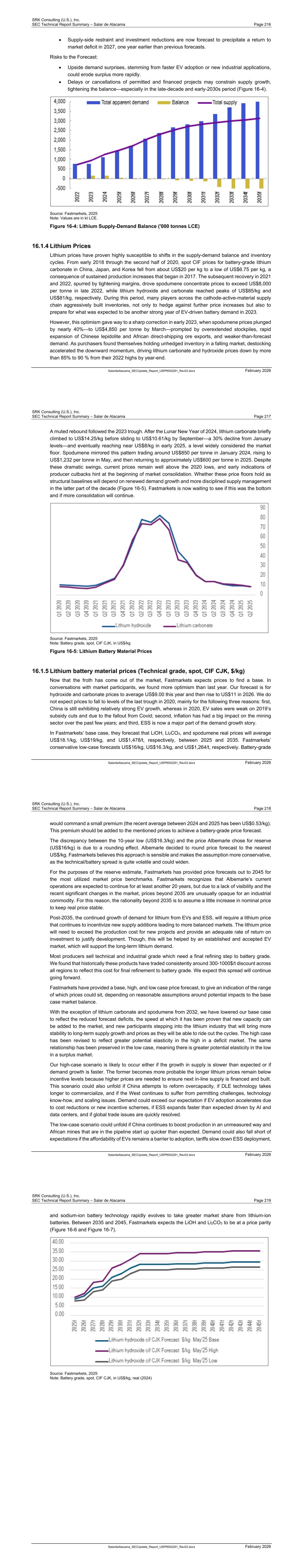 SRK Consulting (U.S.), Inc. SEC Technical Report Summary – Salar de Atacama Page 216 SalardeAtacama_SECUpdate_Report_USPR002291_Rev03.docx February 2026 Supply-side restraint and investment reductions are now forecast to precipitate a return to market deficit in 2027, one year earlier than previous forecasts. Risks to the Forecast: Upside demand surprises, stemming from faster EV adoption or new industrial applications, could erode surplus more rapidly. Delays or cancellations of permitted and financed projects may constrain supply growth, tightening the balance—especially in the late-decade and early-2030s period (Figure 16-4). Source: Fastmarkets, 2025 Note: Values are in kt LCE. Figure 16-4: Lithium Supply-Demand Balance ('000 tonnes LCE) 16.1.4 Lithium Prices Lithium prices have proven highly susceptible to shifts in the supply-demand balance and inventory cycles. From early 2018 through the second half of 2020, spot CIF prices for battery-grade lithium carbonate in China, Japan, and Korea fell from about US$20 per kg to a low of US$6.75 per kg, a consequence of sustained production increases that began in 2017. The subsequent recovery in 2021 and 2022, spurred by tightening margins, drove spodumene concentrate prices to exceed US$8,000 per tonne in late 2022, while lithium hydroxide and carbonate reached peaks of US$85/kg and US$81/kg, respectively. During this period, many players across the cathode-active-material supply chain aggressively built inventories, not only to hedge against further price increases but also to prepare for what was expected to be another strong year of EV-driven battery demand in 2023. However, this optimism gave way to a sharp correction in early 2023, when spodumene prices plunged by nearly 40%—to US$4,850 per tonne by March—prompted by overextended stockpiles, rapid expansion of Chinese lepidolite and African direct-shipping ore exports, and weaker-than-forecast demand. As purchasers found themselves holding unhedged inventory in a falling market, destocking accelerated the downward momentum, driving lithium carbonate and hydroxide prices down by more than 85% to 90 % from their 2022 highs by year-end. SRK Consulting (U.S.), Inc. SEC Technical Report Summary – Salar de Atacama Page 217 SalardeAtacama_SECUpdate_Report_USPR002291_Rev03.docx February 2026 A muted rebound followed the 2023 trough. After the Lunar New Year of 2024, lithium carbonate briefly climbed to US$14.25/kg before sliding to US$10.61/kg by September—a 30% decline from January levels—and eventually reaching near US$8/kg in early 2025, a level widely considered the market floor. Spodumene mirrored this pattern trading around US$850 per tonne in January 2024, rising to US$1,232 per tonne in May, and then returning to approximately US$600 per tonne in 2025. Despite these dramatic swings, current prices remain well above the 2020 lows, and early indications of producer cutbacks hint at the beginning of market consolidation. Whether these price floors hold as structural baselines will depend on renewed demand growth and more disciplined supply management in the latter part of the decade (Figure 16-5). Fastmarkets is now waiting to see if this was the bottom and if more consolidation will continue. Source: Fastmarkets, 2025 Note: Battery grade, spot, CIF CJK, in US$/kg Figure 16-5: Lithium Battery Material Prices 16.1.5 Lithium battery material prices (Technical grade, spot, CIF CJK, $/kg) Now that the froth has come out of the market, Fastmarkets expects prices to find a base. In conversations with market participants, we found more optimism than last year. Our forecast is for hydroxide and carbonate prices to average US$9.00 this year and then rise to US$11 in 2026. We do not expect prices to fall to levels of the last trough in 2020, mainly for the following three reasons: first, China is still exhibiting relatively strong EV growth, whereas in 2020, EV sales were weak on 2019’s subsidy cuts and due to the fallout from Covid; second, inflation has had a big impact on the mining sector over the past few years; and third, ESS is now a major part of the demand growth story. In Fastmarkets’ base case, they forecast that LiOH, Li2CO3, and spodumene real prices will average US$18.1/kg, US$19/kg, and US$1,478/t, respectively, between 2025 and 2035. Fastmarkets’ conservative low-case forecasts US$16/kg, US$16.3/kg, and US$1,264/t, respectively. Battery-grade SRK Consulting (U.S.), Inc. SEC Technical Report Summary – Salar de Atacama Page 218 SalardeAtacama_SECUpdate_Report_USPR002291_Rev03.docx February 2026 would command a small premium (the recent average between 2024 and 2025 has been US$0.53/kg). This premium should be added to the mentioned prices to achieve a battery-grade price forecast. The discrepancy between the 10-year low (US$16.3/kg) and the price Albemarle chose for reserve (US$16/kg) is due to a rounding effect. Albemarle decided to round price forecast to the nearest US$/kg. Fastmarkets believes this approach is sensible and makes the assumption more conservative, as the technical/battery spread is quite volatile and could widen. For the purposes of the reserve estimate, Fastmarkets has provided price forecasts out to 2045 for the most utilized market price benchmarks. Fastmarkets recognizes that Albemarle’s current operations are expected to continue for at least another 20 years, but due to a lack of visibility and the recent significant changes in the market, prices beyond 2035 are unusually opaque for an industrial commodity. For this reason, the rationality beyond 2035 is to assume a little increase in nominal price to keep real price stable. Post-2035, the continued growth of demand for lithium from EVs and ESS, will require a lithium price that continues to incentivize new supply additions leading to more balanced markets. The lithium price will need to exceed the production cost for new projects and provide an adequate rate of return on investment to