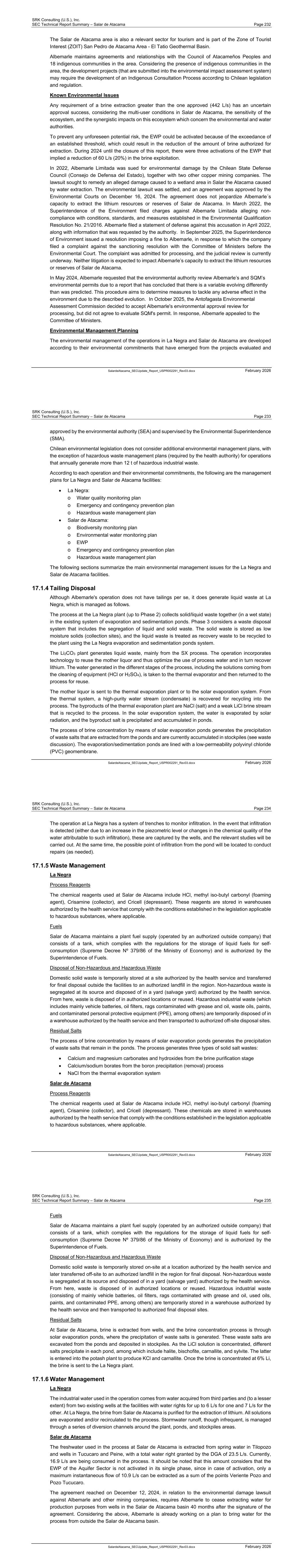 SRK Consulting (U.S.), Inc. SEC Technical Report Summary – Salar de Atacama Page 232 SalardeAtacama_SECUpdate_Report_USPR002291_Rev03.docx February 2026 The Salar de Atacama area is also a relevant sector for tourism and is part of the Zone of Tourist Interest (ZOIT) San Pedro de Atacama Area - El Tatio Geothermal Basin. Albemarle maintains agreements and relationships with the Council of Atacameños Peoples and 18 indigenous communities in the area. Considering the presence of indigenous communities in the area, the development projects (that are submitted into the environmental impact assessment system) may require the development of an Indigenous Consultation Process according to Chilean legislation and regulation. Known Environmental Issues Any requirement of a brine extraction greater than the one approved (442 L/s) has an uncertain approval success, considering the multi-user conditions in Salar de Atacama, the sensitivity of the ecosystem, and the synergistic impacts on this ecosystem which concern the environmental and water authorities. To prevent any unforeseen potential risk, the EWP could be activated because of the exceedance of an established threshold, which could result in the reduction of the amount of brine authorized for extraction. During 2024 until the closure of this report, there were three activations of the EWP that implied a reduction of 60 L/s (20%) in the brine exploitation. In 2022, Albemarle Limitada was sued for environmental damage by the Chilean State Defense Council (Consejo de Defensa del Estado), together with two other copper mining companies. The lawsuit sought to remedy an alleged damage caused to a wetland area in Salar the Atacama caused by water extraction. The environmental lawsuit was settled, and an agreement was approved by the Environmental Courts on December 16, 2024. The agreement does not jeopardize Albemarle´s capacity to extract the lithium resources or reserves of Salar de Atacama. In March 2022, the Superintendence of the Environment filed charges against Albemarle Limitada alleging non- compliance with conditions, standards, and measures established in the Environmental Qualification Resolution No. 21/2016. Albemarle filed a statement of defense against this accusation in April 2022, along with information that was requested by the authority. In September 2025, the Superintendence of Environment issued a resolution imposing a fine to Albemarle, in response to which the company filed a complaint against the sanctioning resolution with the Committee of Ministers before the Environmental Court. The complaint was admitted for processing, and the judicial review is currently underway. Neither litigation is expected to impact Albemarle’s capacity to extract the lithium resources or reserves of Salar de Atacama. In May 2024, Albemarle requested that the environmental authority review Albemarle’s and SQM’s environmental permits due to a report that has concluded that there is a variable evolving differently than was predicted. This procedure aims to determine measures to tackle any adverse effect in the environment due to the described evolution. In October 2025, the Antofagasta Environmental Assessment Commission decided to accept Albemarle's environmental approval review for processing, but did not agree to evaluate SQM's permit. In response, Albemarle appealed to the Committee of Ministers. Environmental Management Planning The environmental management of the operations in La Negra and Salar de Atacama are developed according to their environmental commitments that have emerged from the projects evaluated and SRK Consulting (U.S.), Inc. SEC Technical Report Summary – Salar de Atacama Page 233 SalardeAtacama_SECUpdate_Report_USPR002291_Rev03.docx February 2026 approved by the environmental authority (SEA) and supervised by the Environmental Superintendence (SMA). Chilean environmental legislation does not consider additional environmental management plans, with the exception of hazardous waste management plans (required by the health authority) for operations that annually generate more than 12 t of hazardous industrial waste. According to each operation and their environmental commitments, the following are the management plans for La Negra and Salar de Atacama facilities: La Negra: o Water quality monitoring plan o Emergency and contingency prevention plan o Hazardous waste management plan Salar de Atacama: o Biodiversity monitoring plan o Environmental water monitoring plan o EWP o Emergency and contingency prevention plan o Hazardous waste management plan The following sections summarize the main environmental management issues for the La Negra and Salar de Atacama facilities. 17.1.4 Tailing Disposal Although Albemarle's operation does not have tailings per se, it does generate liquid waste at La Negra, which is managed as follows. The process at the La Negra plant (up to Phase 2) collects solid/liquid waste together (in a wet state) in the existing system of evaporation and sedimentation ponds. Phase 3 considers a waste disposal system that includes the segregation of liquid and solid waste. The solid waste is stored as low moisture solids (collection sites), and the liquid waste is treated as recovery waste to be recycled to the plant using the La Negra evaporation and sedimentation ponds system. The Li2CO3 plant generates liquid waste, mainly from the SX process. The operation incorporates technology to reuse the mother liquor and thus optimize the use of process water and in turn recover lithium. The water generated in the different stages of the process, including the solutions coming from the cleaning of equipment (HCl or H2SO4), is taken to the thermal evaporator and then returned to the process for reuse. The mother liquor is sent to the thermal evaporation plant or to the solar evaporation system. From the thermal system, a high-purity water stream (condensate) is recovered for recycling into the process. The byprod