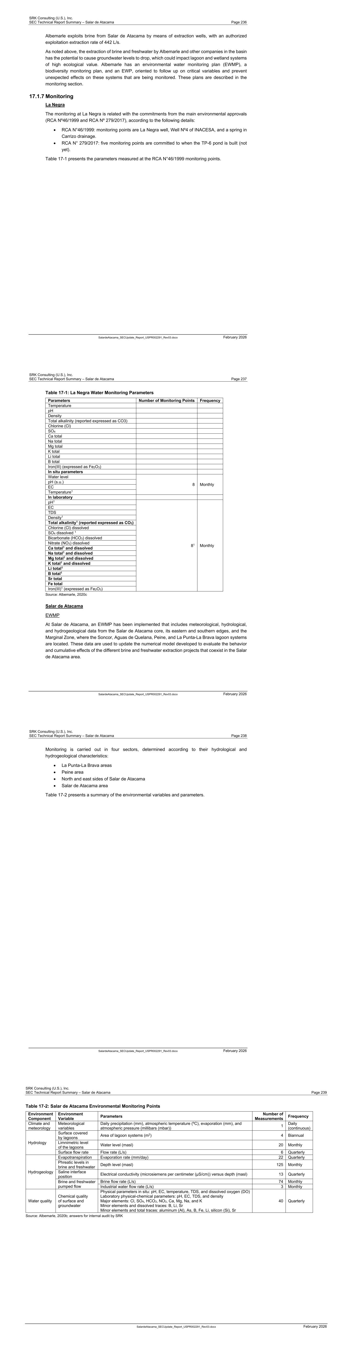 SRK Consulting (U.S.), Inc. SEC Technical Report Summary – Salar de Atacama Page 236 SalardeAtacama_SECUpdate_Report_USPR002291_Rev03.docx February 2026 Albemarle exploits brine from Salar de Atacama by means of extraction wells, with an authorized exploitation extraction rate of 442 L/s. As noted above, the extraction of brine and freshwater by Albemarle and other companies in the basin has the potential to cause groundwater levels to drop, which could impact lagoon and wetland systems of high ecological value. Albemarle has an environmental water monitoring plan (EWMP), a biodiversity monitoring plan, and an EWP, oriented to follow up on critical variables and prevent unexpected effects on these systems that are being monitored. These plans are described in the monitoring section. 17.1.7 Monitoring La Negra The monitoring at La Negra is related with the commitments from the main environmental approvals (RCA Nº46/1999 and RCA Nº 279/2017), according to the following details: RCA N°46/1999: monitoring points are La Negra well, Well Nº4 of INACESA, and a spring in Carrizo drainage. RCA N° 279/2017: five monitoring points are committed to when the TP-6 pond is built (not yet). Table 17-1 presents the parameters measured at the RCA N°46/1999 monitoring points. SRK Consulting (U.S.), Inc. SEC Technical Report Summary – Salar de Atacama Page 237 SalardeAtacama_SECUpdate_Report_USPR002291_Rev03.docx February 2026 Table 17-1: La Negra Water Monitoring Parameters Parameters Number of Monitoring Points Frequency Temperature pH Density Total alkalinity (reported expressed as CO3) Chlorine (Cl) SO4 Ca total Na total Mg total K total Li total B total Iron(III) (expressed as Fe2O3) In situ parameters Water level 8 Monthly pH (s.u.) EC Temperature1 In laboratory pH1 81 Monthly EC TDS Density1 Total alkalinity1 (reported expressed as CO3) Chlorine (Cl) dissolved SO4 dissolved 1 Bicarbonate (HCO3) dissolved Nitrate (NO3) dissolved Ca total1 and dissolved Na total1 and dissolved Mg total1 and dissolved K total1 and dissolved Li total1 B total1 Sr total Fe total Iron(III)1 (expressed as Fe2O3) Source: Albemarle, 2020c Salar de Atacama EWMP At Salar de Atacama, an EWMP has been implemented that includes meteorological, hydrological, and hydrogeological data from the Salar de Atacama core, its eastern and southern edges, and the Marginal Zone, where the Soncor, Aguas de Quelana, Peine, and La Punta-La Brava lagoon systems are located. These data are used to update the numerical model developed to evaluate the behavior and cumulative effects of the different brine and freshwater extraction projects that coexist in the Salar de Atacama area. SRK Consulting (U.S.), Inc. SEC Technical Report Summary – Salar de Atacama Page 238 SalardeAtacama_SECUpdate_Report_USPR002291_Rev03.docx February 2026 Monitoring is carried out in four sectors, determined according to their hydrological and hydrogeological characteristics: La Punta-La Brava areas Peine area North and east sides of Salar de Atacama Salar de Atacama area Table 17-2 presents a summary of the environmental variables and parameters. SRK Consulting (U.S.), Inc. SEC Technical Report Summary – Salar de Atacama Page 239 SalardeAtacama_SECUpdate_Report_USPR002291_Rev03.docx February 2026 Table 17-2: Salar de Atacama Environmental Monitoring Points Environment Component Environment Variable Parameters Number of Measurements Frequency Climate and meteorology Meteorological variables Daily precipitation (mm), atmospheric temperature (ºC), evaporation (mm), and atmospheric pressure (millibars (mbar)) 1 Daily (continuous) Hydrology Surface covered by lagoons Area of lagoon systems (m2) 4 Biannual Limnimetric level of the lagoons Water level (masl) 20 Monthly Surface flow rate Flow rate (L/s) 6 Quarterly Hydrogeology Evapotranspiration Evaporation rate (mm/day) 22 Quarterly Phreatic levels in brine and freshwater Depth level (masl) 125 Monthly Saline interface position Electrical conductivity (microsiemens per centimeter (µS/cm)) versus depth (masl) 13 Quarterly Brine and freshwater pumped flow Brine flow rate (L/s) 74 Monthly Industrial water flow rate (L/s) 3 Monthly Water quality Chemical quality of surface and groundwater Physical parameters in situ: pH, EC, temperature, TDS, and dissolved oxygen (DO) Laboratory physical-chemical parameters: pH, EC, TDS, and density Major elements: Cl, SO4, HCO3, NO3, Ca, Mg, Na, and K Minor elements and dissolved traces: B, Li, Sr Minor elements and total traces: aluminum (Al), As, B, Fe, Li, silicon (Si), Sr 40 Quarterly Source: Albemarle, 2020b; answers for internal audit by SRK