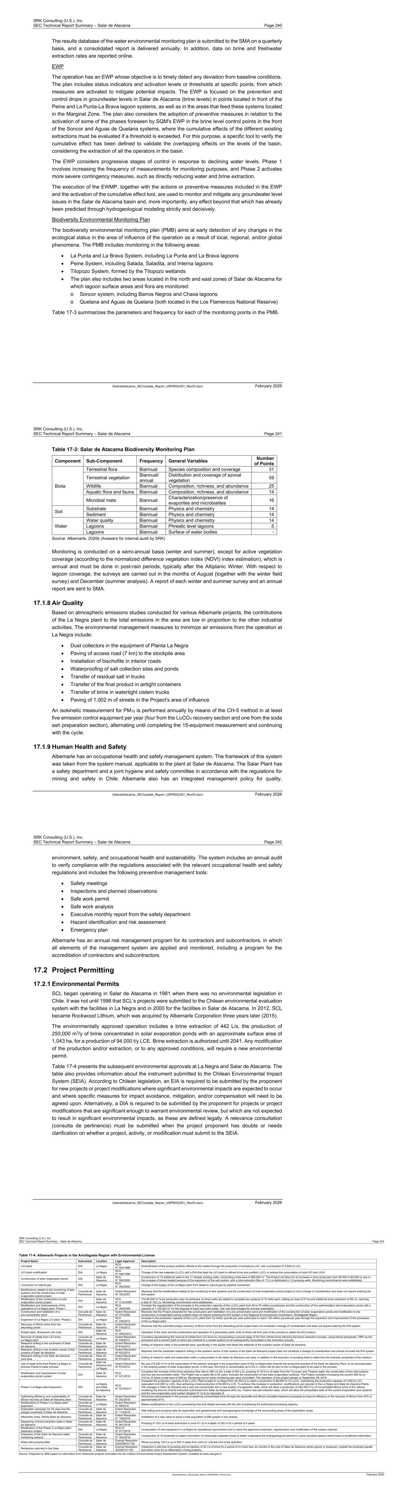 SRK Consulting (U.S.), Inc. SEC Technical Report Summary – Salar de Atacama Page 240 SalardeAtacama_SECUpdate_Report_USPR002291_Rev03.docx February 2026 The results database of the water environmental monitoring plan is submitted to the SMA on a quarterly basis, and a consolidated report is delivered annually. In addition, data on brine and freshwater extraction rates are reported online. EWP The operation has an EWP whose objective is to timely detect any deviation from baseline conditions. The plan includes status indicators and activation levels or thresholds at specific points, from which measures are activated to mitigate potential impacts. The EWP is focused on the prevention and control drops in groundwater levels in Salar de Atacama (brine levels) in points located in front of the Peine and La Punta-La Brava lagoon systems, as well as in the areas that feed these systems located in the Marginal Zone. The plan also considers the adoption of preventive measures in relation to the activation of some of the phases foreseen by SQM's EWP in the brine level control points in the front of the Soncor and Aguas de Quelana systems, where the cumulative effects of the different existing extractions must be evaluated if a threshold is exceeded. For this purpose, a specific tool to verify the cumulative effect has been defined to validate the overlapping effects on the levels of the basin, considering the extraction of all the operators in the basin. The EWP considers progressive stages of control in response to declining water levels. Phase 1 involves increasing the frequency of measurements for monitoring purposes, and Phase 2 activates more severe contingency measures, such as directly reducing water and brine extraction. The execution of the EWMP, together with the actions or preventive measures included in the EWP and the activation of the cumulative effect tool, are used to monitor and mitigate any groundwater level issues in the Salar de Atacama basin and, more importantly, any effect beyond that which has already been predicted through hydrogeological modeling strictly and decisively. Biodiversity Environmental Monitoring Plan The biodiversity environmental monitoring plan (PMB) aims at early detection of any changes in the ecological status in the area of influence of the operation as a result of local, regional, and/or global phenomena. The PMB includes monitoring in the following areas: La Punta and La Brava System, including La Punta and La Brava lagoons Peine System, including Salada, Saladita, and Interna lagoons Tilopozo System, formed by the Tilopozo wetlands The plan also includes two areas located in the north and east zones of Salar de Atacama for which lagoon surface areas and flora are monitored: o Soncor system, including Barros Negros and Chaxa lagoons o Quelana and Aguas de Quelana (both located in the Los Flamencos National Reserve) Table 17-3 summarizes the parameters and frequency for each of the monitoring points in the PMB. SRK Consulting (U.S.), Inc. SEC Technical Report Summary – Salar de Atacama Page 241 SalardeAtacama_SECUpdate_Report_USPR002291_Rev03.docx February 2026 Table 17-3: Salar de Atacama Biodiversity Monitoring Plan Component Sub-Component Frequency General Variables Number of Points Biota Terrestrial flora Biannual Species composition and coverage 31 Terrestrial vegetation Biannual/ annual Distribution and coverage of azonal vegetation 59 Wildlife Biannual Composition, richness, and abundance 25 Aquatic flora and fauna Biannual Composition, richness, and abundance 14 Microbial mats Biannual Characterization/presence of evaporites and microbialites 16 Soil Substrate Biannual Physics and chemistry 14 Sediment Biannual Physics and chemistry 14 Water Water quality Biannual Physics and chemistry 14 Lagoons Biannual Phreatic level lagoons 5 Lagoons Biannual Surface of water bodies - Source: Albemarle, 2020b (Answers for internal audit by SRK) Monitoring is conducted on a semi-annual basis (winter and summer), except for active vegetation coverage (according to the normalized difference vegetation index (NDVI) index estimation), which is annual and must be done in post-rain periods, typically after the Altiplanic Winter. With respect to lagoon coverage, the surveys are carried out in the months of August (together with the winter field survey) and December (summer analysis). A report of each winter and summer survey and an annual report are sent to SMA. 17.1.8 Air Quality Based on atmospheric emissions studies conducted for various Albemarle projects, the contributions of the La Negra plant to the total emissions in the area are low in proportion to the other industrial activities. The environmental management measures to minimize air emissions from the operation at La Negra include: Dust collectors in the equipment of Planta La Negra Paving of access road (7 km) to the stockpile area Installation of bischofite in interior roads Waterproofing of salt collection sites and ponds Transfer of residual salt in trucks Transfer of the final product in airtight containers Transfer of brine in watertight cistern trucks Paving of 1,002 m of streets in the Project's area of influence An isokinetic measurement for PM10 is performed annually by means of the CH-5 method in at least five emission control equipment per year (four from the Li2CO3 recovery section and one from the soda ash preparation section), alternating until completing the 15-equipment measurement and continuing with the cycle. 17.1.9 Human Health and Safety Albemarle has an occupational health and safety management system. The framework of this system was taken from the system manual, applicable to the plant at Salar de Atacama. The Salar Plant has a safety department and a joint hygiene and safety committee in accordance with the regulations for mining and safety in Chile. Albemarle also has an integrated management policy for quality, SRK Consulting (U.S.), Inc. SEC Technical Report Summary – S