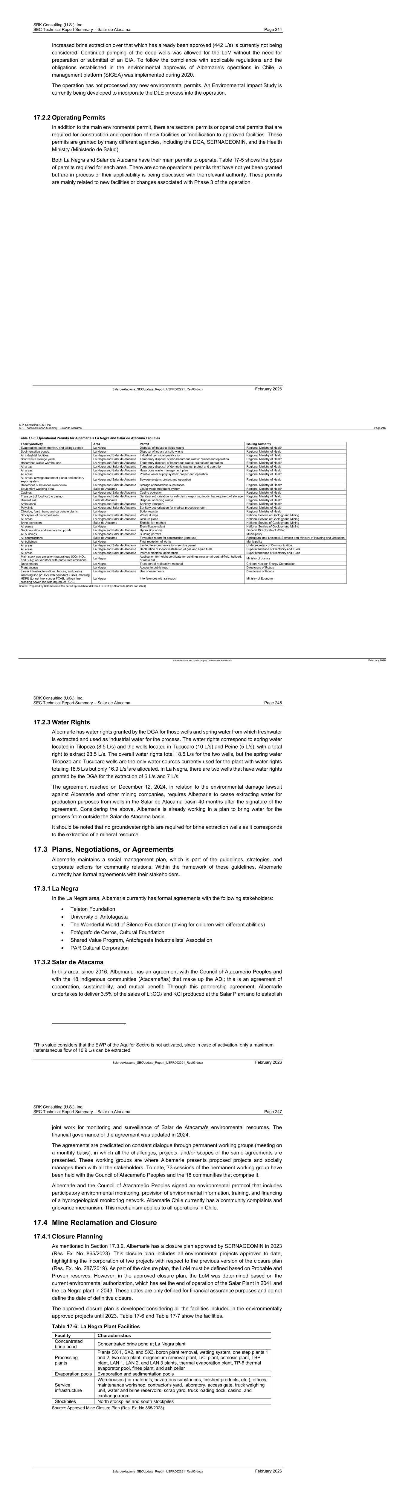 SRK Consulting (U.S.), Inc. SEC Technical Report Summary – Salar de Atacama Page 244 SalardeAtacama_SECUpdate_Report_USPR002291_Rev03.docx February 2026 Increased brine extraction over that which has already been approved (442 L/s) is currently not being considered. Continued pumping of the deep wells was allowed for the LoM without the need for preparation or submittal of an EIA. To follow the compliance with applicable regulations and the obligations established in the environmental approvals of Albemarle's operations in Chile, a management platform (SIGEA) was implemented during 2020. The operation has not processed any new environmental permits. An Environmental Impact Study is currently being developed to incorporate the DLE process into the operation. 17.2.2 Operating Permits In addition to the main environmental permit, there are sectorial permits or operational permits that are required for construction and operation of new facilities or modification to approved facilities. These permits are granted by many different agencies, including the DGA, SERNAGEOMIN, and the Health Ministry (Ministerio de Salud). Both La Negra and Salar de Atacama have their main permits to operate. Table 17-5 shows the types of permits required for each area. There are some operational permits that have not yet been granted but are in process or their applicability is being discussed with the relevant authority. These permits are mainly related to new facilities or changes associated with Phase 3 of the operation. SRK Consulting (U.S.), Inc. SEC Technical Report Summary – Salar de Atacama Page 245 SalardeAtacama_SECUpdate_Report_USPR002291_Rev03.docx February 2026 Table 17-5: Operational Permits for Albemarle’s La Negra and Salar de Atacama Facilities Facility/Activity Area Permit Issuing Authority Evaporation, sedimentation, and tailings ponds La Negra Disposal of industrial liquid waste Regional Ministry of Health Sedimentation ponds La Negra Disposal of industrial solid waste Regional Ministry of Health All industrial facilities La Negra and Salar de Atacama Industrial technical qualification Regional Ministry of Health Solid waste storage yards La Negra and Salar de Atacama Temporary disposal of non-hazardous waste: project and operation Regional Ministry of Health Hazardous waste warehouses La Negra and Salar de Atacama Temporary disposal of hazardous waste: project and operation Regional Ministry of Health All areas La Negra and Salar de Atacama Temporary disposal of domestic wastes: project and operation Regional Ministry of Health All areas La Negra and Salar de Atacama Hazardous waste management plan Regional Ministry of Health All areas La Negra and Salar de Atacama Potable water supply system: project and operation Regional Ministry of Health All areas: sewage treatment plants and sanitary septic system La Negra and Salar de Atacama Sewage system: project and operation Regional Ministry of Health Hazardous substances warehouse La Negra and Salar de Atacama Storage of hazardous substances Regional Ministry of Health Equipment washing area Salar de Atacama Liquid waste treatment system Regional Ministry of Health Casinos La Negra and Salar de Atacama Casino operation Regional Ministry of Health Transport of food for the casino La Negra and Salar de Atacama Sanitary authorization for vehicles transporting foods that require cold storage Regional Ministry of Health Discard salt Salar de Atacama Disposal of mining waste Regional Ministry of Health Ambulance La Negra and Salar de Atacama Sanitary transport Regional Ministry of Health Polyclinic La Negra and Salar de Atacama Sanitary authorization for medical procedure room Regional Ministry of Health Chloride, fourth train, and carbonate plants La Negra Boiler register Regional Ministry of Health Stockpiles of discarded salts La Negra and Salar de Atacama Waste dumps National Service of Geology and Mining All areas La Negra and Salar de Atacama Closure plans National Service of Geology and Mining Brine extraction Salar de Atacama Exploitation method National Service of Geology and Mining All plants La Negra Electrification plant National Service of Geology and Mining Sedimentation and evaporation ponds La Negra and Salar de Atacama Hydraulics works General Directorate of Water All buildings La Negra and Salar de Atacama Building permits Municipality All constructions Salar de Atacama Favorable report for construction (land use) Agricultural and Livestock Services and Ministry of Housing and Urbanism All buildings La Negra Final reception of works Municipality All areas La Negra and Salar de Atacama Limited telecommunications service permit Undersecretary of Communication All areas La Negra and Salar de Atacama Declaration of indoor installation of gas and liquid fuels Superintendence of Electricity and Fuels All areas La Negra and Salar de Atacama Internal electrical declaration Superintendence of Electricity and Fuels Main stack gas emission (natural gas (CO2, NOx, and SO2); wet air stack with particulate emissions La Negra Application for height certificate for buildings near an airport, airfield, heliport, or radio aid Ministry of Justice Densimeters La Negra Transport of radioactive material Chilean Nuclear Energy Commission Plant access La Negra Access to public road Directorate of Roads Linear infrastructure (lines, fences, and posts) La Negra and Salar de Atacama Use of easements Directorate of Roads Crossing line (23 kV) with aqueduct FCAB, crossing HDPE (tunnel liner) under FCAB; railway line crossing sewer line with aqueduct FCAB La Negra Interferences with railroads Ministry of Economy Source: Prepared by SRK based in the permit spreadsheet delivered to SRK by Albemarle (2020 and 2024) SRK Consulting (U.S.), Inc. SEC Technical Report Summary – Salar de Atacama Page 246 SalardeAtacama_SECUpdate_Report_USPR002291_Rev03.docx February 2026 17.2.3 Water Rights Albemarle has water rights granted by the DGA for those wells and spring wat