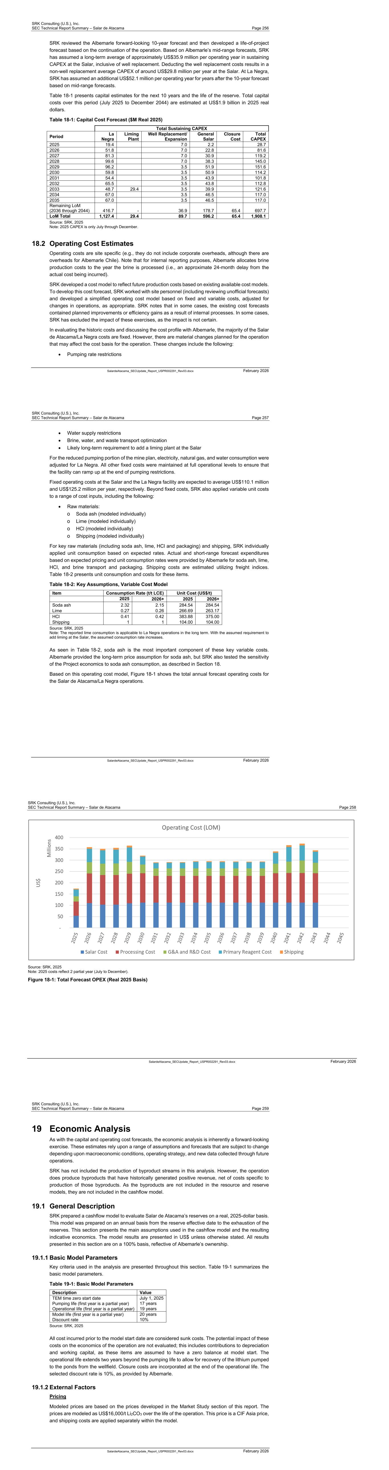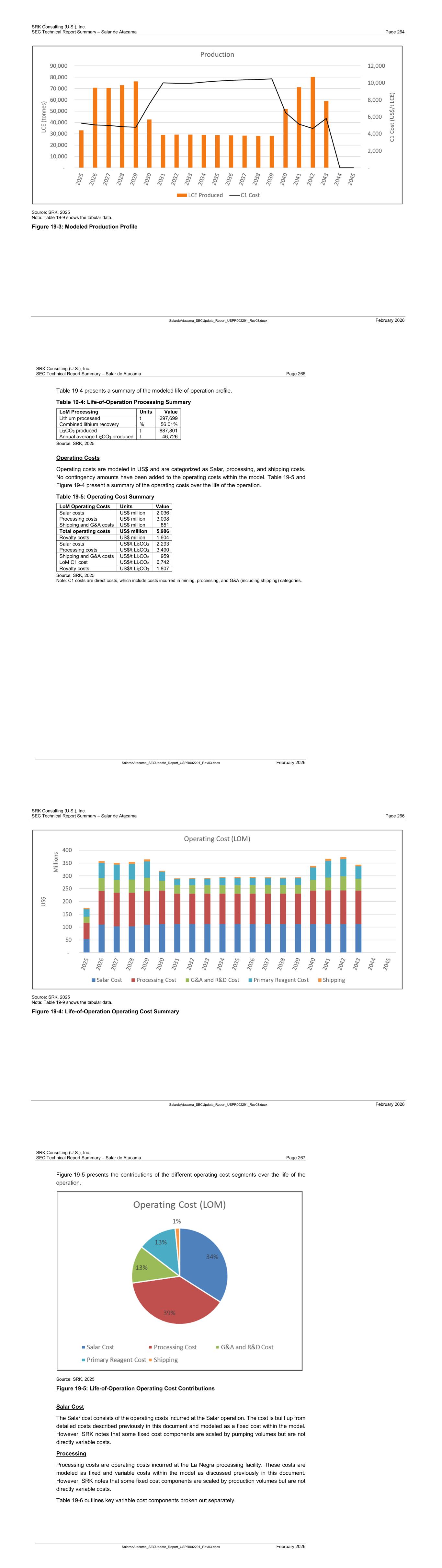 SRK Consulting (U.S.), Inc. SEC Technical Report Summary – Salar de Atacama Page 264 SalardeAtacama_SECUpdate_Report_USPR002291_Rev03.docx February 2026 Source: SRK, 2025 Note: Table 19-9 shows the tabular data. Figure 19-3: Modeled Production Profile SRK Consulting (U.S.), Inc. SEC Technical Report Summary – Salar de Atacama Page 265 SalardeAtacama_SECUpdate_Report_USPR002291_Rev03.docx February 2026 Table 19-4 presents a summary of the modeled life-of-operation profile. Table 19-4: Life-of-Operation Processing Summary LoM Processing Units Value Lithium processed t 297,699 Combined lithium recovery % 56.01% Li2CO3 produced t 887,801 Annual average Li2CO3 produced t 46,726 Source: SRK, 2025 Operating Costs Operating costs are modeled in US$ and are categorized as Salar, processing, and shipping costs. No contingency amounts have been added to the operating costs within the model. Table 19-5 and Figure 19-4 present a summary of the operating costs over the life of the operation. Table 19-5: Operating Cost Summary LoM Operating Costs Units Value Salar costs US$ million 2,036 Processing costs US$ million 3,098 Shipping and G&A costs US$ million 851 Total operating costs US$ million 5,986 Royalty costs US$ million 1,604 Salar costs US$/t Li2CO3 2,293 Processing costs US$/t Li2CO3 3,490 Shipping and G&A costs US$/t Li2CO3 959 LoM C1 cost US$/t Li2CO3 6,742 Royalty costs US$/t Li2CO3 1,807 Source: SRK, 2025 Note: C1 costs are direct costs, which include costs incurred in mining, processing, and G&A (including shipping) categories. SRK Consulting (U.S.), Inc. SEC Technical Report Summary – Salar de Atacama Page 266 SalardeAtacama_SECUpdate_Report_USPR002291_Rev03.docx February 2026 Source: SRK, 2025 Note: Table 19-9 shows the tabular data. Figure 19-4: Life-of-Operation Operating Cost Summary SRK Consulting (U.S.), Inc. SEC Technical Report Summary – Salar de Atacama Page 267 SalardeAtacama_SECUpdate_Report_USPR002291_Rev03.docx February 2026 Figure 19-5 presents the contributions of the different operating cost segments over the life of the operation. Source: SRK, 2025 Figure 19-5: Life-of-Operation Operating Cost Contributions Salar Cost The Salar cost consists of the operating costs incurred at the Salar operation. The cost is built up from detailed costs described previously in this document and modeled as a fixed cost within the model. However, SRK notes that some fixed cost components are scaled by pumping volumes but are not directly variable costs. Processing Processing costs are operating costs incurred at the La Negra processing facility. These costs are modeled as fixed and variable costs within the model as discussed previously in this document. However, SRK notes that some fixed cost components are scaled by production volumes but are not directly variable costs. Table 19-6 outlines key variable cost components broken out separately.