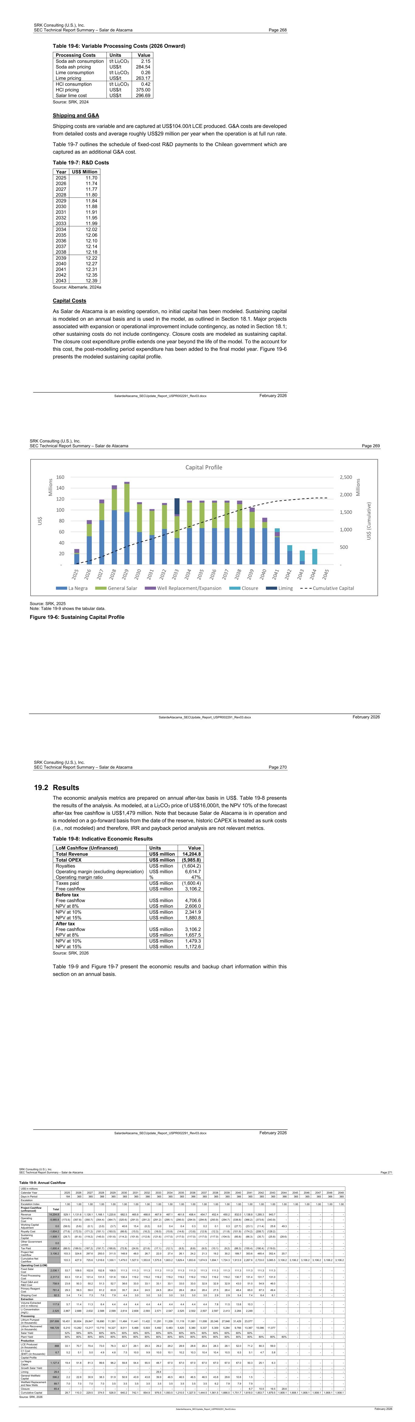 SRK Consulting (U.S.), Inc. SEC Technical Report Summary – Salar de Atacama Page 268 SalardeAtacama_SECUpdate_Report_USPR002291_Rev03.docx February 2026 Table 19-6: Variable Processing Costs (2026 Onward) Processing Costs Units Value Soda ash consumption t/t Li2CO3 2.15 Soda ash pricing US$/t 284.54 Lime consumption t/t Li2CO3 0.26 Lime pricing US$/t 263.17 HCl consumption t/t Li2CO3 0.42 HCl pricing US$/t 375.00 Salar lime cost US$/t 296.69 Source: SRK, 2024 Shipping and G&A Shipping costs are variable and are captured at US$104.00/t LCE produced. G&A costs are developed from detailed costs and average roughly US$29 million per year when the operation is at full run rate. Table 19-7 outlines the schedule of fixed-cost R&D payments to the Chilean government which are captured as an additional G&A cost. Table 19-7: R&D Costs Year US$ Million 2025 11.70 2026 11.74 2027 11.77 2028 11.80 2029 11.84 2030 11.88 2031 11.91 2032 11.95 2033 11.99 2034 12.02 2035 12.06 2036 12.10 2037 12.14 2038 12.18 2039 12.22 2040 12.27 2041 12.31 2042 12.35 2043 12.39 Source: Albemarle, 2024a Capital Costs As Salar de Atacama is an existing operation, no initial capital has been modeled. Sustaining capital is modeled on an annual basis and is used in the model, as outlined in Section 18.1. Major projects associated with expansion or operational improvement include contingency, as noted in Section 18.1; other sustaining costs do not include contingency. Closure costs are modeled as sustaining capital. The closure cost expenditure profile extends one year beyond the life of the model. To the account for this cost, the post-modelling period expenditure has been added to the final model year. Figure 19-6 presents the modeled sustaining capital profile. SRK Consulting (U.S.), Inc. SEC Technical Report Summary – Salar de Atacama Page 269 SalardeAtacama_SECUpdate_Report_USPR002291_Rev03.docx February 2026 Source: SRK, 2025 Note: Table 19-9 shows the tabular data. Figure 19-6: Sustaining Capital Profile SRK Consulting (U.S.), Inc. SEC Technical Report Summary – Salar de Atacama Page 270 SalardeAtacama_SECUpdate_Report_USPR002291_Rev03.docx February 2026 19.2 Results The economic analysis metrics are prepared on annual after-tax basis in US$. Table 19-8 presents the results of the analysis. As modeled, at a Li2CO3 price of US$16,000/t, the NPV 10% of the forecast after-tax free cashflow is US$1,479 million. Note that because Salar de Atacama is in operation and is modeled on a go-forward basis from the date of the reserve, historic CAPEX is treated as sunk costs (i.e., not modeled) and therefore, IRR and payback period analysis are not relevant metrics. Table 19-8: Indicative Economic Results LoM Cashflow (Unfinanced) Units Value Total Revenue US$ million 14,204.8 Total OPEX US$ million (5,985.8) Royalties US$ million (1,604.2) Operating margin (excluding depreciation) US$ million 6,614.7 Operating margin ratio % 47% Taxes paid US$ million (1,600.4) Free cashflow US$ million 3,106.2 Before tax Free cashflow US$ million 4,706.6 NPV at 8% US$ million 2,606.0 NPV at 10% US$ million 2,341.9 NPV at 15% US$ million 1,880.8 After tax Free cashflow US$ million 3,106.2 NPV at 8% US$ million 1,657.5 NPV at 10% US$ million 1,479.3 NPV at 15% US$ million 1,172.6 Source: SRK, 2026 Table 19-9 and Figure 19-7 present the economic results and backup chart information within this section on an annual basis. SRK Consulting (U.S.), Inc. SEC Technical Report Summary – Salar de Atacama Page 271 SalardeAtacama_SECUpdate_Report_USPR002291_Rev03.docx February 2026 Table 19-9: Annual Cashflow US$ in millions Calendar Year 2025 2026 2027 2028 2029 2030 2031 2032 2033 2034 2035 2036 2037 2038 2039 2040 2041 2042 2043 2044 2045 2046 2047 2048 2049 Days in Period 184 365 365 366 365 365 365 366 365 365 365 366 365 365 365 366 365 365 365 366 365 365 365 366 365 Escalation Escalation Index 1.00 1.00 1.00 1.00 1.00 1.00 1.00 1.00 1.00 1.00 1.00 1.00 1.00 1.00 1.00 1.00 1.00 1.00 1.00 1.00 1.00 1.00 1.00 1.00 1.00 Project Cashflow (unfinanced) Total Revenue 14,204.8 529.1 1,131.6 1,126.1 1,168.1 1,220.6 682.5 465.8 468.8 467.9 467.1 461.8 458.4 454.7 452.4 450.2 832.0 1,138.8 1,285.3 943.7 - - - - - - Operating Cost -5,985.8 (173.5) (357.8) (350.7) (354.4) (364.7) (320.6) (291.0) (291.2) (291.2) (295.1) (295.0) (294.9) (294.8) (293.9) (294.7) (338.8) (366.2) (373.6) (343.9) - - - - - - Working Capital Adjustment 0.0 (58.0) (5.6) (0.1) (3.0) (3.7) 40.6 15.4 (0.2) 0.0 0.4 0.4 0.3 0.2 0.1 0.3 (27.7) (23.1) (11.4) 25.6 49.3 - - - - - Royalty Cost -1,604.2 (77.6) (172.5) (171.2) (181.1) (193.5) (66.6) (15.5) (16.2) (16.0) (15.8) (14.6) (13.8) (12.9) (12.3) (11.8) (101.9) (174.2) (208.7) (128.2) - - - - - - Sustaining Capital -1,908.1 (28.7) (81.6) (119.2) (145.0) (151.6) (114.2) (101.8) (112.8) (121.6) (117.0) (117.0) (117.0) (117.0) (117.0) (104.5) (85.8) (66.3) (35.7) (25.8) (28.6) - - - - - Other Government Levies 0.0 - - - - - - - - - - - - - - - - - - - - - - - - - Tax Paid -1,600.4 (88.0) (189.5) (187.2) (191.7) (195.8) (72.8) (24.9) (21.6) (17.1) (12.1) (9.5) (8.8) (9.0) (10.1) (9.2) (88.3) (155.4) (190.4) (119.0) - - - - - - Project Net Cashflow 3,106.2 103.3 324.6 297.6 293.0 311.5 148.9 48.0 26.7 22.0 27.4 26.1 24.2 21.3 19.2 30.2 189.7 353.6 465.4 352.4 20.7 - - - - - Cumulative Net Cashflow 103.3 427.9 725.6 1,018.6 1,330.1 1,479.0 1,527.0 1,553.8 1,575.8 1,603.2 1,629.4 1,653.6 1,674.9 1,694.1 1,724.3 1,913.9 2,267.6 2,733.0 3,085.5 3,106.2 3,106.2 3,106.2 3,106.2 3,106.2 3,106.2 Operating Cost (LOM) Fixed Salar Cost 2,036.1 53.7 109.5 102.8 102.8 108.5 111.3 111.3 111.3 111.3 111.3 111.3 111.3 111.3 111.3 111.3 111.3 111.3 111.3 111.3 - - - - - - Fixed Processing Cost 2,317.0 63.3 131.4 131.4 131.5 131.6 130.4 119.2 119.2 119.2 119.2 119.2 119.2 119.2 119.2 119.2 130.7 131.4 131.7 131.0 - - - - - - Fixed G&A and R&D Cost 758.9 23.8 50.3 50.2 51.3 52.7 38.6 33.0 33.1 33.1 33.1 33.0 33.0 32.9 32.9 32.9 43.0 51.0 54.9 46.0 - - - - - - P