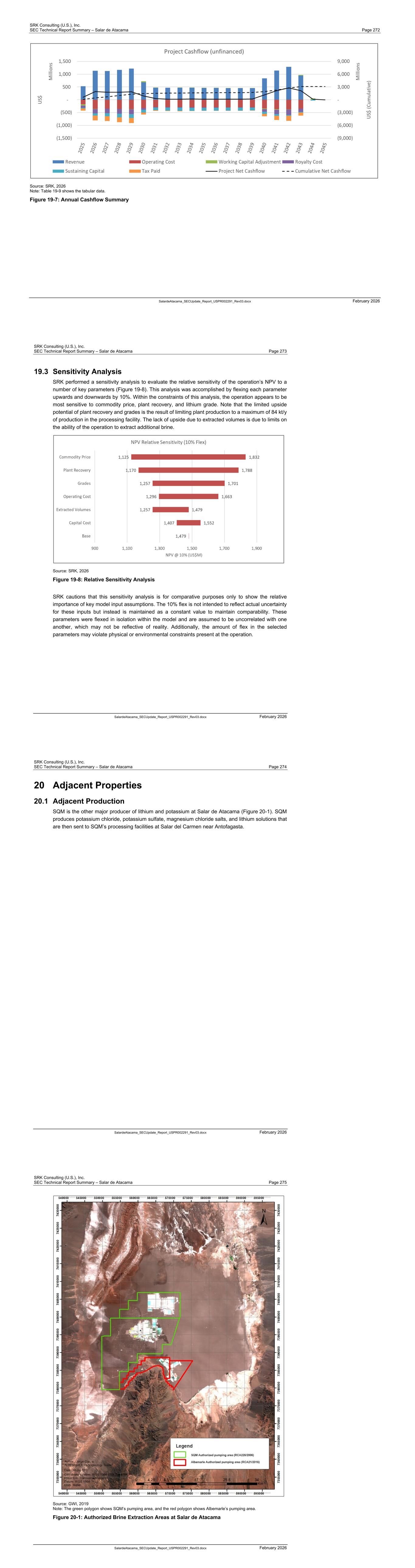 SRK Consulting (U.S.), Inc. SEC Technical Report Summary – Salar de Atacama Page 272 SalardeAtacama_SECUpdate_Report_USPR002291_Rev03.docx February 2026 Source: SRK, 2026 Note: Table 19-9 shows the tabular data. Figure 19-7: Annual Cashflow Summary SRK Consulting (U.S.), Inc. SEC Technical Report Summary – Salar de Atacama Page 273 SalardeAtacama_SECUpdate_Report_USPR002291_Rev03.docx February 2026 19.3 Sensitivity Analysis SRK performed a sensitivity analysis to evaluate the relative sensitivity of the operation’s NPV to a number of key parameters (Figure 19-8). This analysis was accomplished by flexing each parameter upwards and downwards by 10%. Within the constraints of this analysis, the operation appears to be most sensitive to commodity price, plant recovery, and lithium grade. Note that the limited upside potential of plant recovery and grades is the result of limiting plant production to a maximum of 84 kt/y of production in the processing facility. The lack of upside due to extracted volumes is due to limits on the ability of the operation to extract additional brine. Source: SRK, 2026 Figure 19-8: Relative Sensitivity Analysis SRK cautions that this sensitivity analysis is for comparative purposes only to show the relative importance of key model input assumptions. The 10% flex is not intended to reflect actual uncertainty for these inputs but instead is maintained as a constant value to maintain comparability. These parameters were flexed in isolation within the model and are assumed to be uncorrelated with one another, which may not be reflective of reality. Additionally, the amount of flex in the selected parameters may violate physical or environmental constraints present at the operation. SRK Consulting (U.S.), Inc. SEC Technical Report Summary – Salar de Atacama Page 274 SalardeAtacama_SECUpdate_Report_USPR002291_Rev03.docx February 2026 20 Adjacent Properties 20.1 Adjacent Production SQM is the other major producer of lithium and potassium at Salar de Atacama (Figure 20-1). SQM produces potassium chloride, potassium sulfate, magnesium chloride salts, and lithium solutions that are then sent to SQM’s processing facilities at Salar del Carmen near Antofagasta. SRK Consulting (U.S.), Inc. SEC Technical Report Summary – Salar de Atacama Page 275 SalardeAtacama_SECUpdate_Report_USPR002291_Rev03.docx February 2026 Source: GWI, 2019 Note: The green polygon shows SQM’s pumping area, and the red polygon shows Albemarle’s pumping area. Figure 20-1: Authorized Brine Extraction Areas at Salar de Atacama