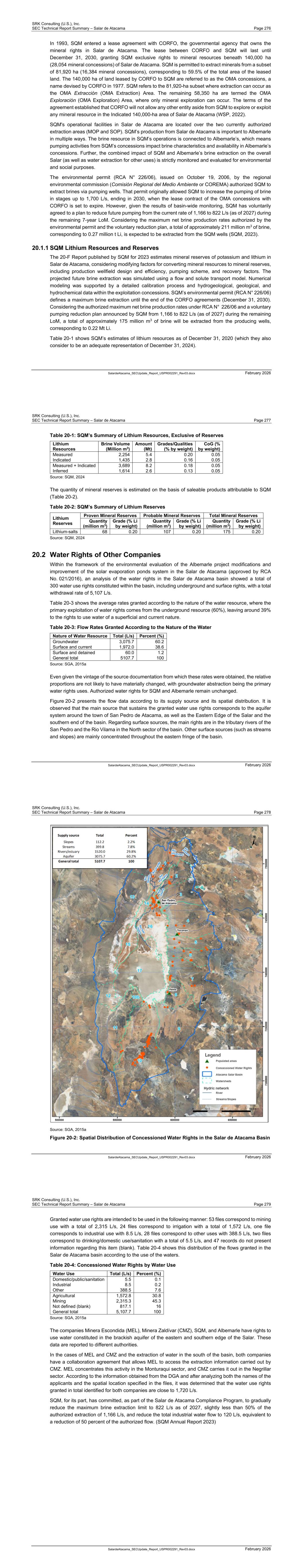 SRK Consulting (U.S.), Inc. SEC Technical Report Summary – Salar de Atacama Page 276 SalardeAtacama_SECUpdate_Report_USPR002291_Rev03.docx February 2026 In 1993, SQM entered a lease agreement with CORFO, the governmental agency that owns the mineral rights in Salar de Atacama. The lease between CORFO and SQM will last until December 31, 2030, granting SQM exclusive rights to mineral resources beneath 140,000 ha (28,054 mineral concessions) of Salar de Atacama. SQM is permitted to extract minerals from a subset of 81,920 ha (16,384 mineral concessions), corresponding to 59.5% of the total area of the leased land. The 140,000 ha of land leased by CORFO to SQM are referred to as the OMA concessions, a name devised by CORFO in 1977. SQM refers to the 81,920-ha subset where extraction can occur as the OMA Extracción (OMA Extraction) Area. The remaining 58,350 ha are termed the OMA Exploración (OMA Exploration) Area, where only mineral exploration can occur. The terms of the agreement established that CORFO will not allow any other entity aside from SQM to explore or exploit any mineral resource in the Indicated 140,000-ha area of Salar de Atacama (WSP, 2022). SQM's operational facilities in Salar de Atacama are located over the two currently authorized extraction areas (MOP and SOP). SQM’s production from Salar de Atacama is important to Albemarle in multiple ways. The brine resource in SQM’s operations is connected to Albemarle’s, which means pumping activities from SQM’s concessions impact brine characteristics and availability in Albemarle’s concessions. Further, the combined impact of SQM and Albemarle’s brine extraction on the overall Salar (as well as water extraction for other uses) is strictly monitored and evaluated for environmental and social purposes. The environmental permit (RCA N° 226/06), issued on October 19, 2006, by the regional environmental commission (Comisión Regional del Medio Ambiente or COREMA) authorized SQM to extract brines via pumping wells. That permit originally allowed SQM to increase the pumping of brine in stages up to 1,700 L/s, ending in 2030, when the lease contract of the OMA concessions with CORFO is set to expire. However, given the results of basin-wide monitoring, SQM has voluntarily agreed to a plan to reduce future pumping from the current rate of 1,166 to 822 L/s (as of 2027) during the remaining 7-year LoM. Considering the maximum net brine production rates authorized by the environmental permit and the voluntary reduction plan, a total of approximately 211 million m3 of brine, corresponding to 0.27 million t Li, is expected to be extracted from the SQM wells (SQM, 2023). 20.1.1 SQM Lithium Resources and Reserves The 20-F Report published by SQM for 2023 estimates mineral reserves of potassium and lithium in Salar de Atacama, considering modifying factors for converting mineral resources to mineral reserves, including production wellfield design and efficiency, pumping scheme, and recovery factors. The projected future brine extraction was simulated using a flow and solute transport model. Numerical modeling was supported by a detailed calibration process and hydrogeological, geological, and hydrochemical data within the exploitation concessions. SQM’s environmental permit (RCA N° 226/06) defines a maximum brine extraction until the end of the CORFO agreements (December 31, 2030). Considering the authorized maximum net brine production rates under RCA N° 226/06 and a voluntary pumping reduction plan announced by SQM from 1,166 to 822 L/s (as of 2027) during the remaining LoM, a total of approximately 175 million m3 of brine will be extracted from the producing wells, corresponding to 0.22 Mt Li. Table 20-1 shows SQM’s estimates of lithium resources as of December 31, 2020 (which they also consider to be an adequate representation of December 31, 2024). SRK Consulting (U.S.), Inc. SEC Technical Report Summary – Salar de Atacama Page 277 SalardeAtacama_SECUpdate_Report_USPR002291_Rev03.docx February 2026 Table 20-1: SQM’s Summary of Lithium Resources, Exclusive of Reserves Lithium Resources Brine Volume (Million m3) Amount (Mt) Grades/Qualities (% by weight) CoG (% by weight) Measured 2,254 5.4 0.20 0.05 Indicated 1,435 2.8 0.16 0.05 Measured + Indicated 3,689 8.2 0.18 0.05 Inferred 1,614 2.6 0.13 0.05 Source: SQM, 2024 The quantity of mineral reserves is estimated on the basis of saleable products attributable to SQM (Table 20-2). Table 20-2: SQM’s Summary of Lithium Reserves Lithium Reserves Proven Mineral Reserves Probable Mineral Reserves Total Mineral Reserves Quantity (million m3) Grade (% Li by weight) Quantity (million m3) Grade (% Li by weight) Quantity (million m3) Grade (% Li by weight) Lithium-salts 68 0.20 107 0.20 175 0.20 Source: SQM, 2024 20.2 Water Rights of Other Companies Within the framework of the environmental evaluation of the Albemarle project modifications and improvement of the solar evaporation ponds system in the Salar de Atacama (approved by RCA No. 021/2016), an analysis of the water rights in the Salar de Atacama basin showed a total of 300 water use rights constituted within the basin, including underground and surface rights, with a total withdrawal rate of 5,107 L/s. Table 20-3 shows the average rates granted according to the nature of the water resource, where the primary exploitation of water rights comes from the underground resource (60%), leaving around 39% to the rights to use water of a superficial and current nature. Table 20-3: Flow Rates Granted According to the Nature of the Water Nature of Water Resource Total (L/s) Percent (%) Groundwater 3,075.7 60.2 Surface and current 1,972.0 38.6 Surface and detained 60.0 1.2 General total 5107.7 100 Source: SGA, 2015a Even given the vintage of the source documentation from which these rates were obtained, the relative proportions are not likely to have materially changed, with groundwater abstraction being the primary water rights use