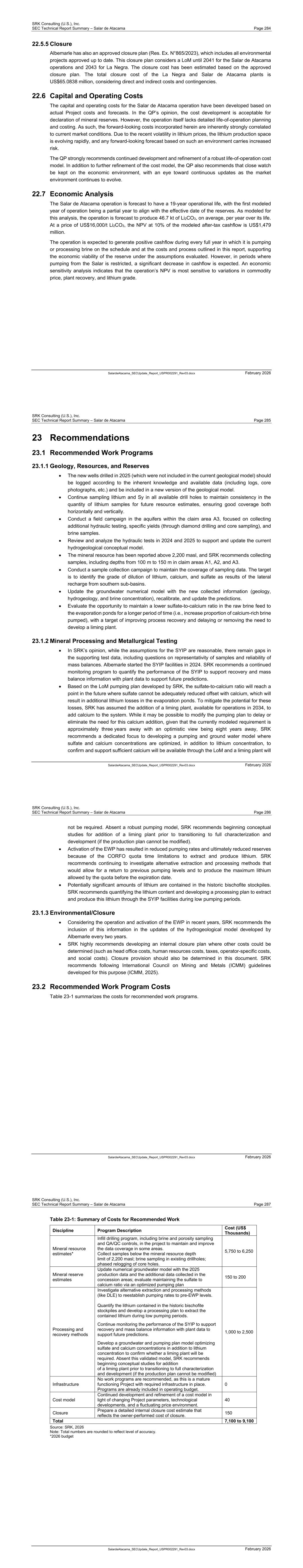 SRK Consulting (U.S.), Inc. SEC Technical Report Summary – Salar de Atacama Page 284 SalardeAtacama_SECUpdate_Report_USPR002291_Rev03.docx February 2026 22.5.5 Closure Albemarle has also an approved closure plan (Res. Ex. N°865/2023), which includes all environmental projects approved up to date. This closure plan considers a LoM until 2041 for the Salar de Atacama operations and 2043 for La Negra. The closure cost has been estimated based on the approved closure plan. The total closure cost of the La Negra and Salar de Atacama plants is US$65.0838 million, considering direct and indirect costs and contingencies. 22.6 Capital and Operating Costs The capital and operating costs for the Salar de Atacama operation have been developed based on actual Project costs and forecasts. In the QP’s opinion, the cost development is acceptable for declaration of mineral reserves. However, the operation itself lacks detailed life-of-operation planning and costing. As such, the forward-looking costs incorporated herein are inherently strongly correlated to current market conditions. Due to the recent volatility in lithium prices, the lithium production space is evolving rapidly, and any forward-looking forecast based on such an environment carries increased risk. The QP strongly recommends continued development and refinement of a robust life-of-operation cost model. In addition to further refinement of the cost model, the QP also recommends that close watch be kept on the economic environment, with an eye toward continuous updates as the market environment continues to evolve. 22.7 Economic Analysis The Salar de Atacama operation is forecast to have a 19-year operational life, with the first modeled year of operation being a partial year to align with the effective date of the reserves. As modeled for this analysis, the operation is forecast to produce 46.7 kt of Li2CO3, on average, per year over its life. At a price of US$16,000/t Li2CO3, the NPV at 10% of the modeled after-tax cashflow is US$1,479 million. The operation is expected to generate positive cashflow during every full year in which it is pumping or processing brine on the schedule and at the costs and process outlined in this report, supporting the economic viability of the reserve under the assumptions evaluated. However, in periods where pumping from the Salar is restricted, a significant decrease in cashflow is expected. An economic sensitivity analysis indicates that the operation’s NPV is most sensitive to variations in commodity price, plant recovery, and lithium grade. SRK Consulting (U.S.), Inc. SEC Technical Report Summary – Salar de Atacama Page 285 SalardeAtacama_SECUpdate_Report_USPR002291_Rev03.docx February 2026 23 Recommendations 23.1 Recommended Work Programs 23.1.1 Geology, Resources, and Reserves The new wells drilled in 2025 (which were not included in the current geological model) should be logged according to the inherent knowledge and available data (including logs, core photographs, etc.) and be included in a new version of the geological model. Continue sampling lithium and Sy in all available drill holes to maintain consistency in the quantity of lithium samples for future resource estimates, ensuring good coverage both horizontally and vertically. Conduct a field campaign in the aquifers within the claim area A3, focused on collecting additional hydraulic testing, specific yields (through diamond drilling and core sampling), and brine samples. Review and analyze the hydraulic tests in 2024 and 2025 to support and update the current hydrogeological conceptual model. The mineral resource has been reported above 2,200 masl, and SRK recommends collecting samples, including depths from 100 m to 150 m in claim areas A1, A2, and A3. Conduct a sample collection campaign to maintain the coverage of sampling data. The target is to identify the grade of dilution of lithium, calcium, and sulfate as results of the lateral recharge from southern sub-basins. Update the groundwater numerical model with the new collected information (geology, hydrogeology, and brine concentration), recalibrate, and update the predictions. Evaluate the opportunity to maintain a lower sulfate-to-calcium ratio in the raw brine feed to the evaporation ponds for a longer period of time (i.e., increase proportion of calcium-rich brine pumped), with a target of improving process recovery and delaying or removing the need to develop a liming plant. 23.1.2 Mineral Processing and Metallurgical Testing In SRK’s opinion, while the assumptions for the SYIP are reasonable, there remain gaps in the supporting test data, including questions on representativity of samples and reliability of mass balances. Albemarle started the SYIP facilities in 2024. SRK recommends a continued monitoring program to quantify the performance of the SYIP to support recovery and mass balance information with plant data to support future predictions. Based on the LoM pumping plan developed by SRK, the sulfate-to-calcium ratio will reach a point in the future where sulfate cannot be adequately reduced offset with calcium, which will result in additional lithium losses in the evaporation ponds. To mitigate the potential for these losses, SRK has assumed the addition of a liming plant, available for operations in 2034, to add calcium to the system. While it may be possible to modify the pumping plan to delay or eliminate the need for this calcium addition, given that the currently modeled requirement is approximately three years away with an optimistic view being eight years away, SRK recommends a dedicated focus to developing a pumping and ground water model where sulfate and calcium concentrations are optimized, in addition to lithium concentration, to confirm and support sufficient calcium will be available through the LoM and a liming plant will SRK Consulting (U.S.), Inc. SEC Technical Report Summary – Salar de Atacama Page 286 SalardeAtacama_SECUpdate_Report_USPR002291