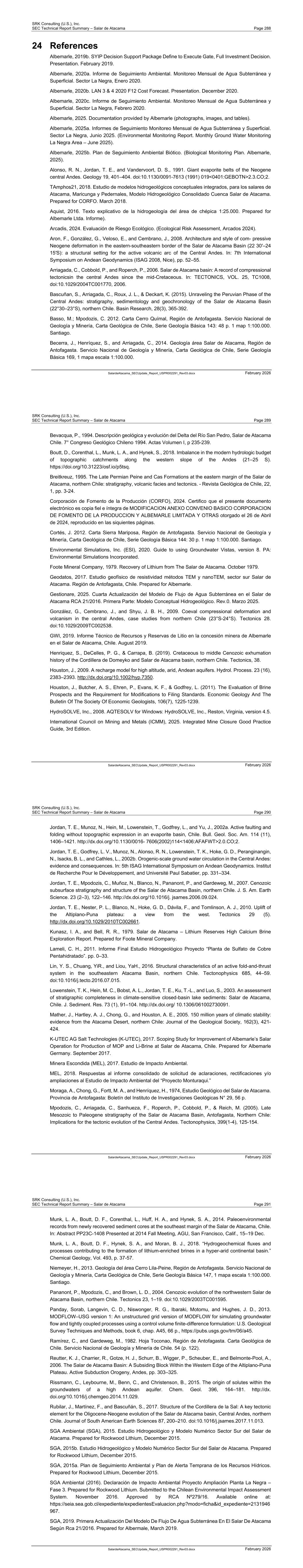 SRK Consulting (U.S.), Inc. SEC Technical Report Summary – Salar de Atacama Page 288 SalardeAtacama_SECUpdate_Report_USPR002291_Rev03.docx February 2026 24 References Albemarle, 2019b. SYIP Decision Support Package Define to Execute Gate, Full Investment Decision. Presentation. February 2019. Albemarle, 2020a. Informe de Seguimiento Ambiental. Monitoreo Mensual de Agua Subterránea y Superficial. Sector La Negra, Enero 2020. Albemarle, 2020b. LAN 3 & 4 2020 F12 Cost Forecast. Presentation. December 2020. Albemarle, 2020c. Informe de Seguimiento Ambiental. Monitoreo Mensual de Agua Subterránea y Superficial. Sector La Negra, Febrero 2020. Albemarle, 2025. Documentation provided by Albemarle (photographs, images, and tables). Albemarle, 2025a. Informes de Seguimiento Monitoreo Mensual de Agua Subterránea y Superficial. Sector La Negra, Junio 2025. (Environmental Monitoring Report. Monthly Ground Water Monitoring La Negra Area – June 2025). Albemarle, 2025b. Plan de Seguimiento Ambiental Biótico. (Biological Monitoring Plan. Albemarle, 2025). Alonso, R. N., Jordan, T. E., and Vandervoort, D. S., 1991. Giant evaporite belts of the Neogene central Andes. Geology 19, 401–404. doi:10.1130/0091-7613 (1991) 019<0401:GEBOTN>2.3.CO;2. TAmphos21, 2018. Estudio de modelos hidrogeológicos conceptuales integrados, para los salares de Atacama, Maricunga y Pedernales, Modelo Hidrogeológico Consolidado Cuenca Salar de Atacama. Prepared for CORFO. March 2018. Aquist, 2016. Texto explicativo de la hidrogeología del área de chépica 1:25.000. Prepared for Albemarle Ltda. Informe). Arcadis, 2024. Evaluación de Riesgo Ecológico. (Ecological Risk Assessment, Arcados 2024). Aron, F., González, G., Veloso, E., and Cembrano, J., 2008. Architecture and style of com- pressive Neogene deformation in the eastern-southeastern border of the Salar de Atacama Basin (22 30′–24 15′S): a structural setting for the active volcanic arc of the Central Andes. In: 7th International Symposium on Andean Geodynamics (ISAG 2008, Nice), pp. 52–55. Arriagada, C., Cobbold, P., and Roperch, P., 2006. Salar de Atacama basin: A record of compressional tectonicsin the central Andes since the mid-Cretaceous. In: TECTONICS, VOL. 25, TC1008, doi:10.1029/2004TC001770, 2006. Bascuñan, S., Arriagada, C., Roux, J. L., & Deckart, K. (2015). Unraveling the Peruvian Phase of the Central Andes: stratigraphy, sedimentology and geochronology of the Salar de Atacama Basin (22°30–23°S), northern Chile. Basin Research, 28(3), 365-392. Basso, M.; Mpodozis, C. 2012. Carta Cerro Químal, Región de Antofagasta. Servicio Nacional de Geología y Minería, Carta Geológica de Chile, Serie Geología Básica 143: 48 p. 1 map 1:100.000. Santiago. Becerra, J., Henríquez, S., and Arriagada, C., 2014. Geología área Salar de Atacama, Región de Antofagasta. Servicio Nacional de Geología y Minería, Carta Geológica de Chile, Serie Geología Básica 169, 1 mapa escala 1:100.000. SRK Consulting (U.S.), Inc. SEC Technical Report Summary – Salar de Atacama Page 289 SalardeAtacama_SECUpdate_Report_USPR002291_Rev03.docx February 2026 Bevacqua, P., 1994. Descripción geológica y evolución del Delta del Río San Pedro, Salar de Atacama Chile. 7° Congreso Geológico Chileno 1994. Actas Volumen I, p 235-239. Boutt, D., Corenthal, L., Munk, L. A., and Hynek, S., 2018. Imbalance in the modern hydrologic budget of topographic catchments along the western slope of the Andes (21–25 S). https://doi.org/10.31223/osf.io/p5tsq. Breitkreuz, 1995. The Late Permian Peine and Cas Formations at the eastern margin of the Salar de Atacama, northern Chile: stratigraphy, volcanic facies and tectonics. - Revista Geológica de Chile, 22, 1, pp. 3-24. Corporación de Fomento de la Producción (CORFO), 2024. Certifico que el presente documento electrónico es copia fiel e íntegra de MODIFICACION ANEXO CONVENIO BASICO CORPORACION DE FOMENTO DE LA PRODUCCION Y ALBEMARLE LIMITADA Y OTRAS otorgado el 26 de Abril de 2024, reproducido en las siquientes páginas. Cortés, J. 2012. Carta Sierra Mariposa, Región de Antofagasta. Servicio Nacional de Geología y Minería, Carta Geológica de Chile, Serie Geología Básica 144: 30 p. 1 map 1:100.000. Santiago. Environmental Simulations, Inc. (ESI), 2020. Guide to using Groundwater Vistas, version 8. PA: Environmental Simulations Incorporated. Foote Mineral Company, 1979. Recovery of Lithium from The Salar de Atacama. October 1979. Geodatos, 2017. Estudio geofísico de resistividad métodos TEM y nanoTEM, sector sur Salar de Atacama. Región de Antofagasta, Chile. Prepared for Albemarle. Gestionare, 2025. Cuarta Actualización del Modelo de Flujo de Agua Subterránea en el Salar de Atacama RCA 21/2016. Primera Parte: Modelo Conceptual Hidrogeológico. Rev.0. Marzo 2025. González, G., Cembrano, J., and Shyu, J. B. H., 2009. Coeval compressional deformation and volcanism in the central Andes, case studies from northern Chile (23°S-24°S). Tectonics 28. doi:10.1029/2009TC002538. GWI, 2019. Informe Técnico de Recursos y Reservas de Litio en la concesión minera de Albemarle en el Salar de Atacama, Chile. August 2019. Henriquez, S., DeCelles, P. G., & Carrapa, B. (2019). Cretaceous to middle Cenozoic exhumation history of the Cordillera de Domeyko and Salar de Atacama basin, northern Chile. Tectonics, 38. Houston, J., 2009. A recharge model for high altitude, arid, Andean aquifers. Hydrol. Process. 23 (16), 2383–2393. http://dx.doi.org/10.1002/hyp.7350. Houston, J., Butcher, A. S., Ehren, P., Evans, K. F., & Godfrey, L. (2011). The Evaluation of Brine Prospects and the Requirement for Modifications to Filing Standards. Economic Geology And The Bulletin Of The Society Of Economic Geologists, 106(7), 1225-1239. HydroSOLVE, Inc., 2008. AQTESOLV for Windows: HydroSOLVE, Inc., Reston, Virginia, version 4.5. International Council on Mining and Metals (ICMM), 2025. Integrated Mine Closure Good Practice Guide, 3rd Edition. SRK Co