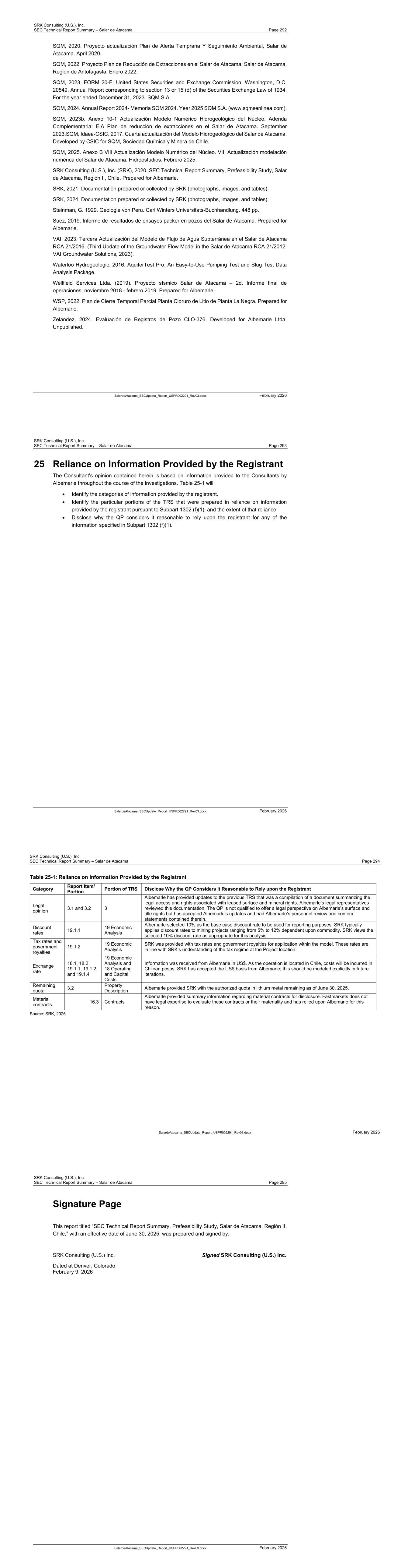 SRK Consulting (U.S.), Inc. SEC Technical Report Summary – Salar de Atacama Page 292 SalardeAtacama_SECUpdate_Report_USPR002291_Rev03.docx February 2026 SQM, 2020. Proyecto actualización Plan de Alerta Temprana Y Seguimiento Ambiental, Salar de Atacama. April 2020. SQM, 2022. Proyecto Plan de Reducción de Extracciones en el Salar de Atacama, Salar de Atacama, Región de Antofagasta, Enero 2022. SQM, 2023. FORM 20-F: United States Securities and Exchange Commission. Washington, D.C. 20549. Annual Report corresponding to section 13 or 15 (d) of the Securities Exchange Law of 1934. For the year ended December 31, 2023. SQM S.A. SQM, 2024. Annual Report 2024- Memoria SQM 2024. Year 2025 SQM S.A. (www.sqmsenlinea.com). SQM, 2023b. Anexo 10-1 Actualización Modelo Numérico Hidrogeológico del Núcleo. Adenda Complementaria: EIA Plan de reducción de extracciones en el Salar de Atacama. September 2023.SQM, Idaea-CSIC, 2017. Cuarta actualización del Modelo Hidrogeológico del Salar de Atacama. Developed by CSIC for SQM, Sociedad Química y Minera de Chile. SQM, 2025. Anexo B VIII Actualización Modelo Numérico del Núcleo. VIII Actualización modelación numérica del Salar de Atacama. Hidroestudios. Febrero 2025. SRK Consulting (U.S.), Inc. (SRK), 2020. SEC Technical Report Summary, Prefeasibility Study, Salar de Atacama, Región II, Chile. Prepared for Albemarle. SRK, 2021. Documentation prepared or collected by SRK (photographs, images, and tables). SRK, 2024. Documentation prepared or collected by SRK (photographs, images, and tables). Steinman, G. 1929. Geologie von Peru. Carl Winters Universitats-Buchhandlung. 448 pp. Suez, 2019. Informe de resultados de ensayos packer en pozos del Salar de Atacama. Prepared for Albemarle. VAI, 2023. Tercera Actualización del Modelo de Flujo de Agua Subterránea en el Salar de Atacama RCA 21/2016. (Third Update of the Groundwater Flow Model in the Salar de Atacama RCA 21/2012. VAI Groundwater Solutions, 2023). Waterloo Hydrogeologic, 2016. AquiferTest Pro, An Easy-to-Use Pumping Test and Slug Test Data Analysis Package. Wellfield Services Ltda. (2019). Proyecto sísmico Salar de Atacama – 2d. Informe final de operaciones, noviembre 2018 - febrero 2019. Prepared for Albemarle. WSP, 2022. Plan de Cierre Temporal Parcial Planta Cloruro de Litio de Planta La Negra. Prepared for Albemarle. Zelandez, 2024. Evaluación de Registros de Pozo CLO-376. Developed for Albemarle Ltda. Unpublished. SRK Consulting (U.S.), Inc. SEC Technical Report Summary – Salar de Atacama Page 293 SalardeAtacama_SECUpdate_Report_USPR002291_Rev03.docx February 2026 25 Reliance on Information Provided by the Registrant The Consultant’s opinion contained herein is based on information provided to the Consultants by Albemarle throughout the course of the investigations. Table 25-1 will: Identify the categories of information provided by the registrant. Identify the particular portions of the TRS that were prepared in reliance on information provided by the registrant pursuant to Subpart 1302 (f)(1), and the extent of that reliance. Disclose why the QP considers it reasonable to rely upon the registrant for any of the information specified in Subpart 1302 (f)(1). SRK Consulting (U.S.), Inc. SEC Technical Report Summary – Salar de Atacama Page 294 SalardeAtacama_SECUpdate_Report_USPR002291_Rev03.docx February 2026 Table 25-1: Reliance on Information Provided by the Registrant Category Report Item/ Portion Portion of TRS Disclose Why the QP Considers It Reasonable to Rely upon the Registrant Legal opinion 3.1 and 3.2 3 Albemarle has provided updates to the previous TRS that was a compilation of a document summarizing the legal access and rights associated with leased surface and mineral rights. Albemarle’s legal representatives reviewed this documentation. The QP is not qualified to offer a legal perspective on Albemarle’s surface and title rights but has accepted Albemarle’s updates and had Albemarle’s personnel review and confirm statements contained therein. Discount rates 19.1.1 19 Economic Analysis Albemarle selected 10% as the base case discount rate to be used for reporting purposes. SRK typically applies discount rates to mining projects ranging from 5% to 12% dependent upon commodity. SRK views the selected 10% discount rate as appropriate for this analysis. Tax rates and government royalties 19.1.2 19 Economic Analysis SRK was provided with tax rates and government royalties for application within the model. These rates are in line with SRK’s understanding of the tax regime at the Project location. Exchange rate 18.1, 18.2 19.1.1, 19.1.2, and 19.1.4 19 Economic Analysis and 18 Operating and Capital Costs Information was received from Albemarle in US$. As the operation is located in Chile, costs will be incurred in Chilean pesos. SRK has accepted the US$ basis from Albemarle; this should be modeled explicitly in future iterations. Remaining quota 3.2 Property Description Albemarle provided SRK with the authorized quota in lithium metal remaining as of June 30, 2025. Material contracts 16.3 Contracts Albemarle provided summary information regarding material contracts for disclosure. Fastmarkets does not have legal expertise to evaluate these contracts or their materiality and has relied upon Albemarle for this reason. Source: SRK, 2026 SRK Consulting (U.S.), Inc. SEC Technical Report Summary – Salar de Atacama Page 295 SalardeAtacama_SECUpdate_Report_USPR002291_Rev03.docx February 2026 Signature Page This report titled “SEC Technical Report Summary, Prefeasibility Study, Salar de Atacama, Región II, Chile,” with an effective date of June 30, 2025, was prepared and signed by: Signed SRK Consulting (U.S.) Inc. SRK Consulting (U.S.) Inc. Dated at Denver, Colorado February 9, 2026