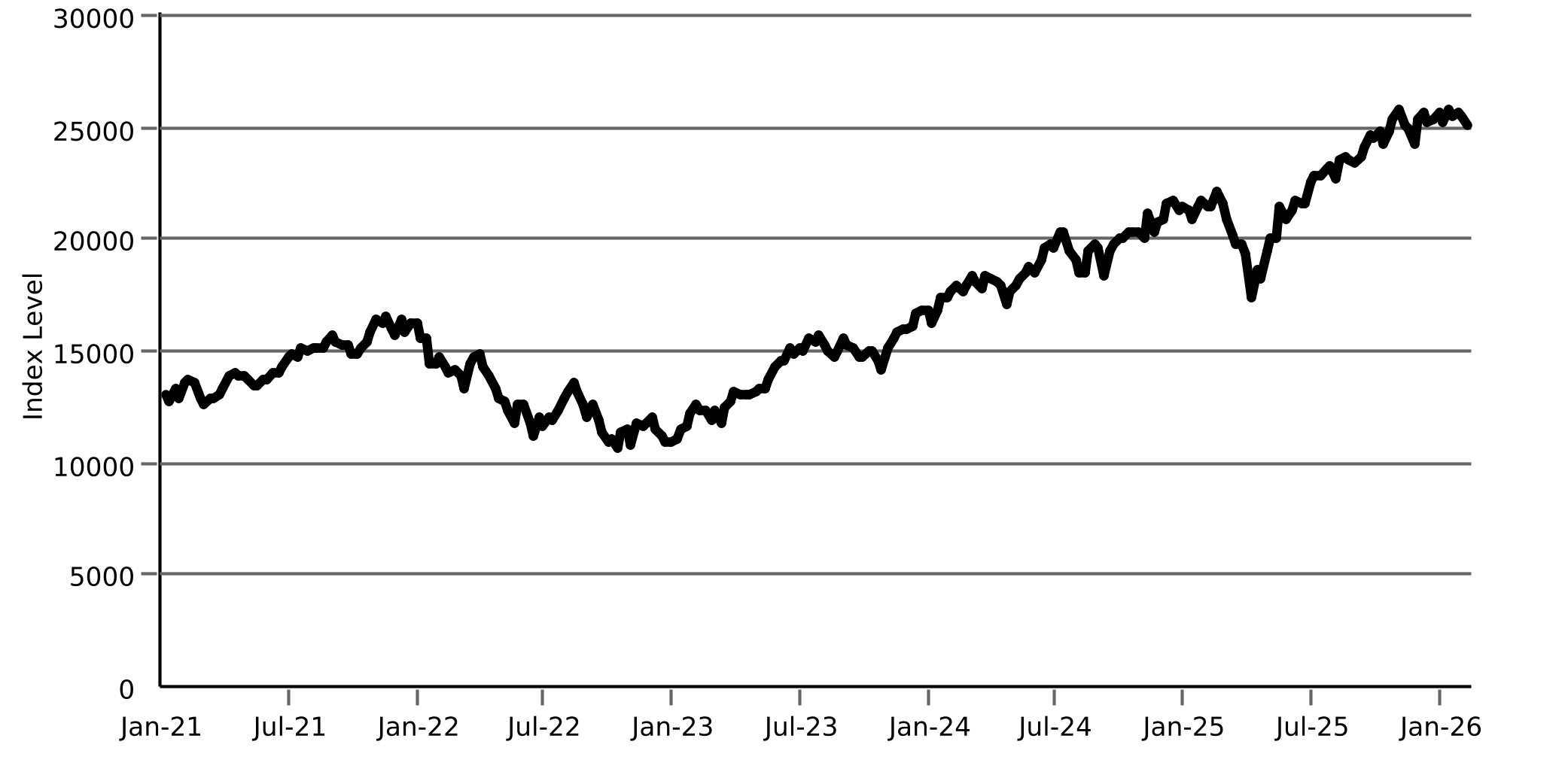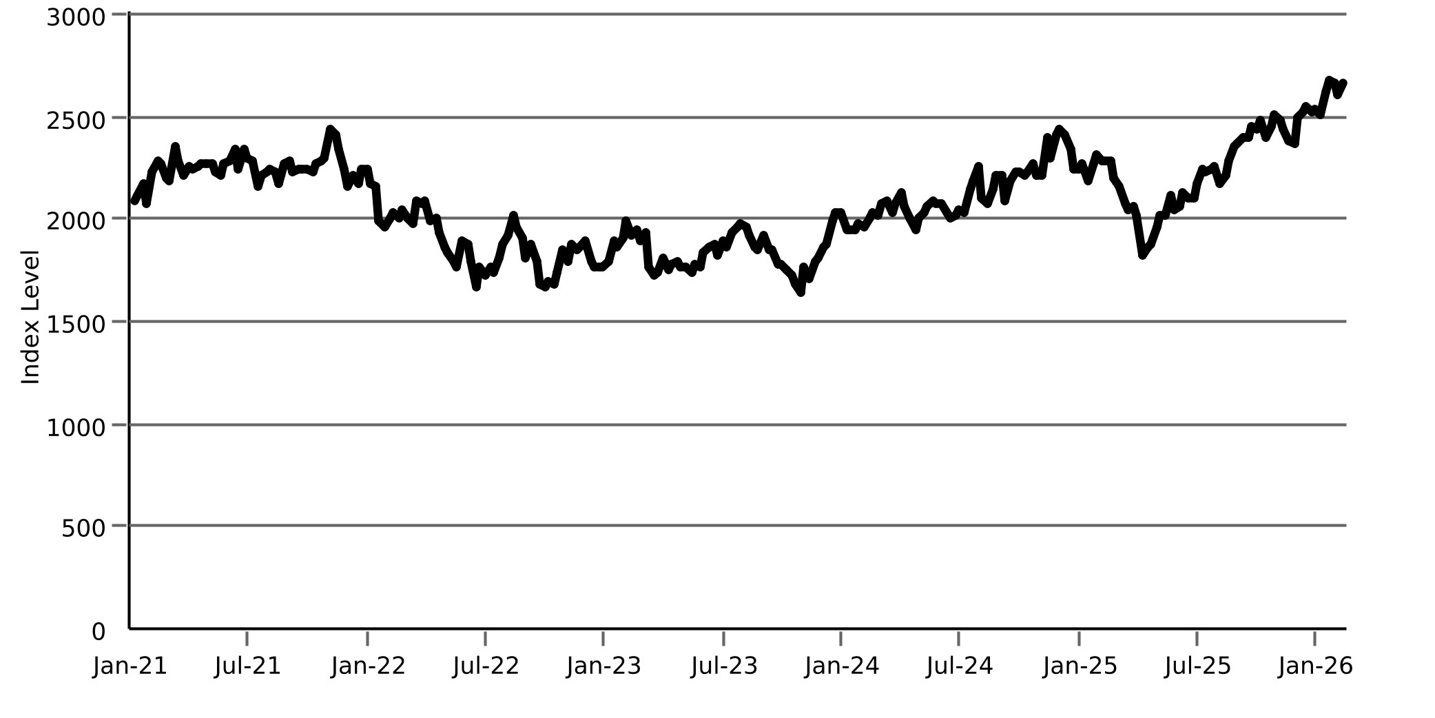 The following graphs set forth the historical performance of each Index based on the weekly historical closing levels from January 8, 2021 through February 6, 2026. The closing level of the Nasdaq-100 Index® on February 9, 2026 was 25,268.14. The closing level of the Russell 2000® Index on February 9, 2026 was 2,689.046. The closing level of the S&P 500® Index on February 9, 2026 was 6,964.82. We obtained the closing levels above and below from the Bloomberg Professional® service (“Bloomberg”), without independent verification.