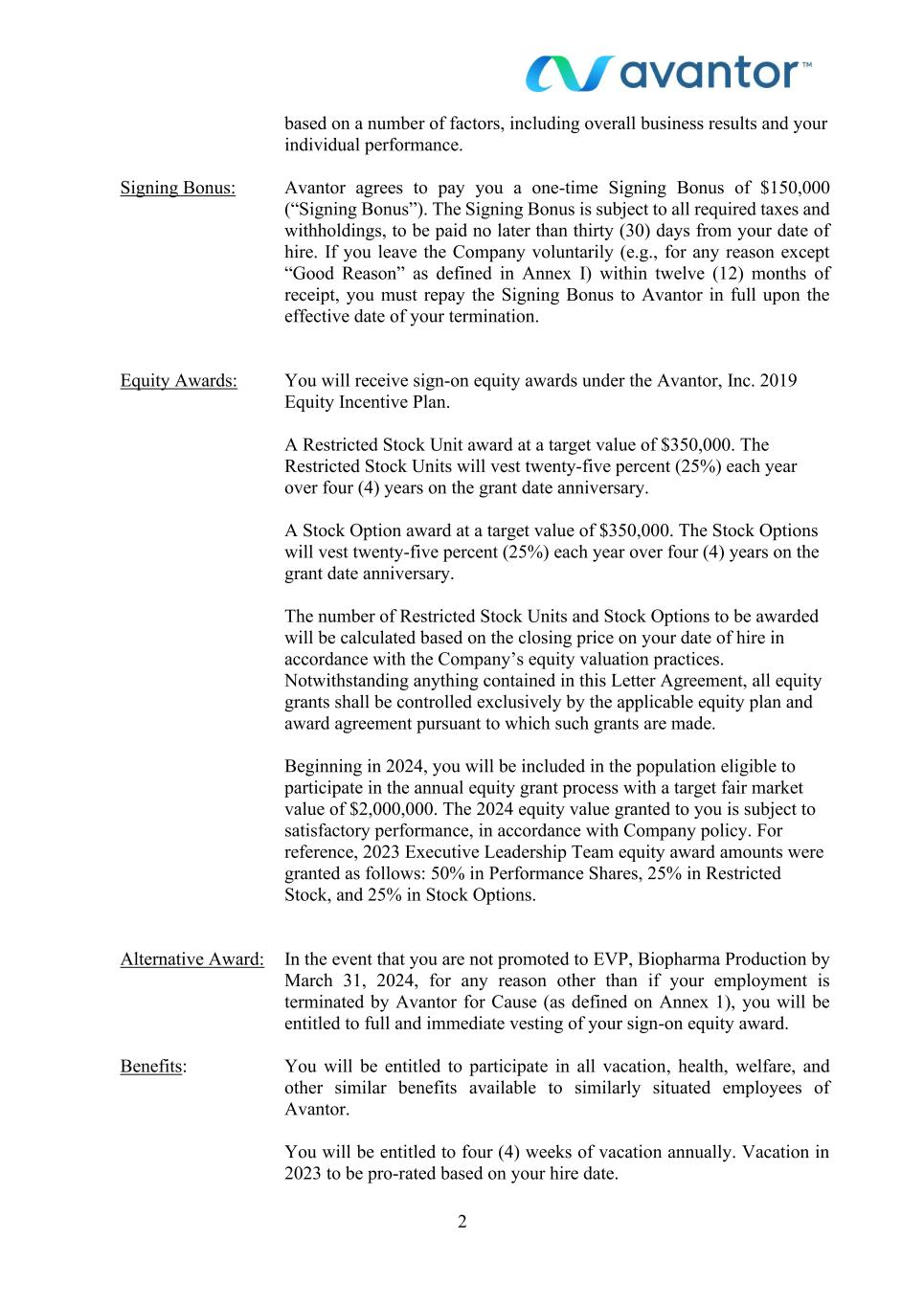 2 based on a number of factors, including overall business results and your individual performance. Signing Bonus: Equity Awards: Avantor agrees to pay you a one-time Signing Bonus of $150,000 (“Signing Bonus”). The Signing Bonus is subject to all required taxes and withholdings, to be paid no later than thirty (30) days from your date of hire. If you leave the Company voluntarily (e.g., for any reason except “Good Reason” as defined in Annex I) within twelve (12) months of receipt, you must repay the Signing Bonus to Avantor in full upon the effective date of your termination. You will receive sign-on equity awards under the Avantor, Inc. 2019 Equity Incentive Plan. A Restricted Stock Unit award at a target value of $350,000. The Restricted Stock Units will vest twenty-five percent (25%) each year over four (4) years on the grant date anniversary. A Stock Option award at a target value of $350,000. The Stock Options will vest twenty-five percent (25%) each year over four (4) years on the grant date anniversary. The number of Restricted Stock Units and Stock Options to be awarded will be calculated based on the closing price on your date of hire in accordance with the Company’s equity valuation practices. Notwithstanding anything contained in this Letter Agreement, all equity grants shall be controlled exclusively by the applicable equity plan and award agreement pursuant to which such grants are made. Beginning in 2024, you will be included in the population eligible to participate in the annual equity grant process with a target fair market value of $2,000,000. The 2024 equity value granted to you is subject to satisfactory performance, in accordance with Company policy. For reference, 2023 Executive Leadership Team equity award amounts were granted as follows: 50% in Performance Shares, 25% in Restricted Stock, and 25% in Stock Options. Alternative Award: In the event that you are not promoted to EVP, Biopharma Production by March 31, 2024, for any reason other than if your employment is terminated by Avantor for Cause (as defined on Annex 1), you will be entitled to full and immediate vesting of your sign-on equity award. Benefits: You will be entitled to participate in all vacation, health, welfare, and other similar benefits available to similarly situated employees of Avantor. You will be entitled to four (4) weeks of vacation annually. Vacation in 2023 to be pro-rated based on your hire date.