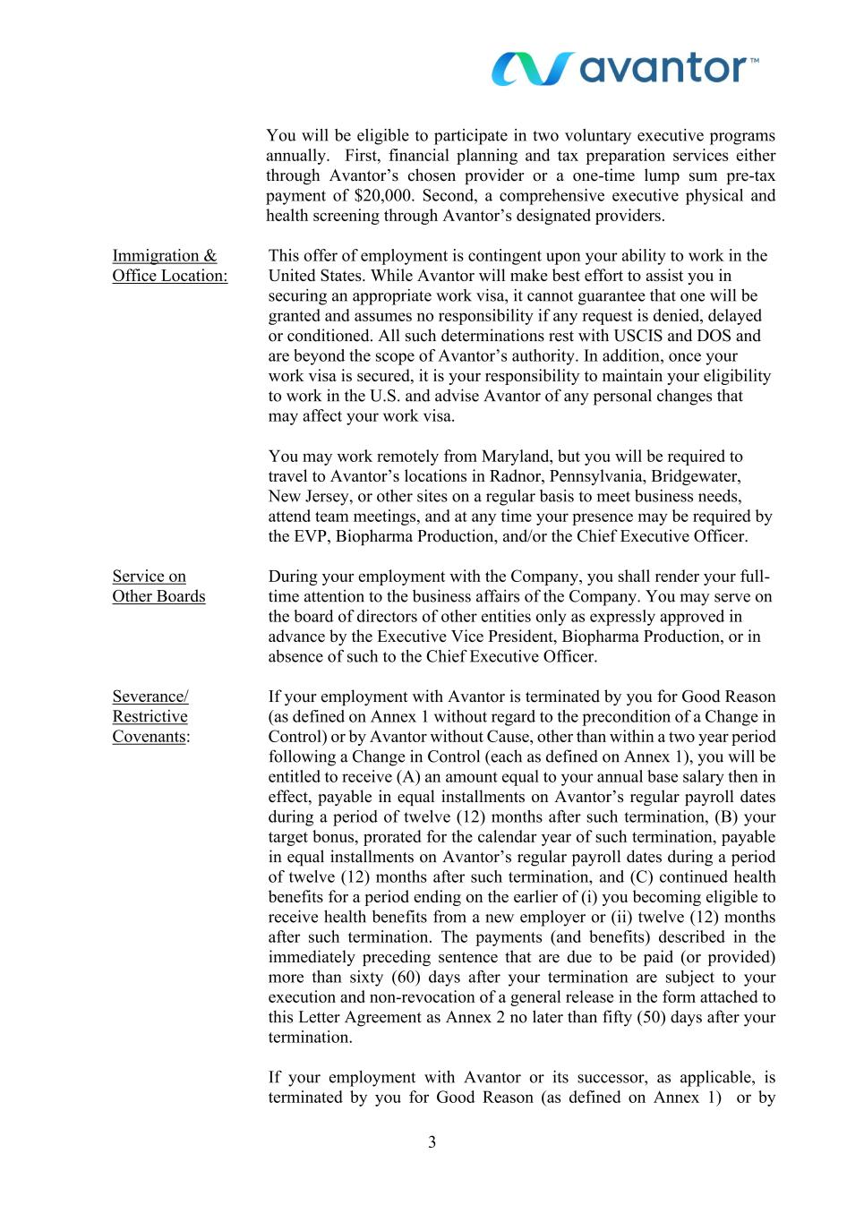 3 You will be eligible to participate in two voluntary executive programs annually. First, financial planning and tax preparation services either through Avantor’s chosen provider or a one-time lump sum pre-tax payment of $20,000. Second, a comprehensive executive physical and health screening through Avantor’s designated providers. Immigration & Office Location: Service on Other Boards Severance/ Restrictive Covenants: This offer of employment is contingent upon your ability to work in the United States. While Avantor will make best effort to assist you in securing an appropriate work visa, it cannot guarantee that one will be granted and assumes no responsibility if any request is denied, delayed or conditioned. All such determinations rest with USCIS and DOS and are beyond the scope of Avantor’s authority. In addition, once your work visa is secured, it is your responsibility to maintain your eligibility to work in the U.S. and advise Avantor of any personal changes that may affect your work visa. You may work remotely from Maryland, but you will be required to travel to Avantor’s locations in Radnor, Pennsylvania, Bridgewater, New Jersey, or other sites on a regular basis to meet business needs, attend team meetings, and at any time your presence may be required by the EVP, Biopharma Production, and/or the Chief Executive Officer. During your employment with the Company, you shall render your full- time attention to the business affairs of the Company. You may serve on the board of directors of other entities only as expressly approved in advance by the Executive Vice President, Biopharma Production, or in absence of such to the Chief Executive Officer. If your employment with Avantor is terminated by you for Good Reason (as defined on Annex 1 without regard to the precondition of a Change in Control) or by Avantor without Cause, other than within a two year period following a Change in Control (each as defined on Annex 1), you will be entitled to receive (A) an amount equal to your annual base salary then in effect, payable in equal installments on Avantor’s regular payroll dates during a period of twelve (12) months after such termination, (B) your target bonus, prorated for the calendar year of such termination, payable in equal installments on Avantor’s regular payroll dates during a period of twelve (12) months after such termination, and (C) continued health benefits for a period ending on the earlier of (i) you becoming eligible to receive health benefits from a new employer or (ii) twelve (12) months after such termination. The payments (and benefits) described in the immediately preceding sentence that are due to be paid (or provided) more than sixty (60) days after your termination are subject to your execution and non-revocation of a general release in the form attached to this Letter Agreement as Annex 2 no later than fifty (50) days after your termination. If your employment with Avantor or its successor, as applicable, is terminated by you for Good Reason (as defined on Annex 1) or by