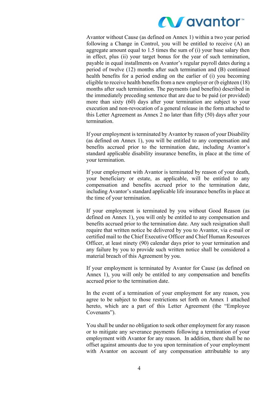 4 Avantor without Cause (as defined on Annex 1) within a two year period following a Change in Control, you will be entitled to receive (A) an aggregate amount equal to 1.5 times the sum of (i) your base salary then in effect, plus (ii) your target bonus for the year of such termination, payable in equal installments on Avantor’s regular payroll dates during a period of twelve (12) months after such termination and (B) continued health benefits for a period ending on the earlier of (i) you becoming eligible to receive health benefits from a new employer or (b eighteen (18) months after such termination. The payments (and benefits) described in the immediately preceding sentence that are due to be paid (or provided) more than sixty (60) days after your termination are subject to your execution and non-revocation of a general release in the form attached to this Letter Agreement as Annex 2 no later than fifty (50) days after your termination. If your employment is terminated by Avantor by reason of your Disability (as defined on Annex 1), you will be entitled to any compensation and benefits accrued prior to the termination date, including Avantor’s standard applicable disability insurance benefits, in place at the time of your termination. If your employment with Avantor is terminated by reason of your death, your beneficiary or estate, as applicable, will be entitled to any compensation and benefits accrued prior to the termination date, including Avantor’s standard applicable life insurance benefits in place at the time of your termination. If your employment is terminated by you without Good Reason (as defined on Annex 1), you will only be entitled to any compensation and benefits accrued prior to the termination date. Any such resignation shall require that written notice be delivered by you to Avantor, via e-mail or certified mail to the Chief Executive Officer and Chief Human Resources Officer, at least ninety (90) calendar days prior to your termination and any failure by you to provide such written notice shall be considered a material breach of this Agreement by you. If your employment is terminated by Avantor for Cause (as defined on Annex 1), you will only be entitled to any compensation and benefits accrued prior to the termination date. In the event of a termination of your employment for any reason, you agree to be subject to those restrictions set forth on Annex 1 attached hereto, which are a part of this Letter Agreement (the “Employee Covenants”). You shall be under no obligation to seek other employment for any reason or to mitigate any severance payments following a termination of your employment with Avantor for any reason. In addition, there shall be no offset against amounts due to you upon termination of your employment with Avantor on account of any compensation attributable to any